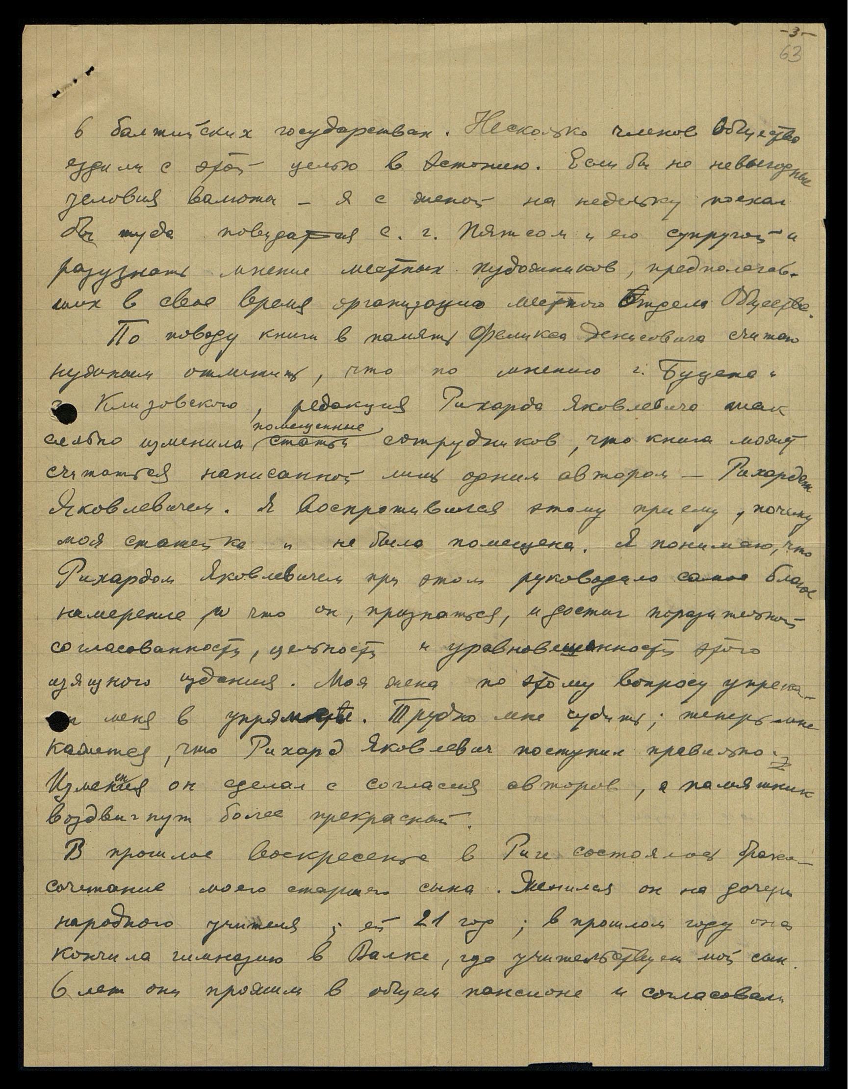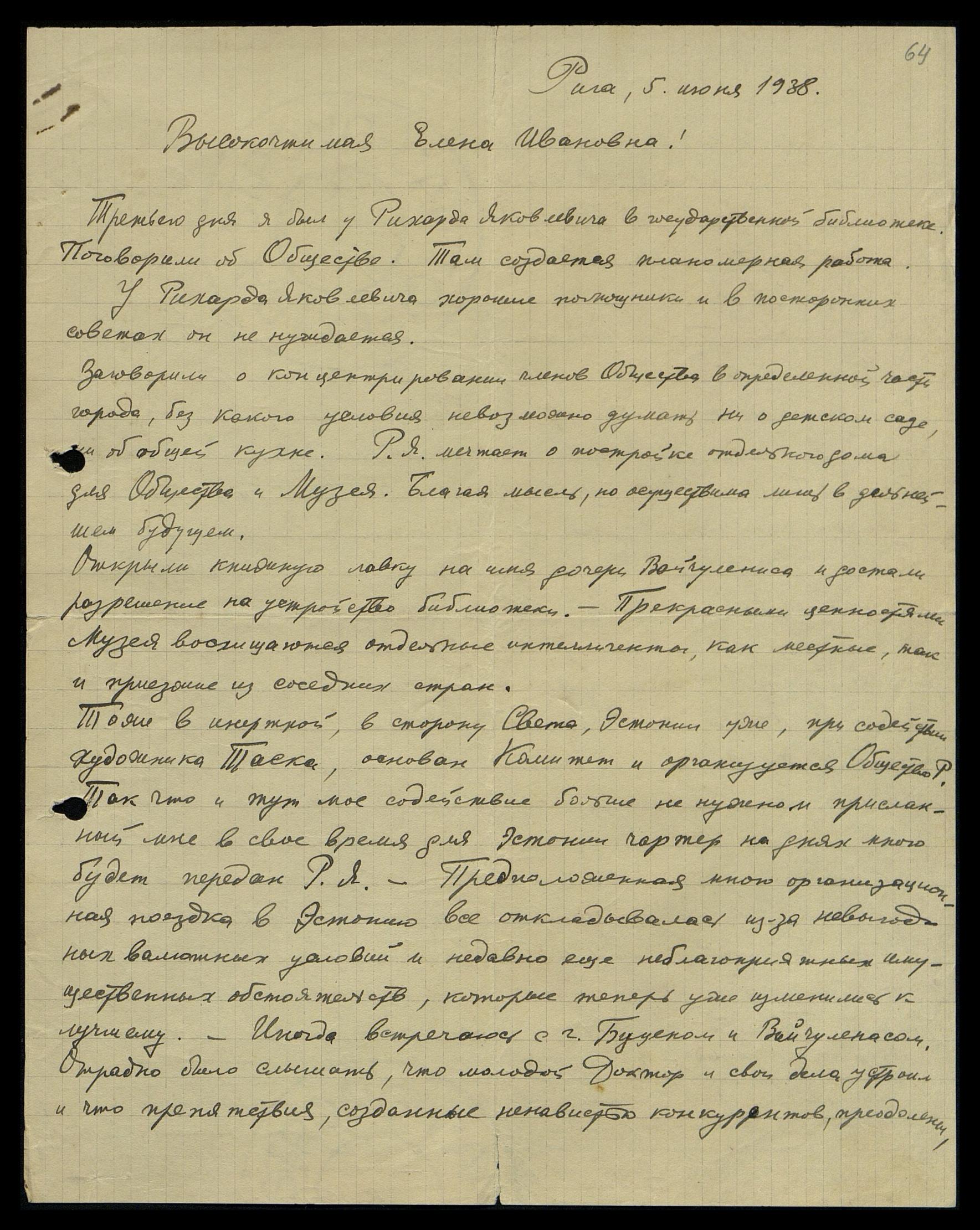 Третьего дня я был у Рихарда Яковлевича [Рудзитиса] в государственной библиотеке. Поговорили об Обществе. Там создаётся плановая работа. У Рихарда Яковлевича хорошие помощники, и в посторонних советах он не нуждается.