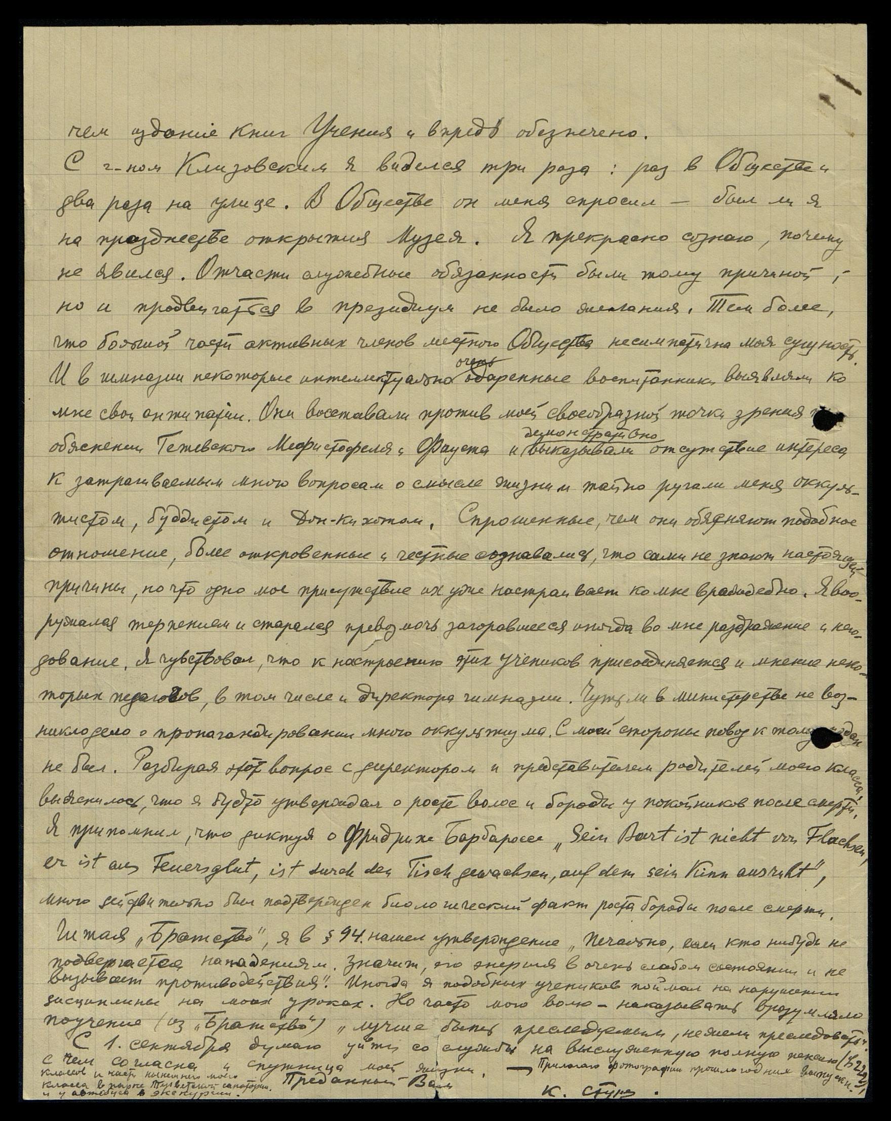 С г-ном Клизовским я виделся три раза: раз в Обществе и два раза на улице. В Обществе он меня спросил, был ли я на праздненстве открытия Музея. Я прекрасно осознаю, почему не явился. Отчасти служебные обязанности были тому причиной, но и продвигаться в Президиум не было желания. Тем более, что большой части активных членов местного Общества несимпатична моя сущность. И в гимназии некоторые интеллектуально очень одарённые воспитанники выявили ко мне свои антипатии. Они восставали против моей своеобразной точки зрения при объяснении Гётевского Мефистофеля и Фауста и демонстративно выказывали отсутствие интереса к затрагиваемым мною вопросам о смысле жизни, тайно ругали меня оккультистом, буддистом и Дон-Кихотом. Спрошенные, чем они объясняют подобное отношение, более откровенные и честные сознавались, что сами не знают настоящей причины, но что одно моё присутствие их уже настраивает ко мне враждебно. Я вооружался терпением и старался превозмочь загоравшееся иногда во мне раздражение и негодование. Я чувствовал, что к настроению этих учеников присоединяется и мнение некоторых педагогов, в том числе и директора гимназии. Чуть ли в министерстве не возникло дело о пропагандировании мною оккультизма. С моей стороны повод к тому создан не был. Разбирая этот вопрос с директором и представителем родителей моего класса, выяснилось, что я будто утверждал о росте волос и бороды у покойников после смерти. Я припомнил, что диктуя о Фридрихе Барбаросе "Sein Bart ist nicht von Flachse; er ist von Feuersglut, ist durch den Tisch gewachsen, worauf sein Kinn ausruht"*, мною действительно был подтверждён биологический факт роста бороды после смерти.