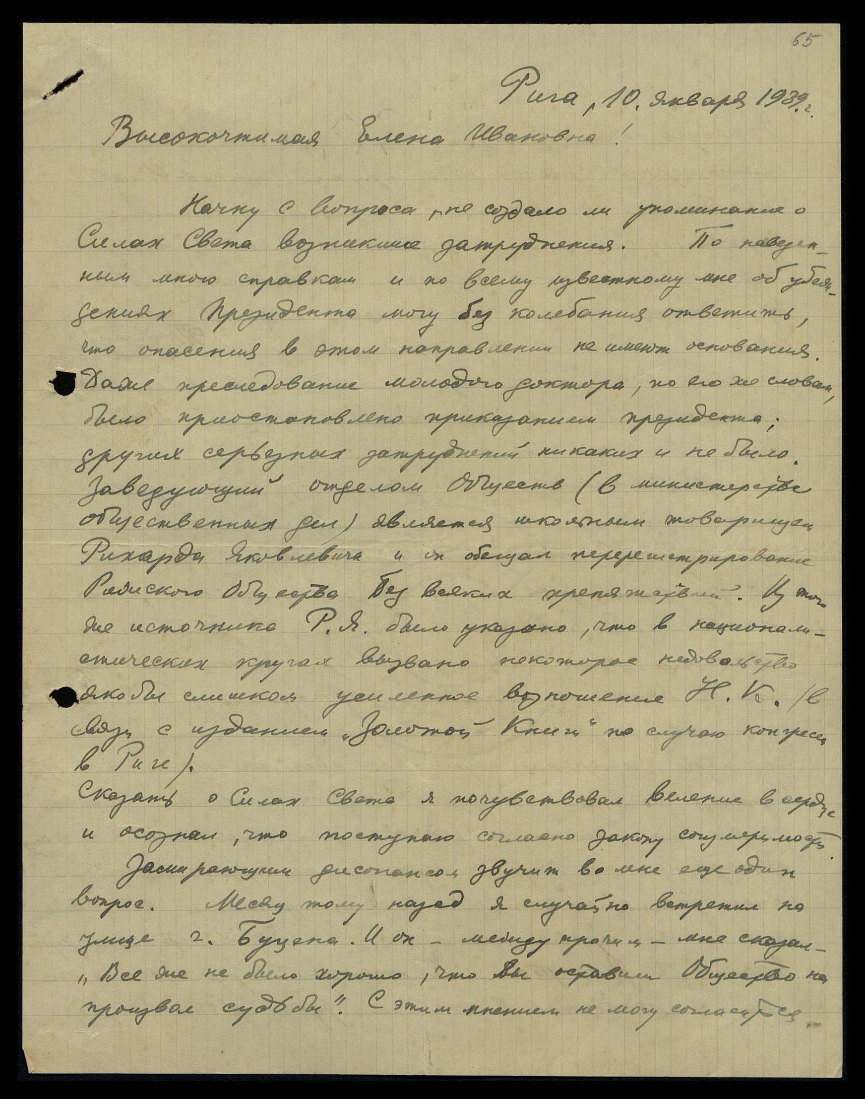 Начну с вопроса: не создало ли упоминание о Силах Света возникшие затруднения? По наведённым мною справкам и по всему известному мне об убеждениях Президента, могу без колебания ответить, что опасения в этом направлении не имеют основания. Даже преследование молодого доктора, по его же словам, было приостановлено приказанием президента; других серьёзных затруднений никаких и не было. Заведующий отделом Обществ (в министерстве общественных дел) является школьным товарищем Рихарда Яковлевича [Рудзитиса], и он обещал перерегистрирование Рижского Общества без всяких препятствий. Из этого же источника Рихарду Яковлевичу было указано, что в националистических кругах вызвано некоторое недовольство якобы слишком усиленное возношение Н.К. (в связи с изданием "Золотой книги" по случаю конгресса в Риге).