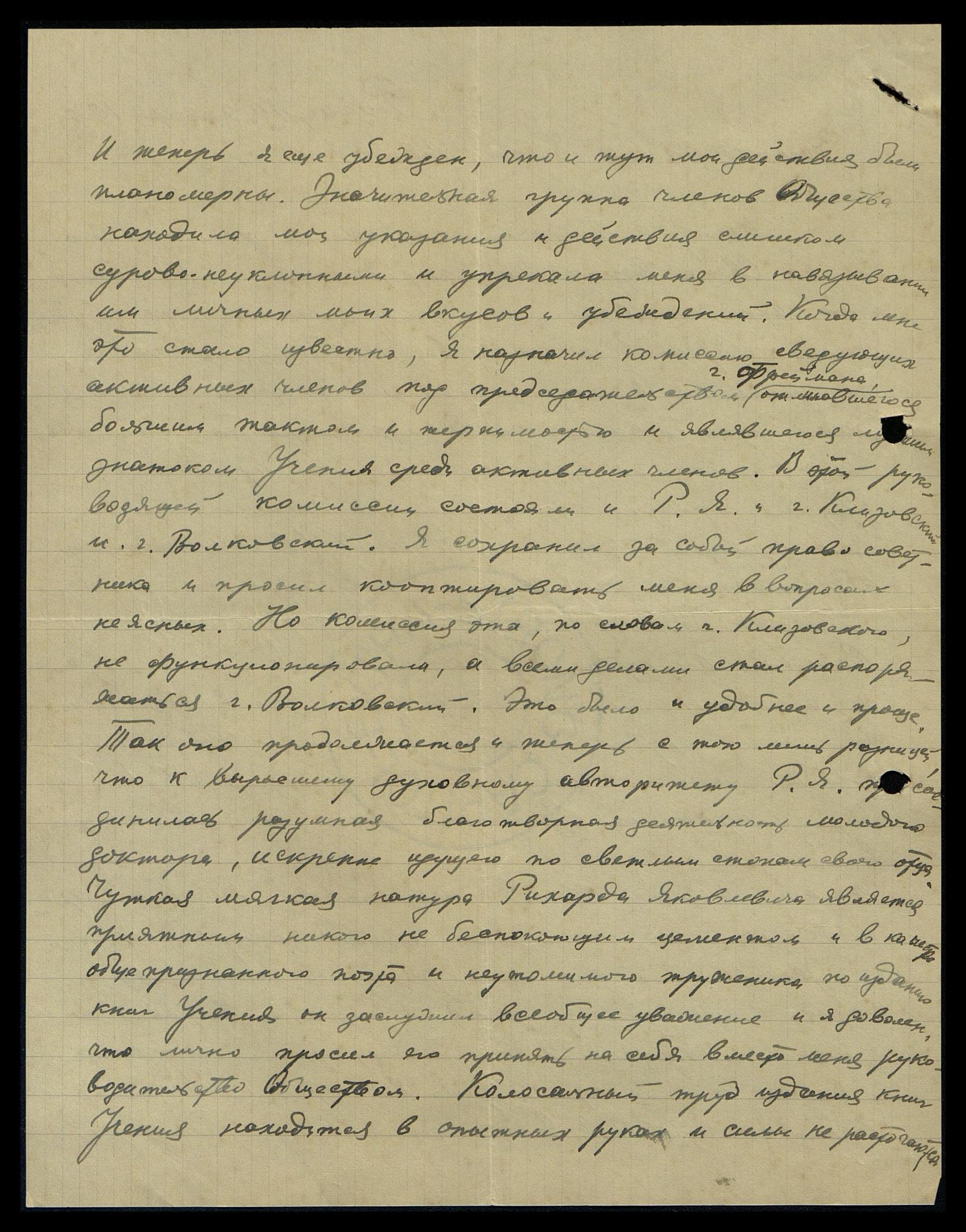 И теперь я ещё убеждён, что и тут мои действия были планомерны. Значительная группа членов Общества находила мои указания и действия слишком сурово-неуклонными и упрекала меня в навязывании им личных моих вкусов и убеждений. Когда мне это стало известно, я назначил комиссию сведущих активных членов под председательством г. Фреймана, отличавшегося большим тактом и терпимостью, и являвшегося лучшим знатоком Учения среди активных членов. В этой руководящей комиссии состояли и Рихард Яковлевич [Рудзитис], и г. Клизовский, и г. Волковский. Я сохранил за собой право советника и просил кооптировать меня в вопросах неясных. Но комиссия эта, по словам г. Клизовского, не функционировала, а всеми делами стал распоряжаться г. Волковский. Это было и удобнее, и проще. Так оно продолжается и теперь с той лишь разницей, что к выросшему духовному авторитету Рихарда Яковлевича присоединилась разумная благотворная деятельность молодого доктора, искренне идущего по светлым стопам своего отца. Чуткая, мягкая натура Рихарда Яковлевича является приятным, никого не беспокоящим цементом, и в качестве общепризнанного поэта и неутомимого труженика по изданию книг Учения он заслужил всеобщее уважение, и я доволен, что лично просил его принять на себя вместо меня руководительство Обществом. Колоссальный труд издания книг Учения находится в опытных руках, и силы не расточаются
