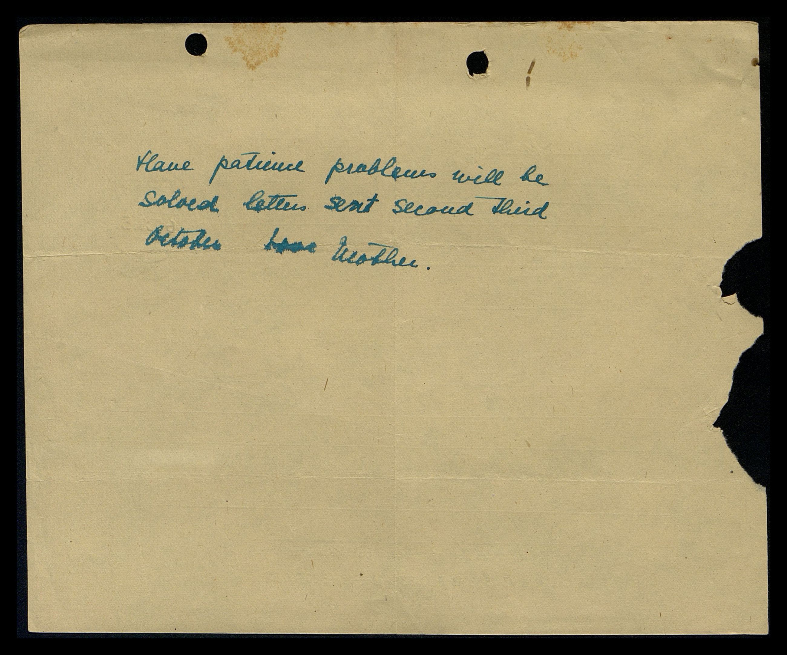 [англ.: Потерпите − проблемы будут решены − письма отправлены второго, третьего октября − С любовью, Мать.]