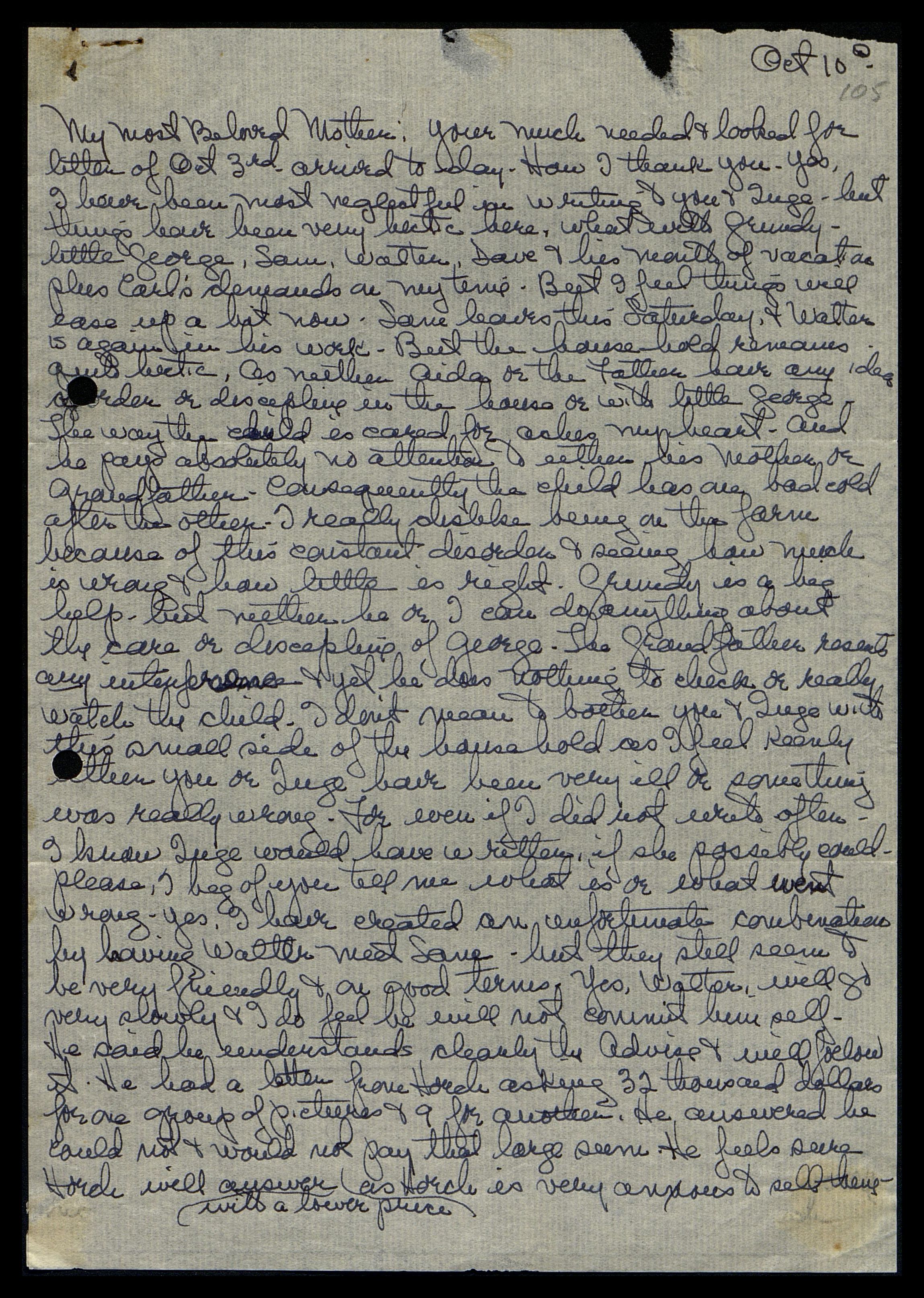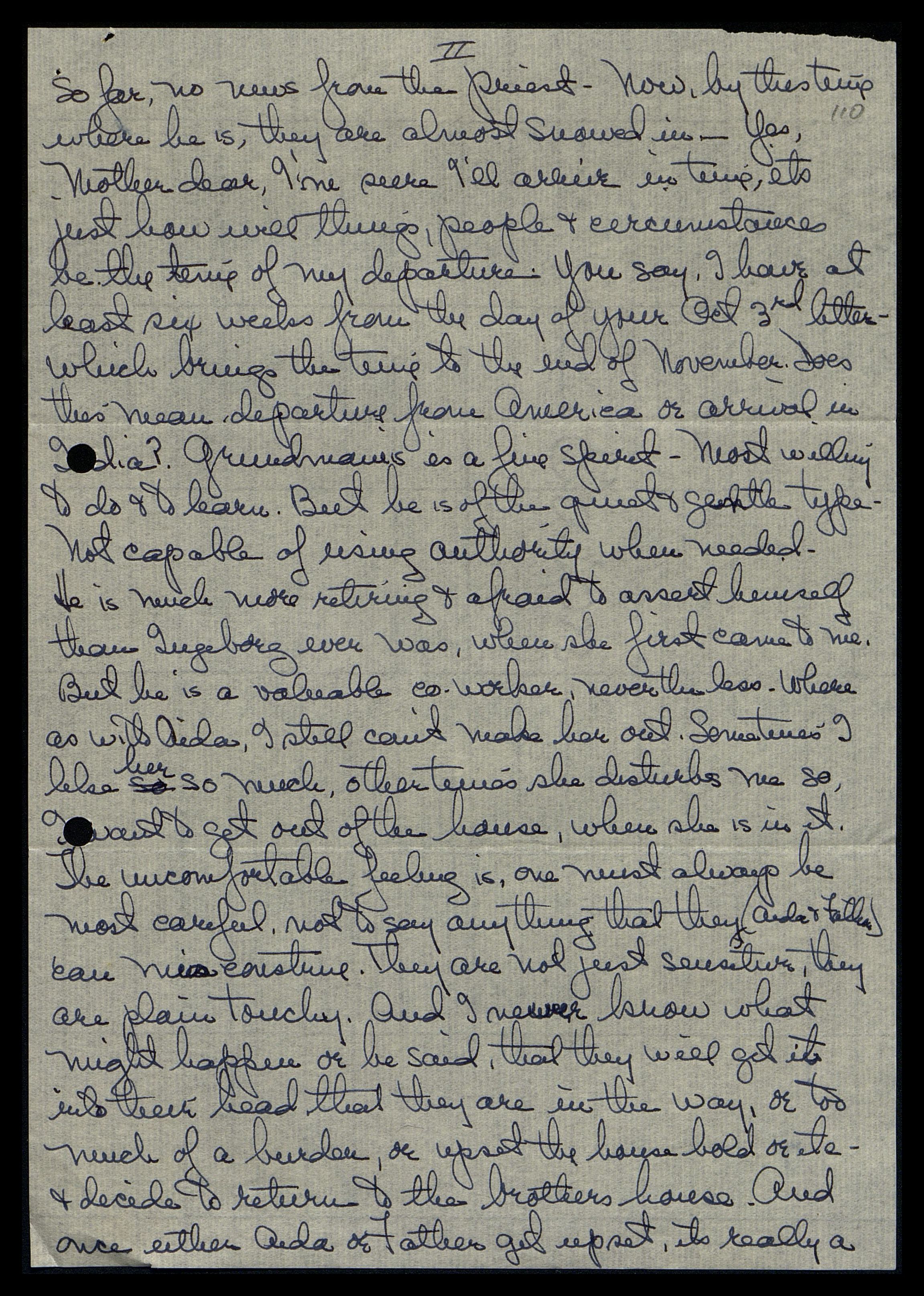 Yes, Mother dear, I’m sure I’ll arrive in time; it’s just how will things, people, and circumstances be [at] the time of my departure. You say [that] I have at least six weeks from the day of your October 3 letter, which brings the time to the end of November.