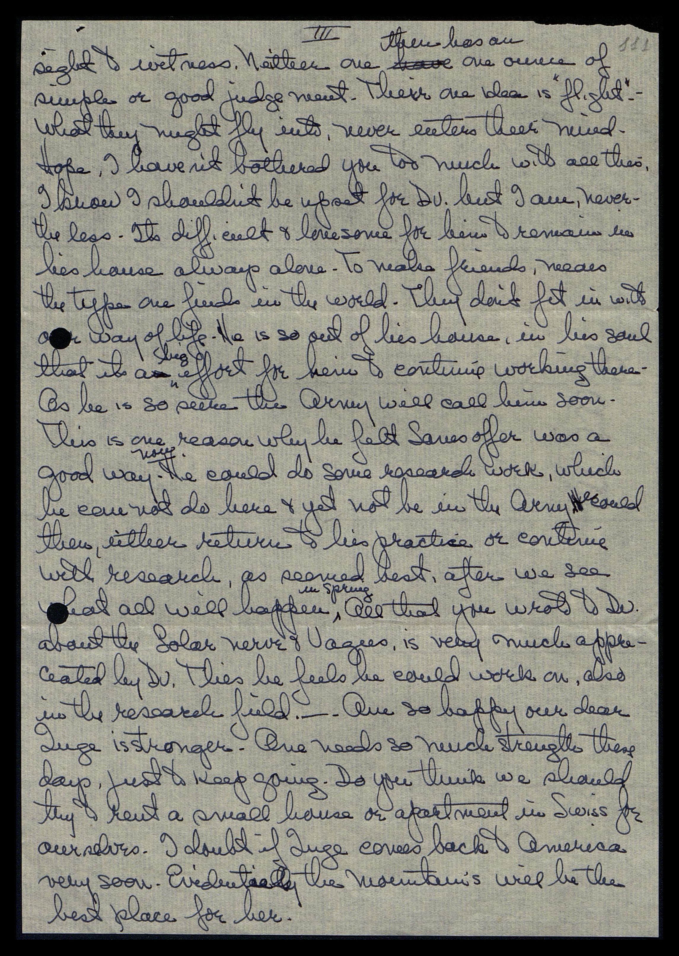 Am so happy our dear Inge is stronger. One needs so much strength these days just to keep going. Do you think we should try to rent a small house or apartment in Swi[tzerland] for ourselves? I doubt if Inge comes back to America very soon. Evidently, the mountains will be the best place for her.