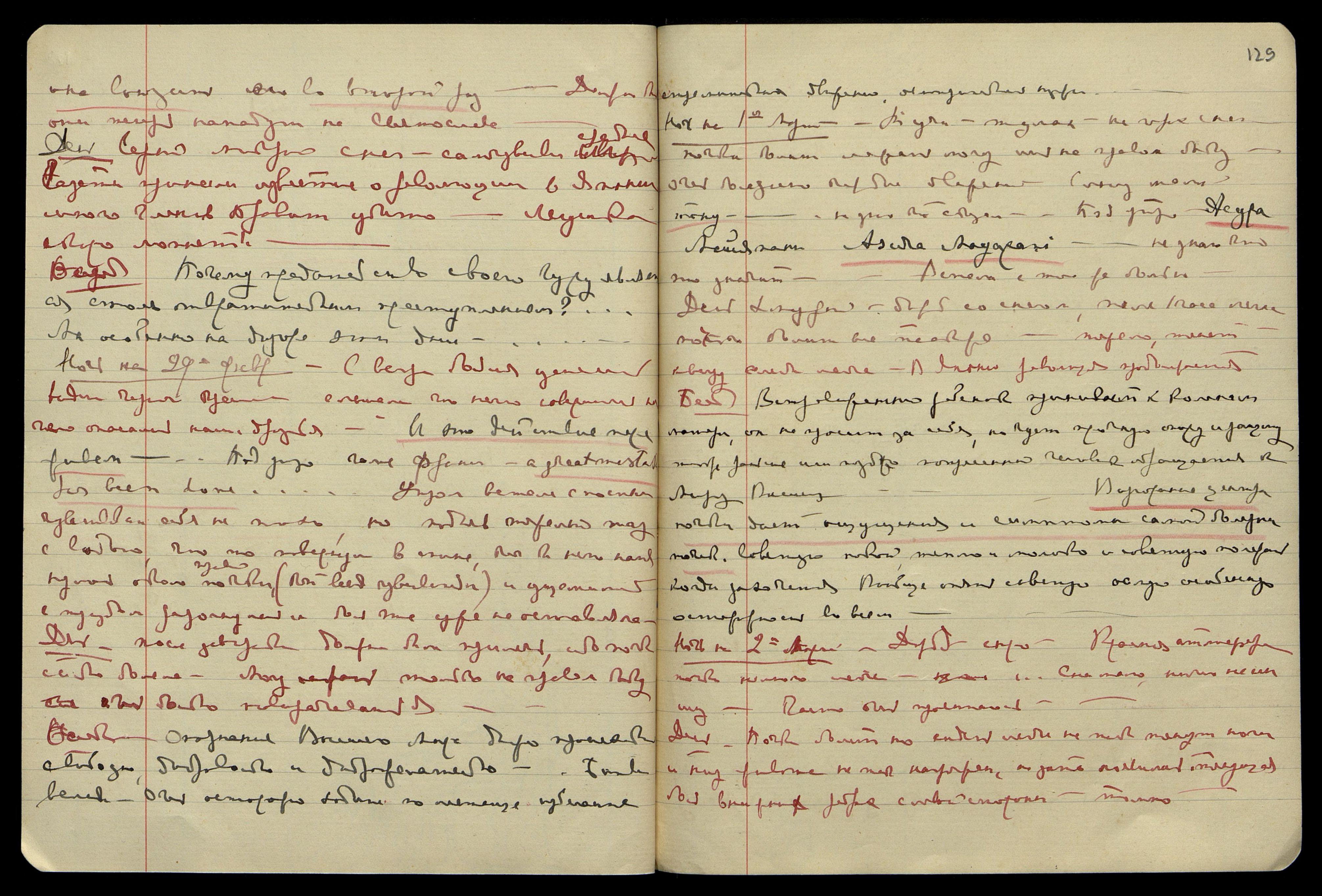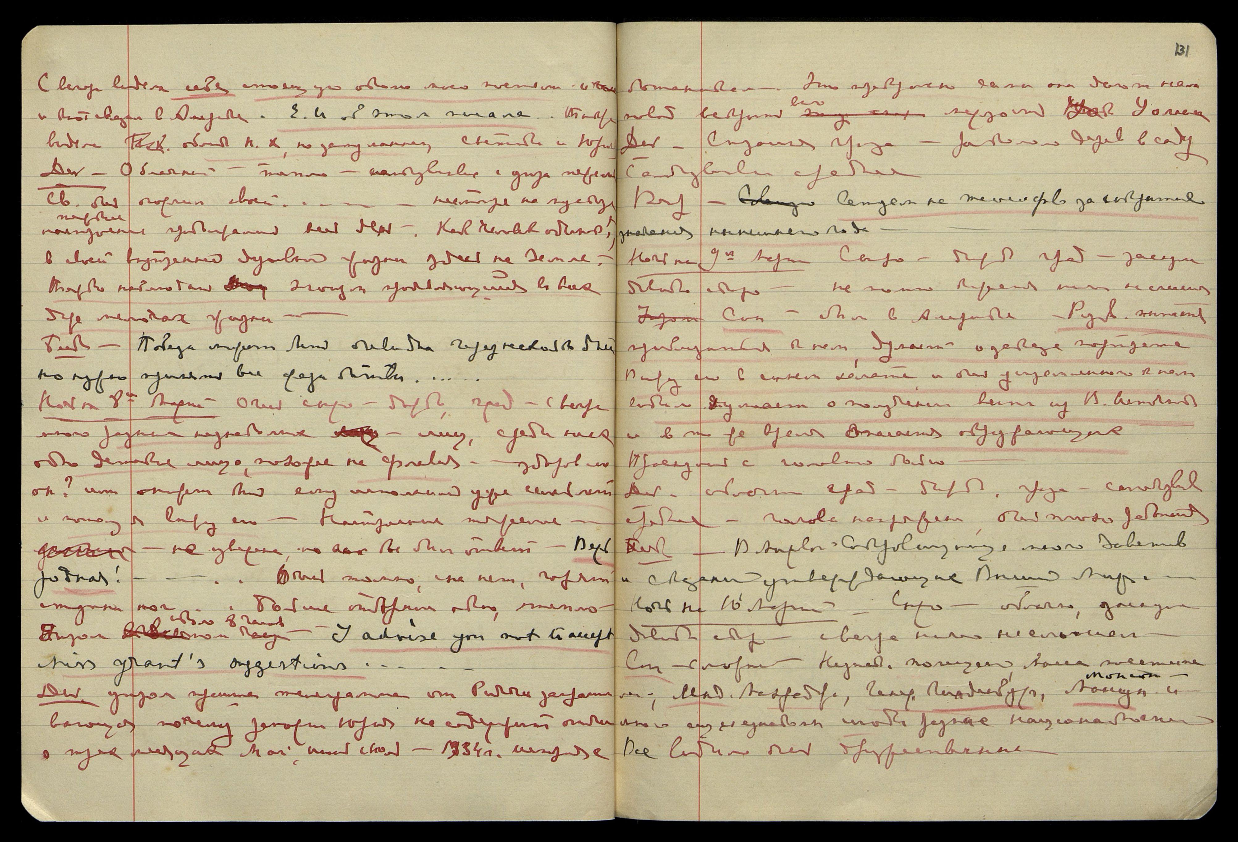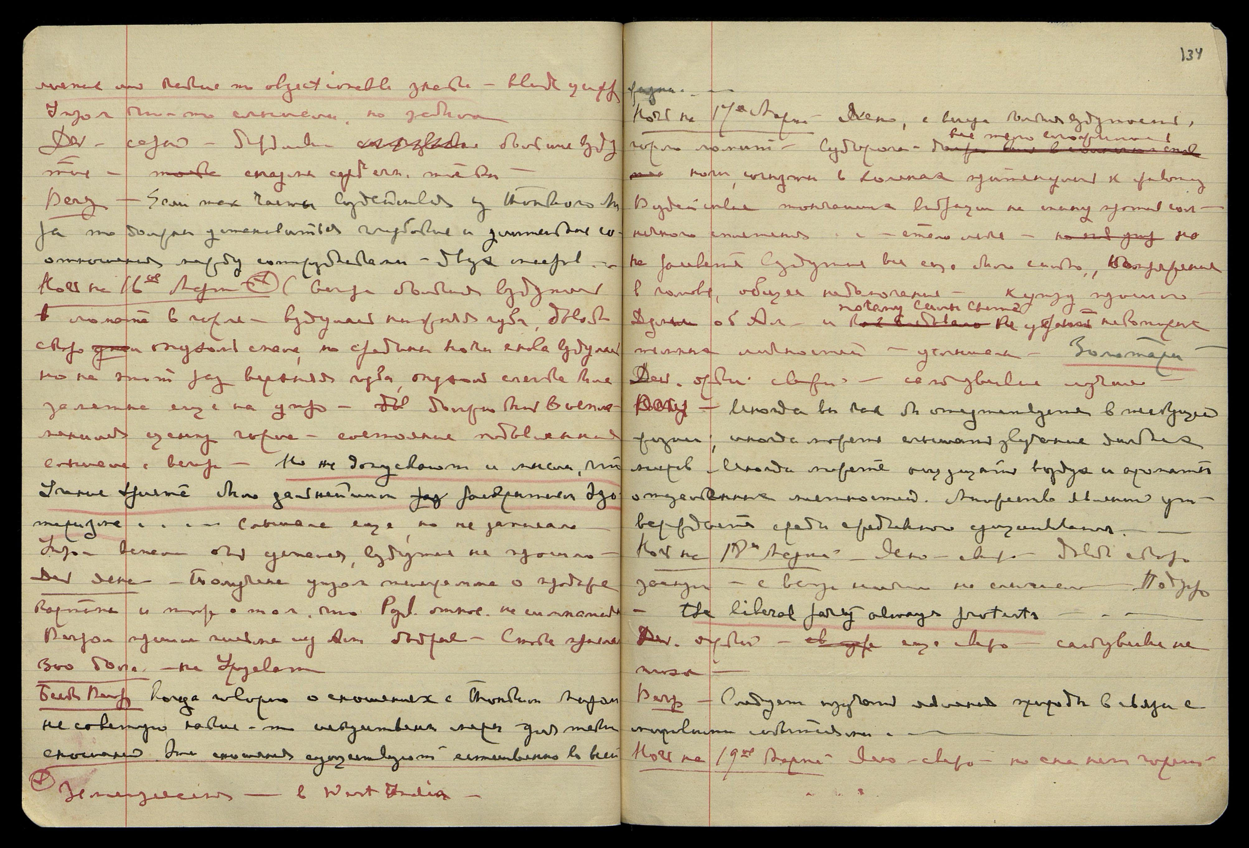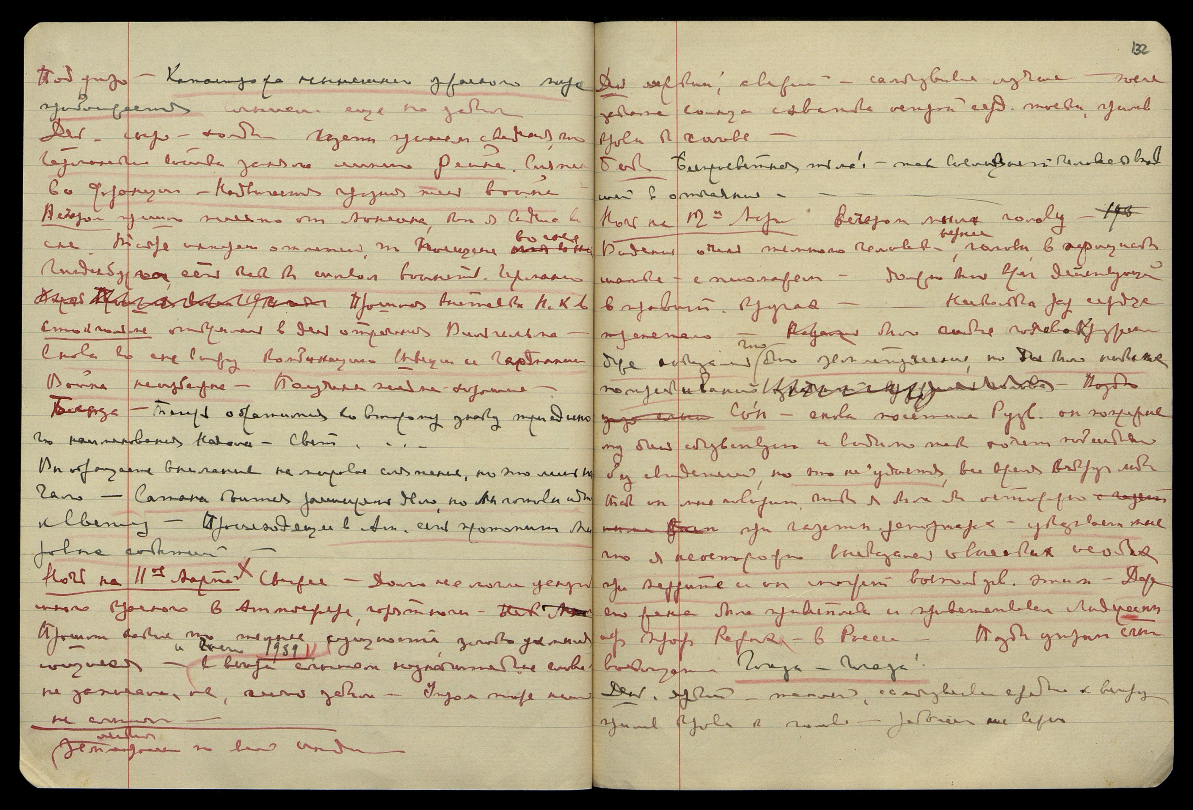 "Могу представить себе ужас... пьяница!.. в ужасном состоянии..." Видение [1-е] центром колокола. Угол комнаты, стены светлые, стоит небольшой дамский письменный стол из крас[ного] дерева с высокими полками, много бумаг навалены в беспорядке. На полке стоит зажжённая свеча, ясно, вокруг неё световая аура. На стенах в несколько рядов висят картины, небольшие в простых рамах, одна в голубых тонах в довольно широкой раме. Напоминают картины Н.К. Видение II. Очень большая комната почти квадратная. Ковёр на полу, светлые стены, большой письменный стол, низкое кресло с довольно высокой спинкой отодвинуто от стола. По стенам как бы низкие шкафы-полки, вещей много, впечатление интеллигентности обстановки. Сама я как бы стояла на пороге, видение мимолётное, потому не смогла ухватить больше подробностей. Сна нет, горение ног раздражает, заснула под утро. Утром: "Нельзя оказаться неоправданным, потому ищите... Фогель!" − последнее слово было сказано через несколько секунд после всей фразы. Но может быть именно это имя нужно искать около такс Департмента. Думы о школах в России: "Школы очень плохи..."