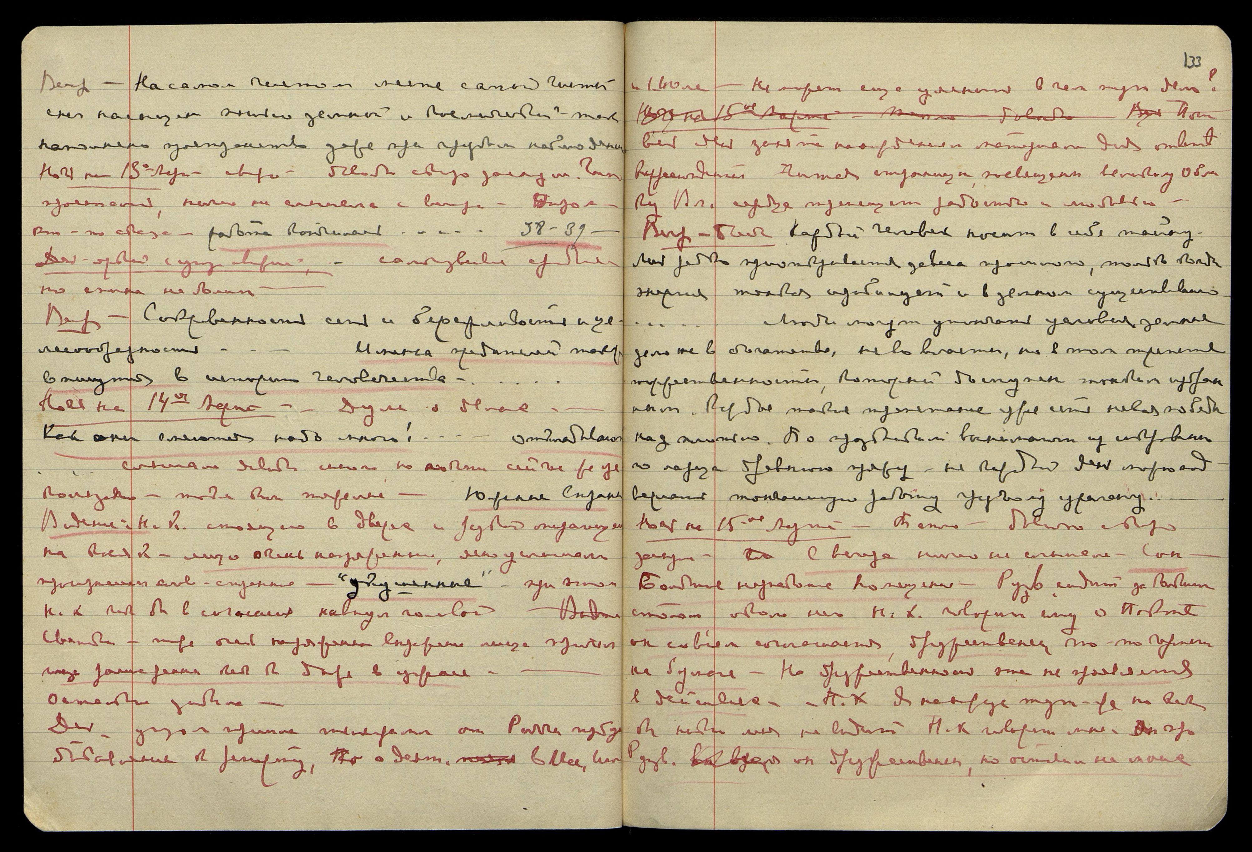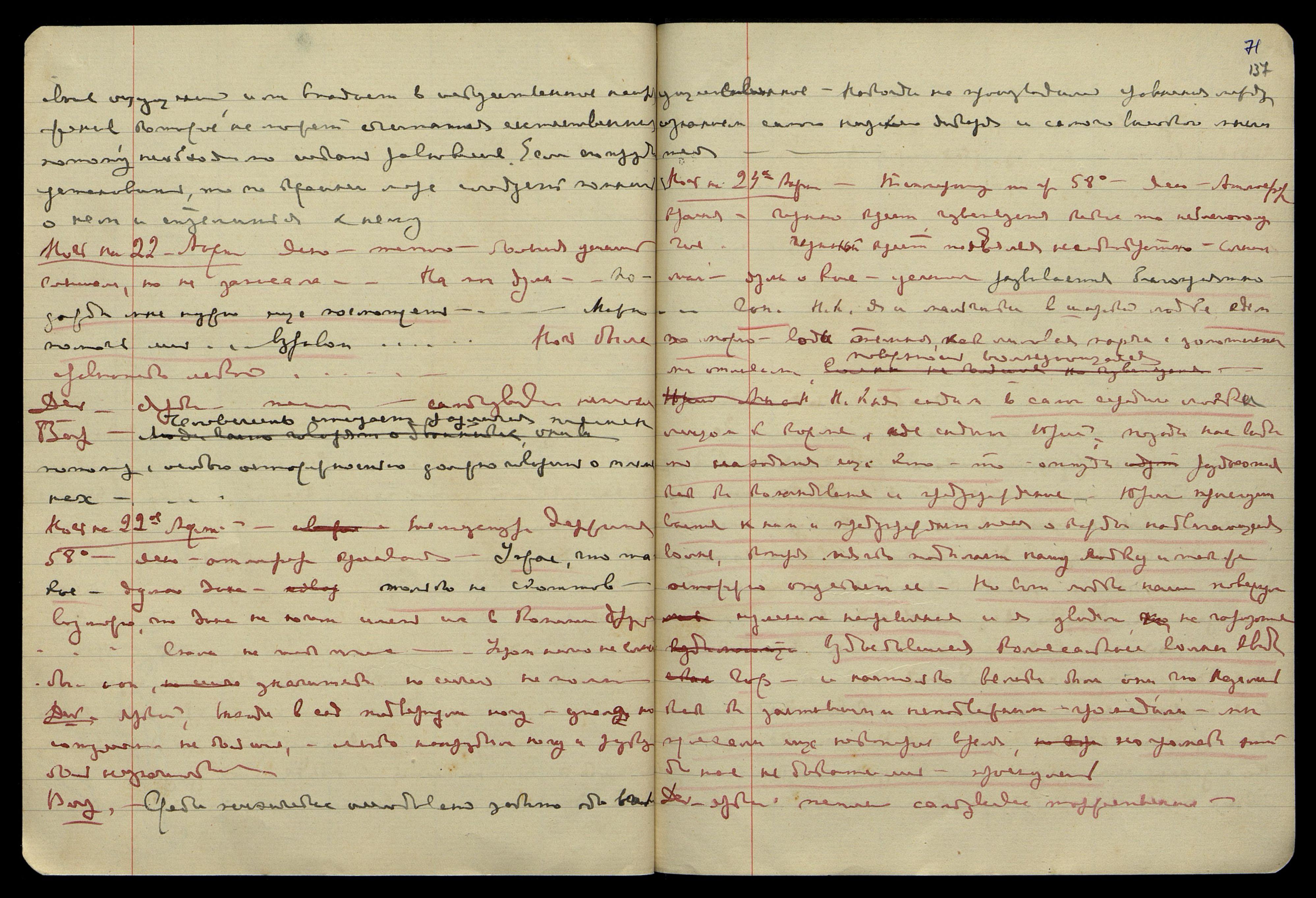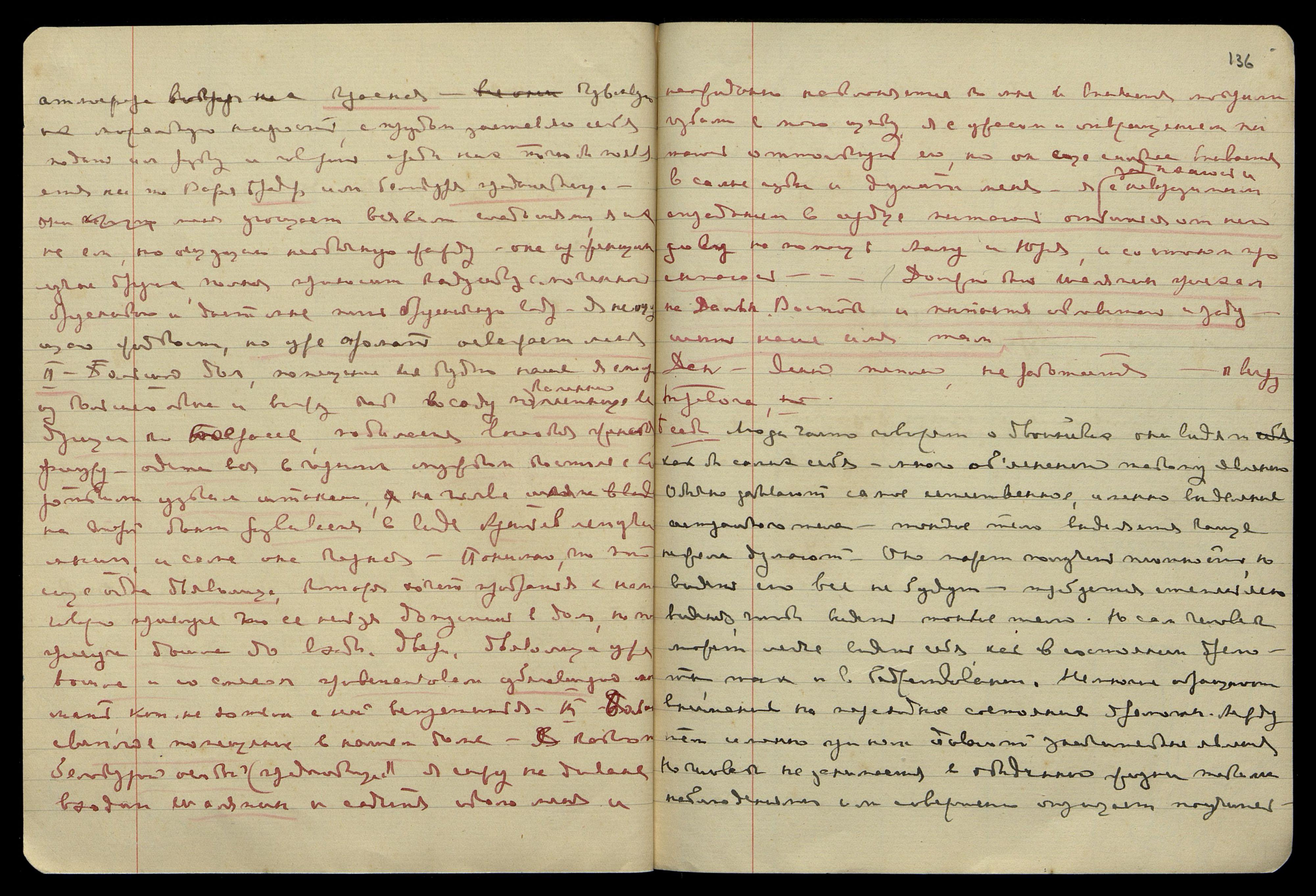 атмосфера вокруг нас красная. Чувствую их моральную низость, с трудом заставляю себя подать им руку и говорить. Среди них точно бы появляется не то Варя Брадф[орд] или белокурая предательница. Они меня угощают всякими сладостями, я их не ем, но ощущаю необычную жажду. Одна из женщин лучше других, полная, приносит кадушку с мочёной брусникой и даёт мне пить брусничную воду. Я не ощущаю жидкость, но уже аромат освежает меня.