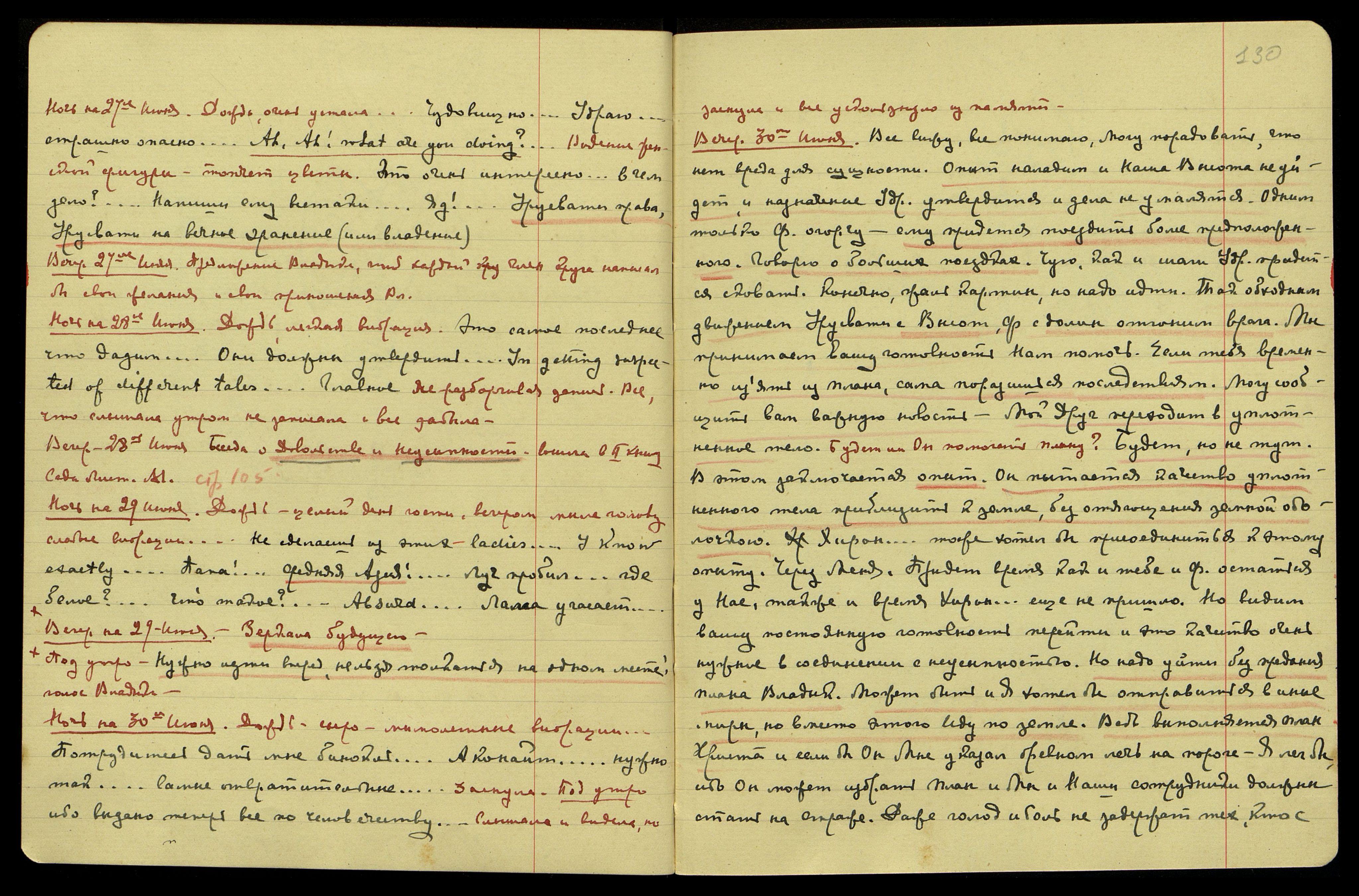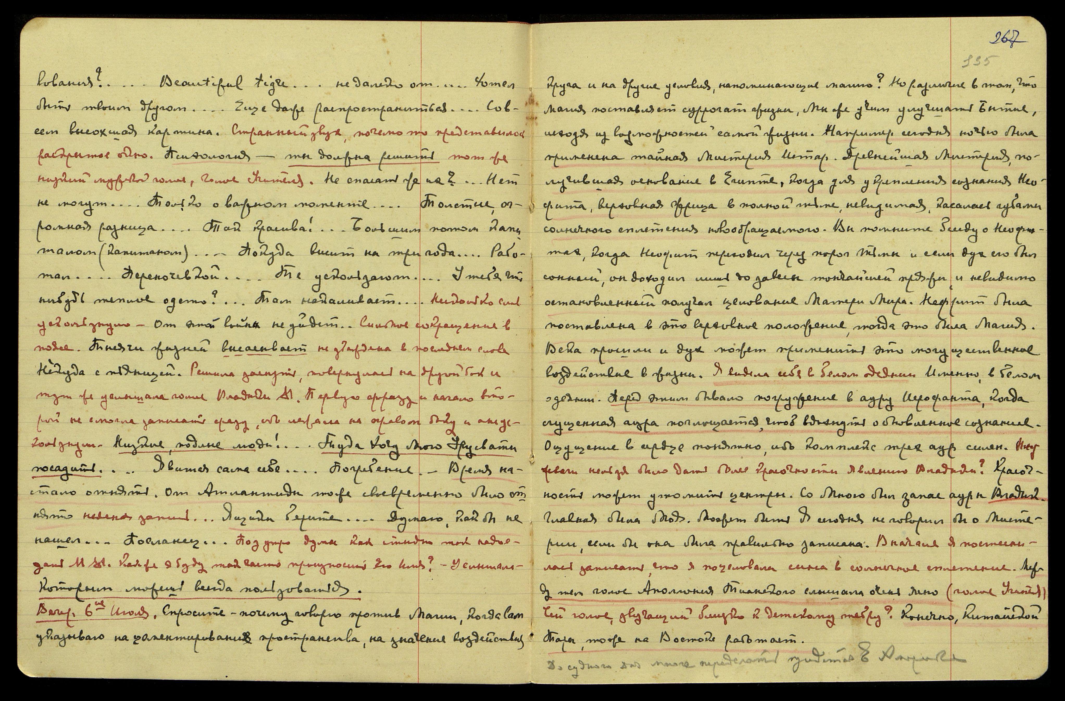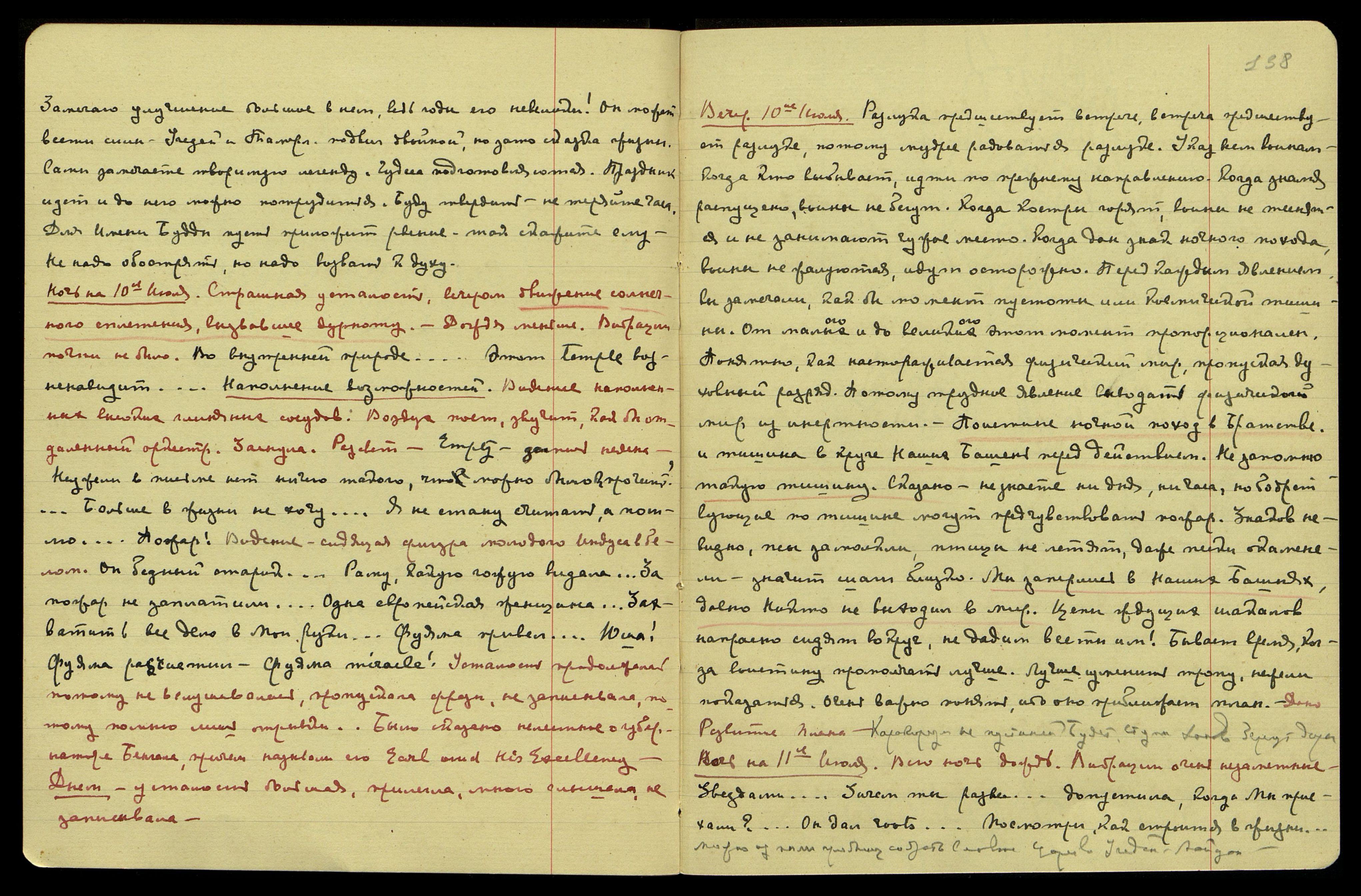 Ночь на 26-ое июня. Дождь. Очень тяжелая ночь. Н[иколай] К[онстантинович] страдал от удушия, почти не спали. "Посмотрев мои книжки, преподаватель сказал..." Несколько фраз пропущено. "Certainly if not more [англ.: Конечно, если не больше]... Стёпа возится всю зиму... Психология бездарная... французской книги Roggers'y... Моя мысль... Should not have subjuggated [англ.: Не следовало подчинять]... Руки опускались работать... В общем, там такая свалка... Roerich editor [англ.: редактор Рериха]... Дробь пробил и ушёл... И слышал, и видел, и ещё что?.. Есть, конечно, улучшение... Лялечка, слабеем!.." Раздвоение сознания − видение тёмного неба и двух звёзд, одна лиловая, другая краснее, причем мне казалось, что я указывала и рассматривала эти звезды, и, в тоже время, вслушивалась в идущие слова. "Нет ничего опасного... Мешочки будут мне показывать... Каждый луч... Гора тут боязни, а ты иди в свой", − запись неразборчива. "Радегунда!" Озноб правого бока и плеча. Deeds and thoughts are different things [англ.: Поступки и мысли − разные вещи]... Что такое?.. Не сказать ничего!.. High attraction... Wonderful [англ.: Высокая привлекательность... Замечательный]... Они обольщают нас и в нас самих... Что нам добыть, я ещё не знаю... Вышла в год... в середине его жертва". Почему-то в сознании встал облик Льва Толстого старшего. "Довольно, довольно писать!.. October even some day in May [англ.: Октябрь, ещё когда-нибудь в мае"]..." Лёгкий озноб. "Единому". Несколько фраз ускользнуло. "Время утвердит угасание... А мы вниз смотреть не должны". "Юрик, Юрик, скорее, ты не идёшь ко мне, так я иду!" − мой голос говорил сыну. "А теперь надо оградить сочетание духа... О человеческом атоме... О человеческом подвиге... Пронзительность... Можешь жаловаться в своей комнате... Такая фигура нужна... Поленов!.. Из этого вижу, как важны самые маленькие дырочки штопать!" Наблюдала короткие вибрации.