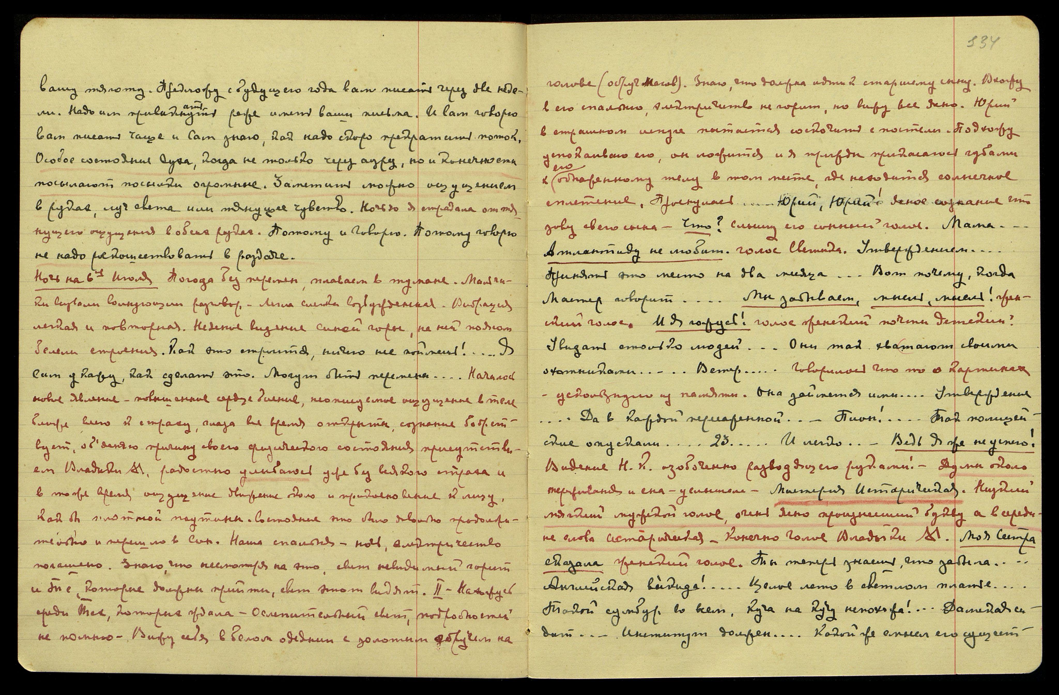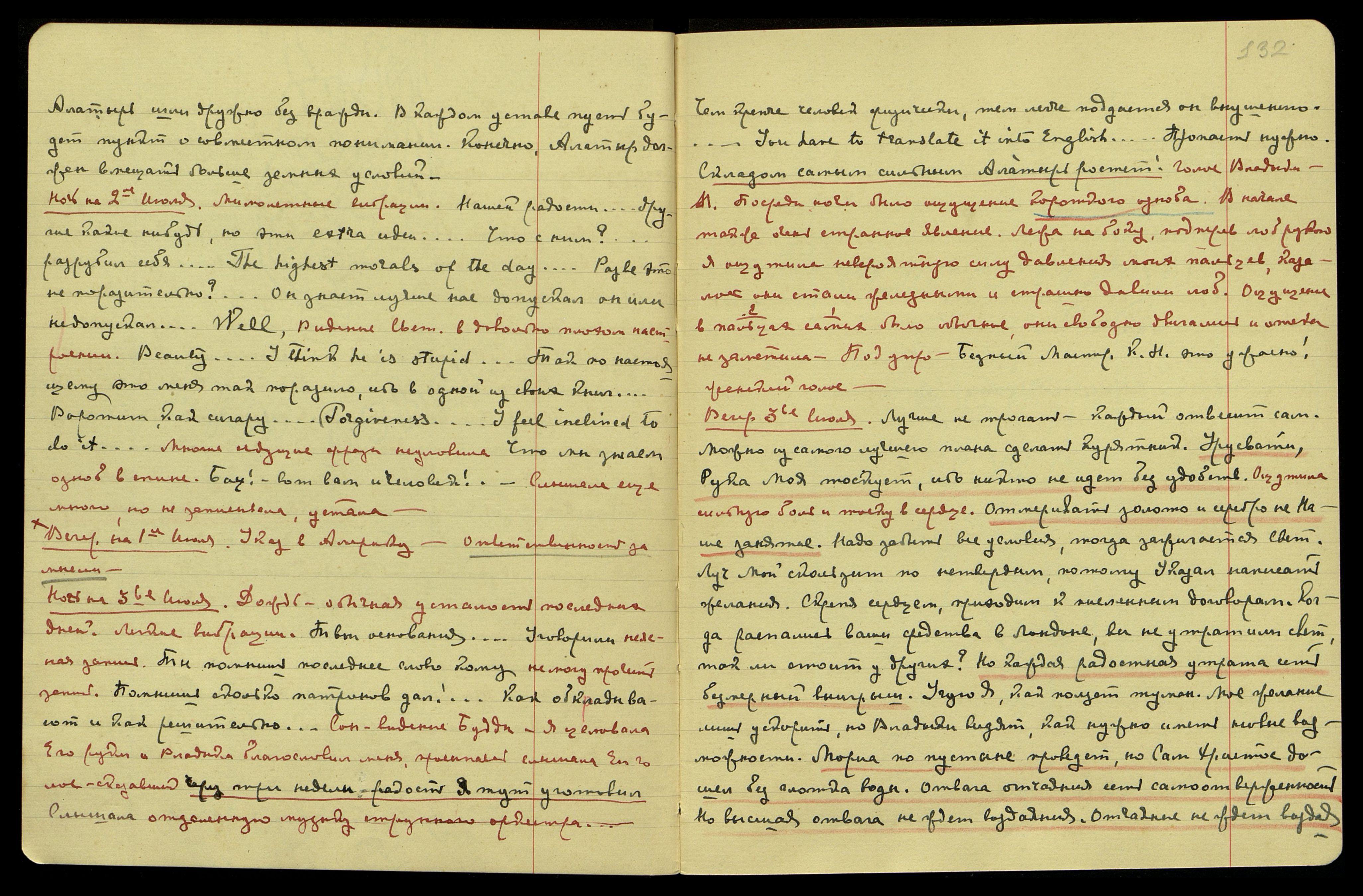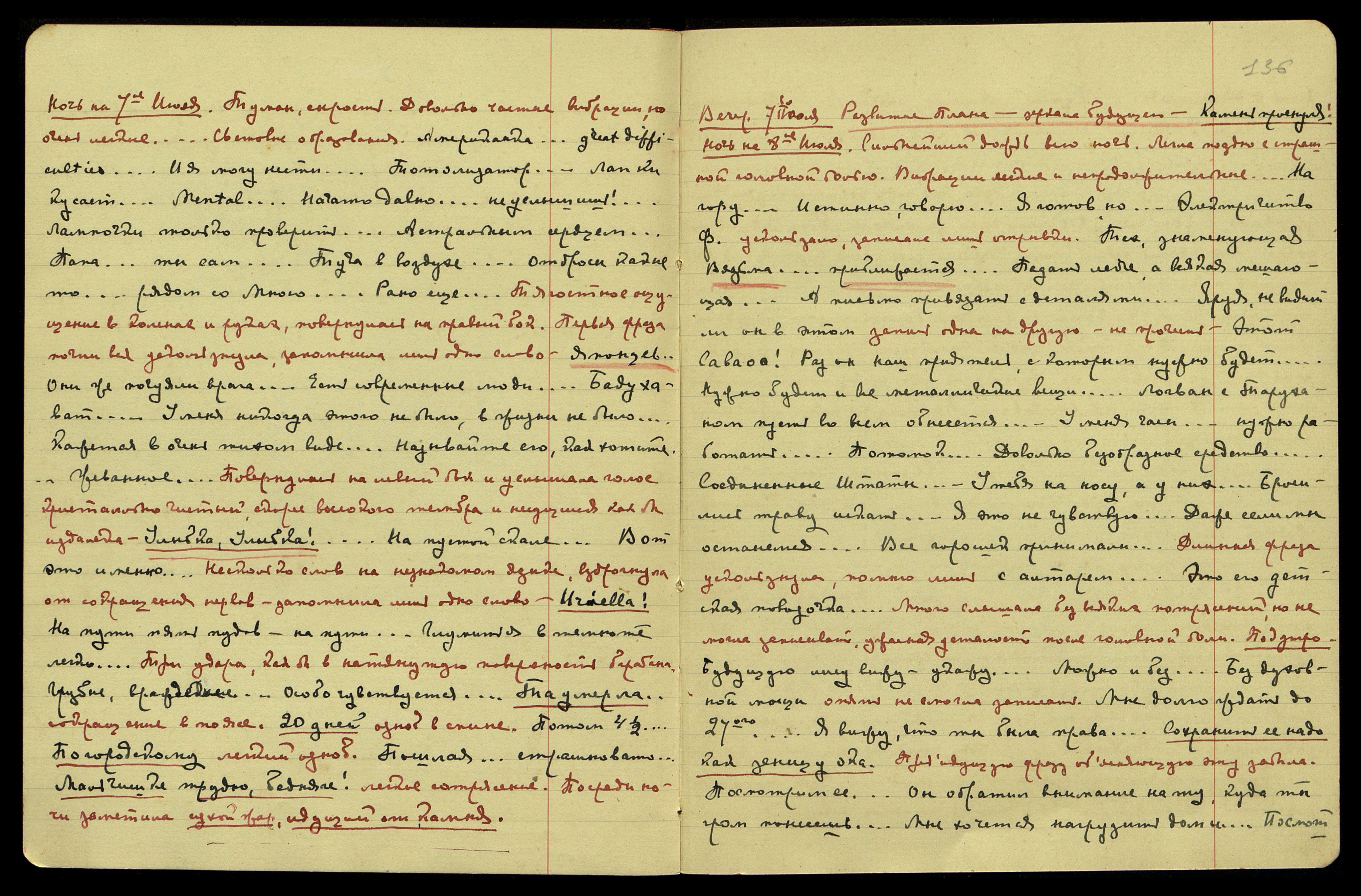 Ночь на 26-ое июня. Дождь. Очень тяжелая ночь. Н[иколай] К[онстантинович] страдал от удушия, почти не спали. "Посмотрев мои книжки, преподаватель сказал..." Несколько фраз пропущено. "Certainly if not more [англ.: Конечно, если не больше]... Стёпа возится всю зиму... Психология бездарная... французской книги Roggers'y... Моя мысль... Should not have subjuggated [англ.: Не следовало подчинять]... Руки опускались работать... В общем, там такая свалка... Roerich editor [англ.: редактор Рериха]... Дробь пробил и ушёл... И слышал, и видел, и ещё что?.. Есть, конечно, улучшение... Лялечка, слабеем!.." Раздвоение сознания − видение тёмного неба и двух звёзд, одна лиловая, другая краснее, причем мне казалось, что я указывала и рассматривала эти звезды, и, в тоже время, вслушивалась в идущие слова. "Нет ничего опасного... Мешочки будут мне показывать... Каждый луч... Гора тут боязни, а ты иди в свой", − запись неразборчива. "Радегунда!" Озноб правого бока и плеча. Deeds and thoughts are different things [англ.: Поступки и мысли − разные вещи]... Что такое?.. Не сказать ничего!.. High attraction... Wonderful [англ.: Высокая привлекательность... Замечательный]... Они обольщают нас и в нас самих... Что нам добыть, я ещё не знаю... Вышла в год... в середине его жертва". Почему-то в сознании встал облик Льва Толстого старшего. "Довольно, довольно писать!.. October even some day in May [англ.: Октябрь, ещё когда-нибудь в мае"]..." Лёгкий озноб. "Единому". Несколько фраз ускользнуло. "Время утвердит угасание... А мы вниз смотреть не должны". "Юрик, Юрик, скорее, ты не идёшь ко мне, так я иду!" − мой голос говорил сыну. "А теперь надо оградить сочетание духа... О человеческом атоме... О человеческом подвиге... Пронзительность... Можешь жаловаться в своей комнате... Такая фигура нужна... Поленов!.. Из этого вижу, как важны самые маленькие дырочки штопать!" Наблюдала короткие вибрации.