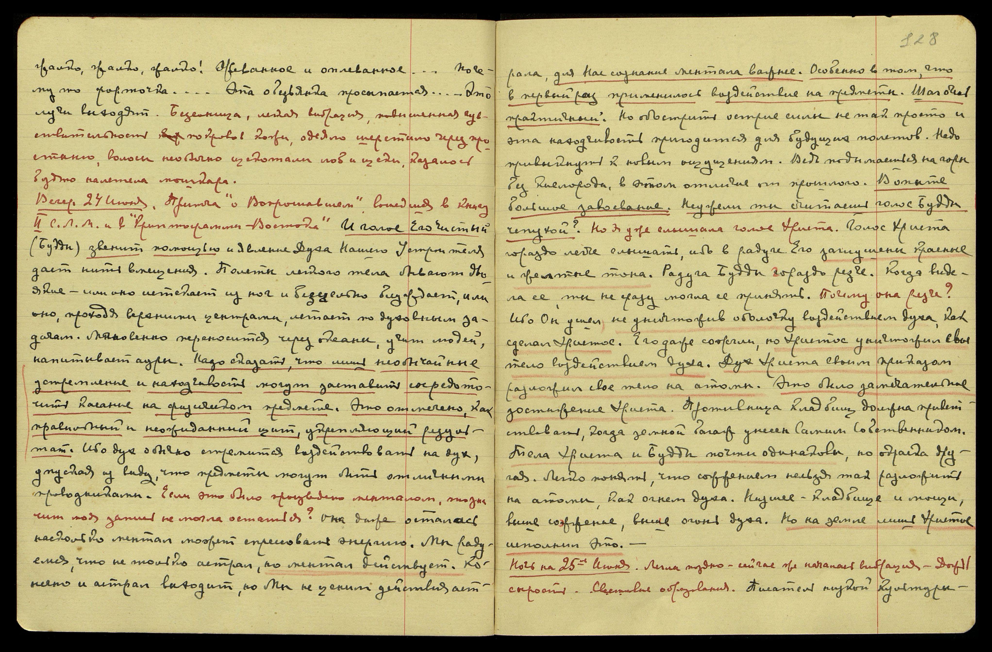 "Бесконечная наука вызывающая...", − опять тот же голос (Будды), как бы издалека, в ответ на мою мысль о трудности людской кооперации, вследствие их непонимания. "Как летит мысль Урусвати и Ф[уямы]... Увеличить, на шесть месяцев уезжают... Палкою, вообще... Себя лишили ехать на дачу... Стараюсь, стараюсь... сколько время нахожу... И что мне врать? Возьми других!"... Видение центром колокола Н[иколая] К[онстантиновича], читающего какую-то бумагу. "One of a great privacy is required [англ.: Требуется большая конфиденциальность]... Насколько, идёте правильно... На четыре лестницы вперед теперь... Только три человека в мире!.. Что-то мне доверят?.. Стоила очень дорого", − неясная запись. "Разработка... Берегла здоровье... Это хорошо, но ещё latent [англ.: скрытый]... Она тебе первая понравилась... Шесть недель неприятных... Лучами над тобою... выберем дело из этих", − неразборчивая запись. "На выставочную... сочинённое... будет очень некрасиво... Не хочу больше воплощаться бедуином... Виденное тобою отмечено. Помнишь, что Мастер сказал − надеть ожерелье... Сохраните ковчег, лилии на нём..."