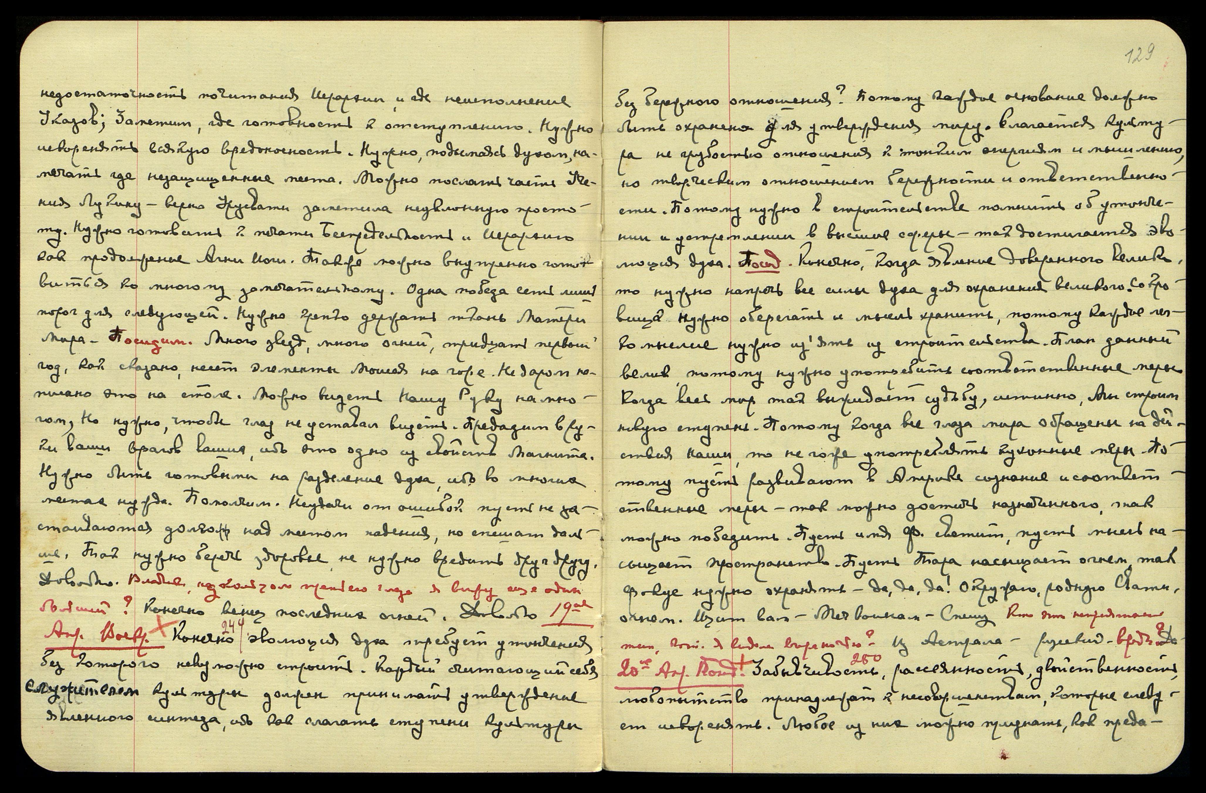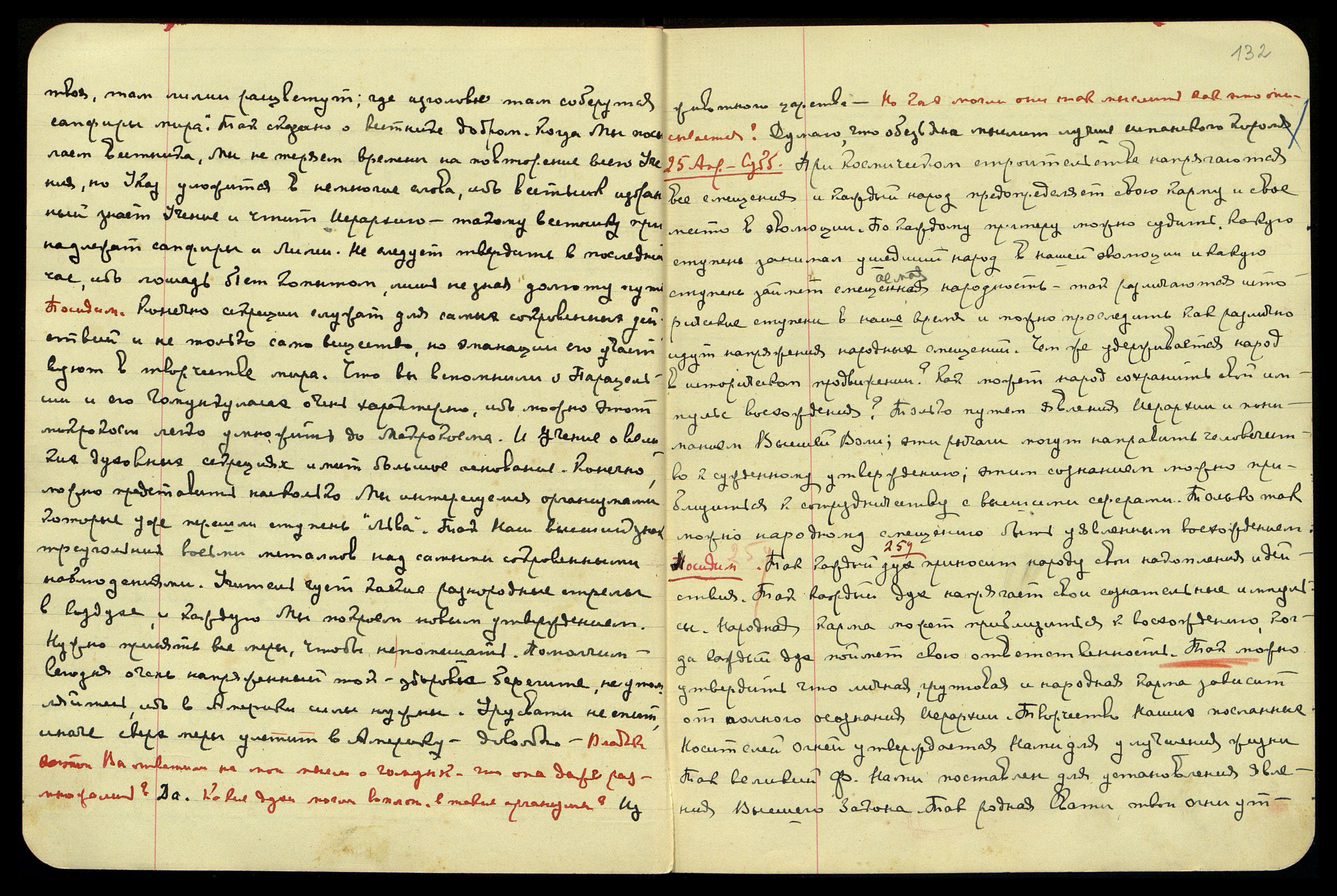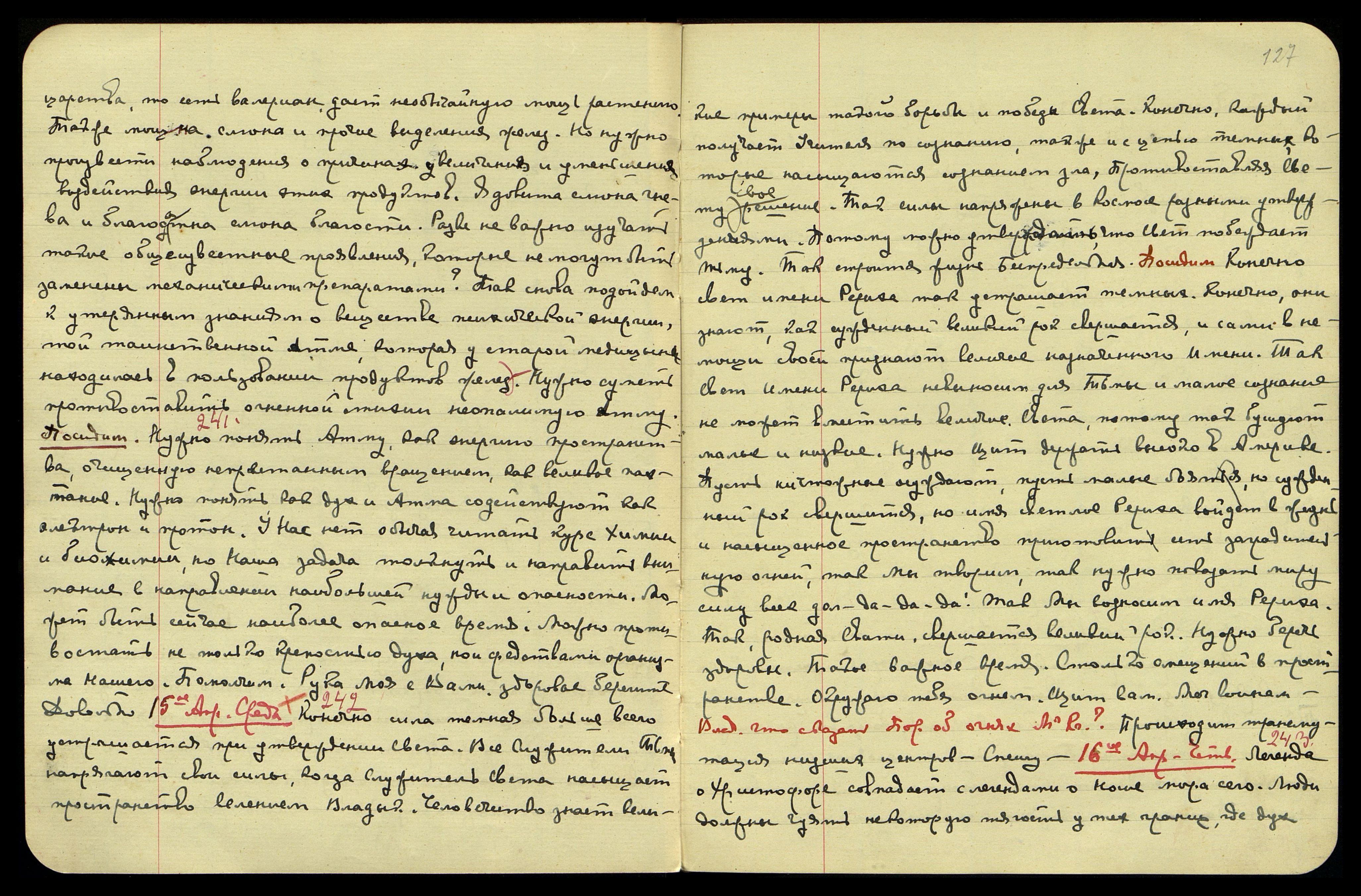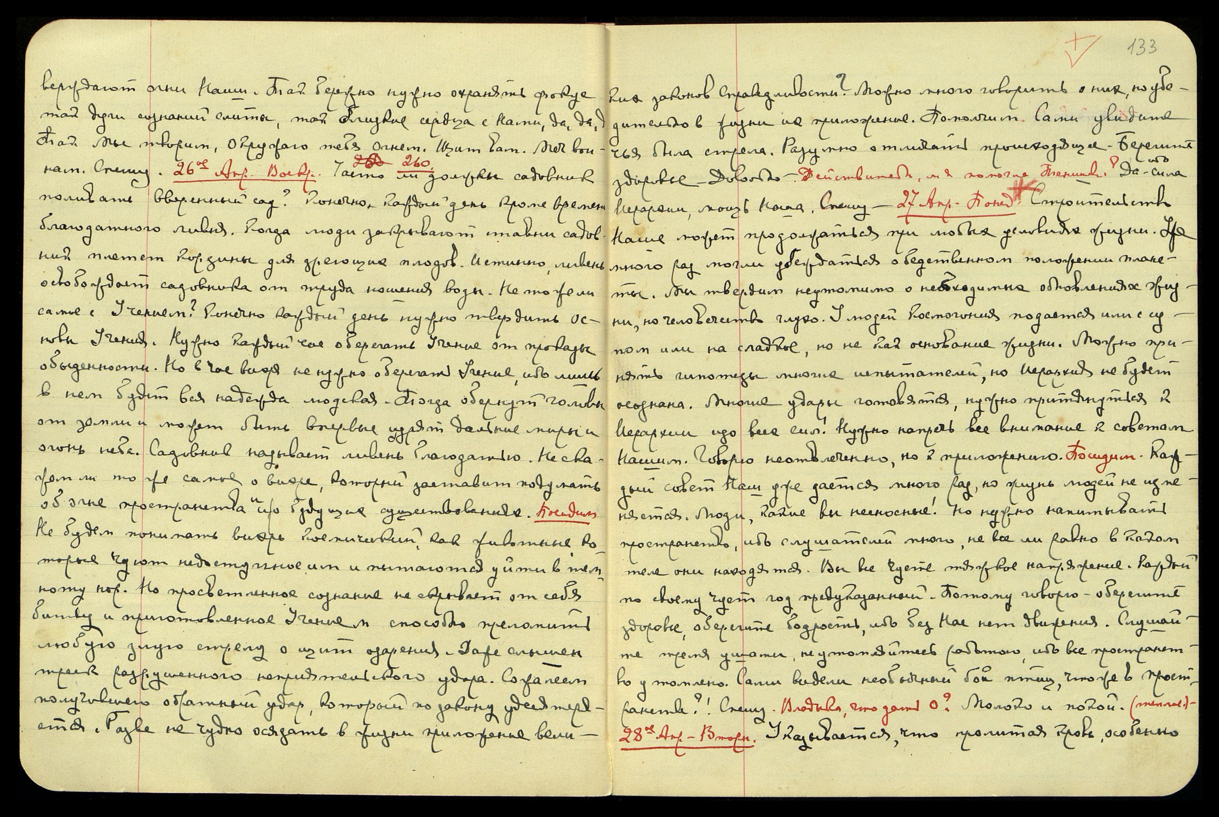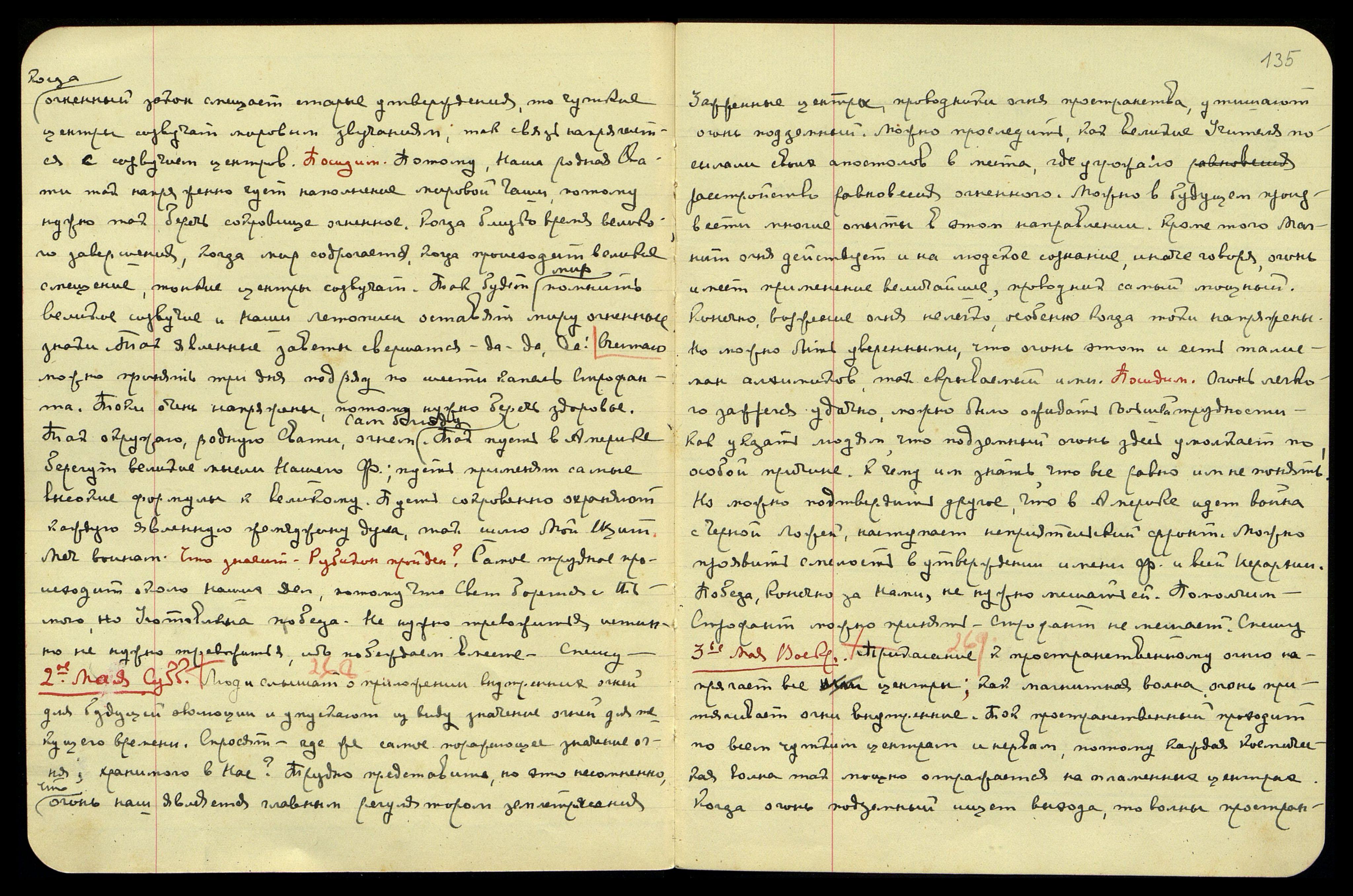 14-апр[еля]. Вторн[ик]. Когда люди начнут изучать не только огни и лучи, но и секреции человеческие, тогда можно думать о перемене тела. Странно, что люди понимают мощные химические процессы, происходящие в их организме, и в то же время считают продукты этих процессов лишь отбросами. Можно видеть, насколько сильна кровь или слюна. Можно видеть, насколько кровь растительного