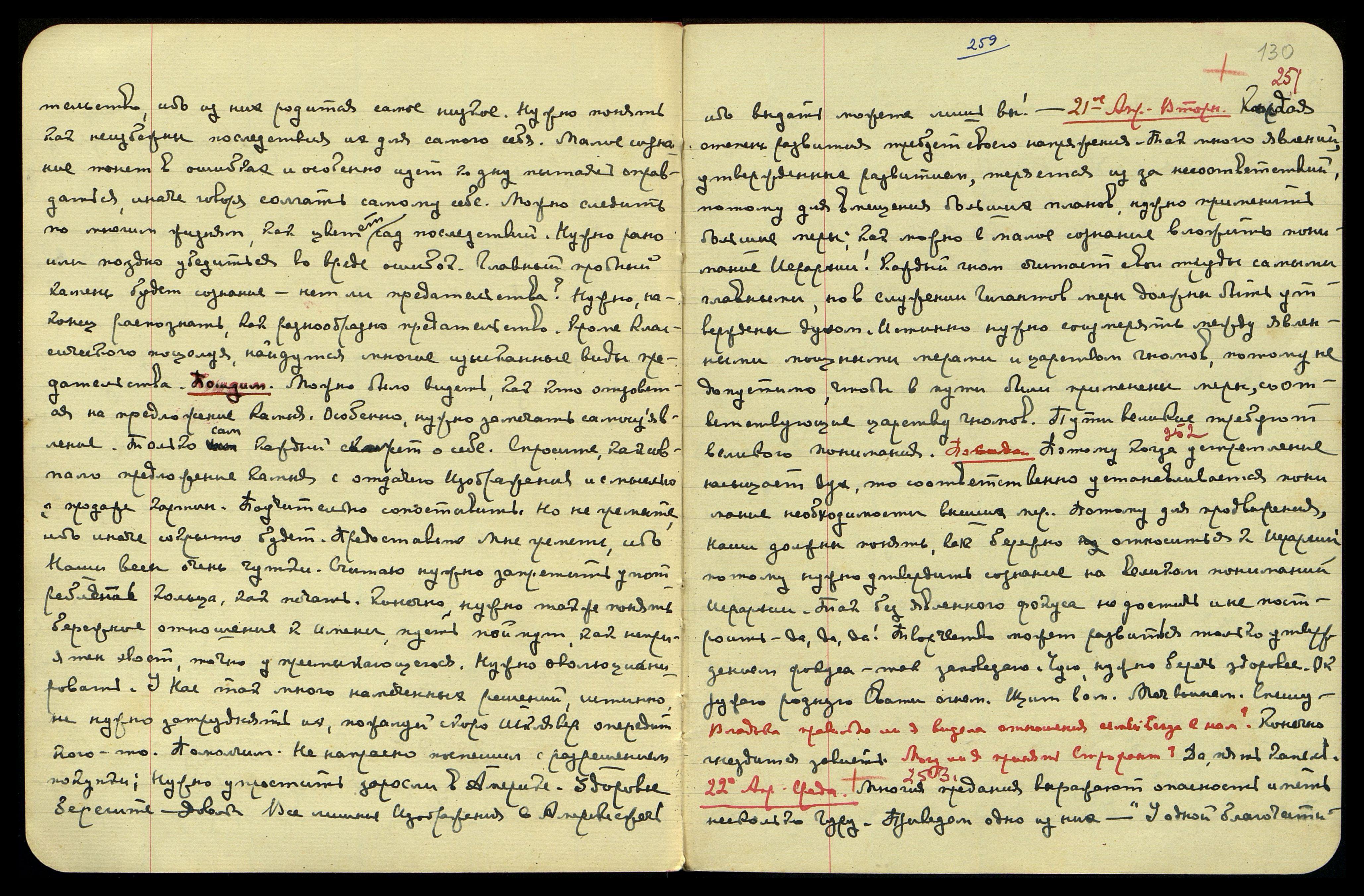 20-ое апр[еля]. Понед[ельник]. [Иерархия] § 250. Забывчивость, рассеянность, двойственность, любопытство принадлежат к несовершенствам, которые следует искоренять. Любое из них можно признать как преда-