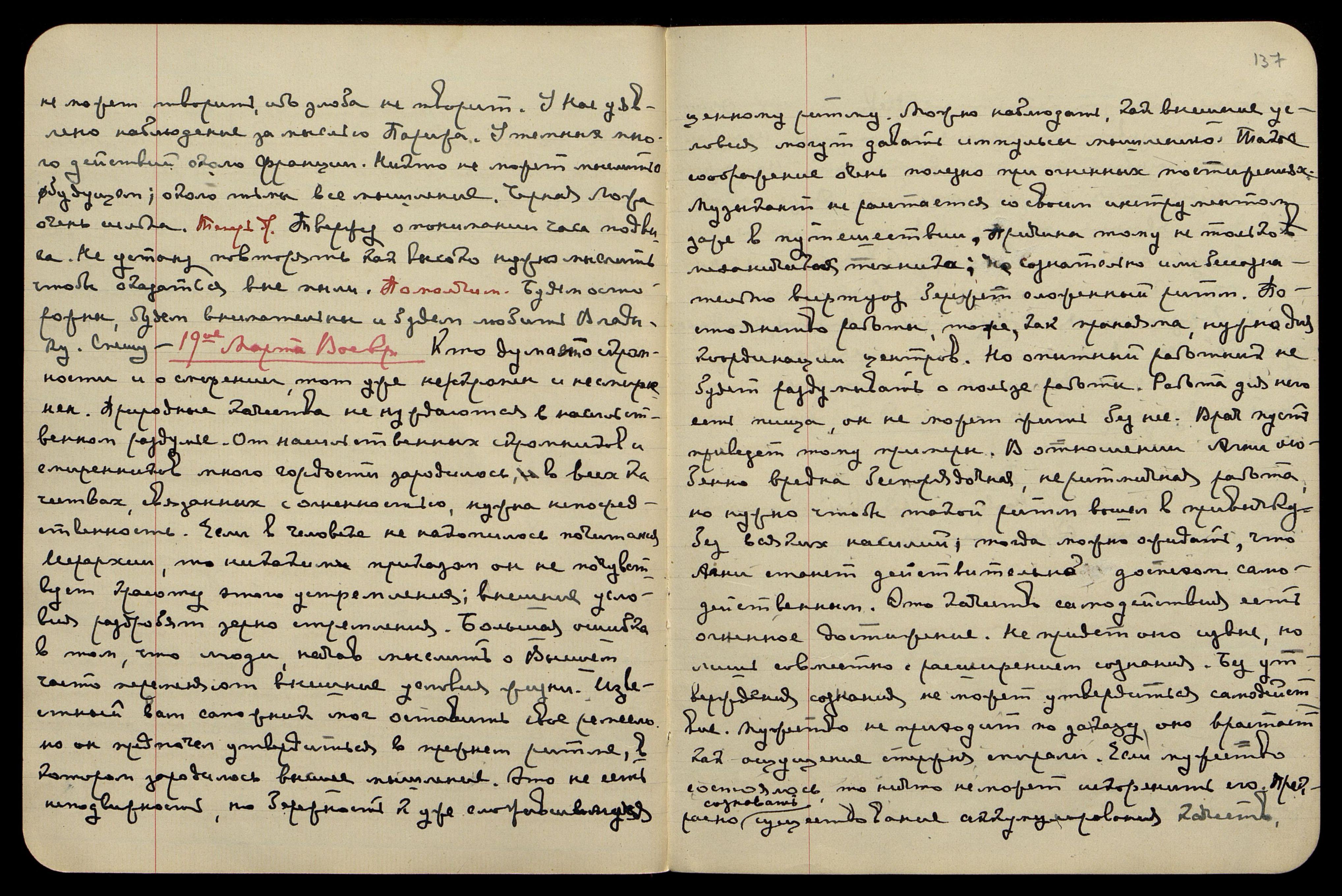 ужасным уродствам жизни. Мера будет развитие огненной энергии. Воспылавший сердцем никогда не будет паразитом. Такое понимание паразитства спасёт уклад мышления. Не будет паразитов − не будет и безработных. Теперь др[угое]. Правильно понимать, что немцы имеют план усилить Германию старыми мерами. Можно извлечь пользу из этого намерения. Люди должны приучиться к ценности личности. Хотя нам не по пути с Германией, но её пример полезен. Подумайте обо Мне. Помолчим. Довольно.