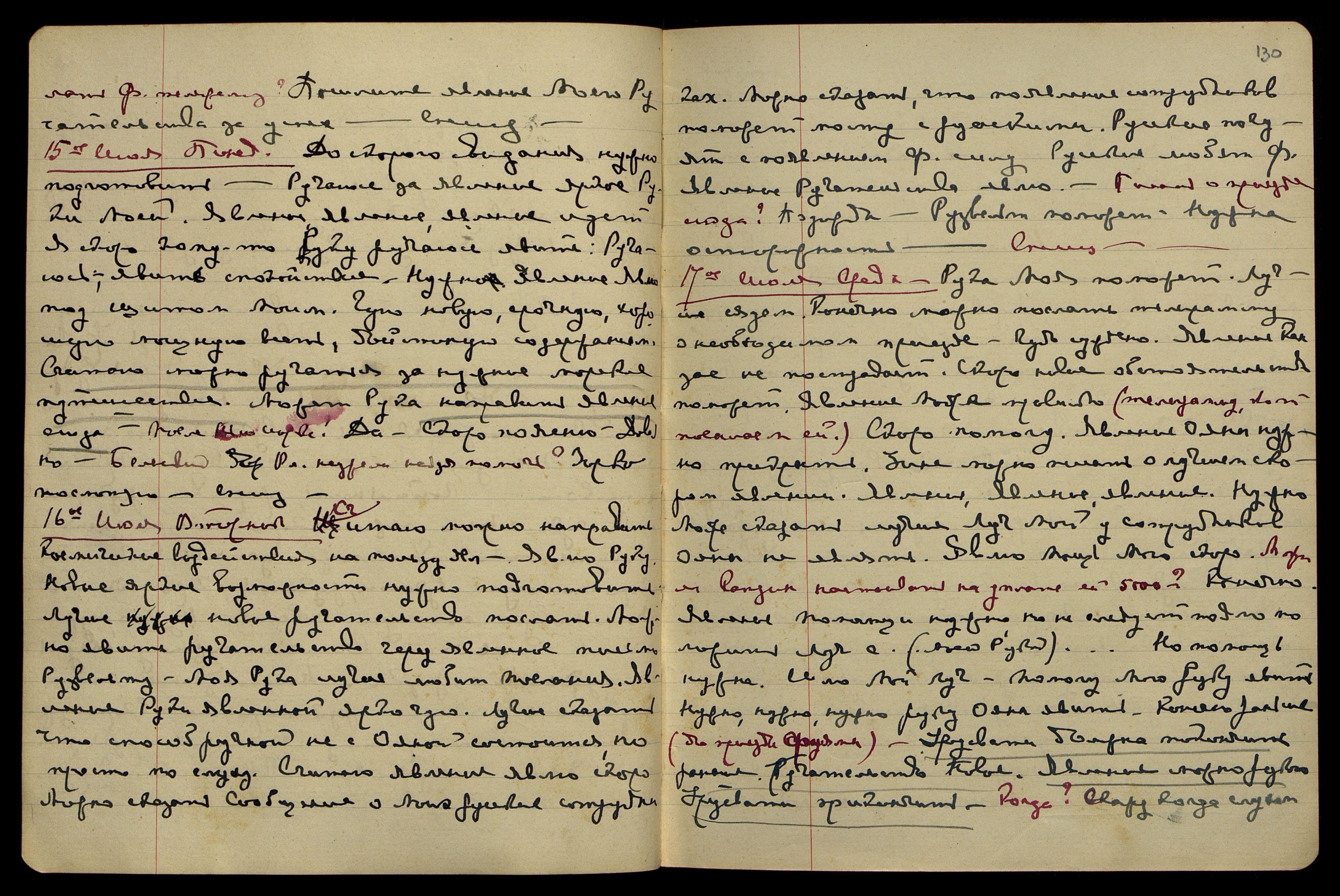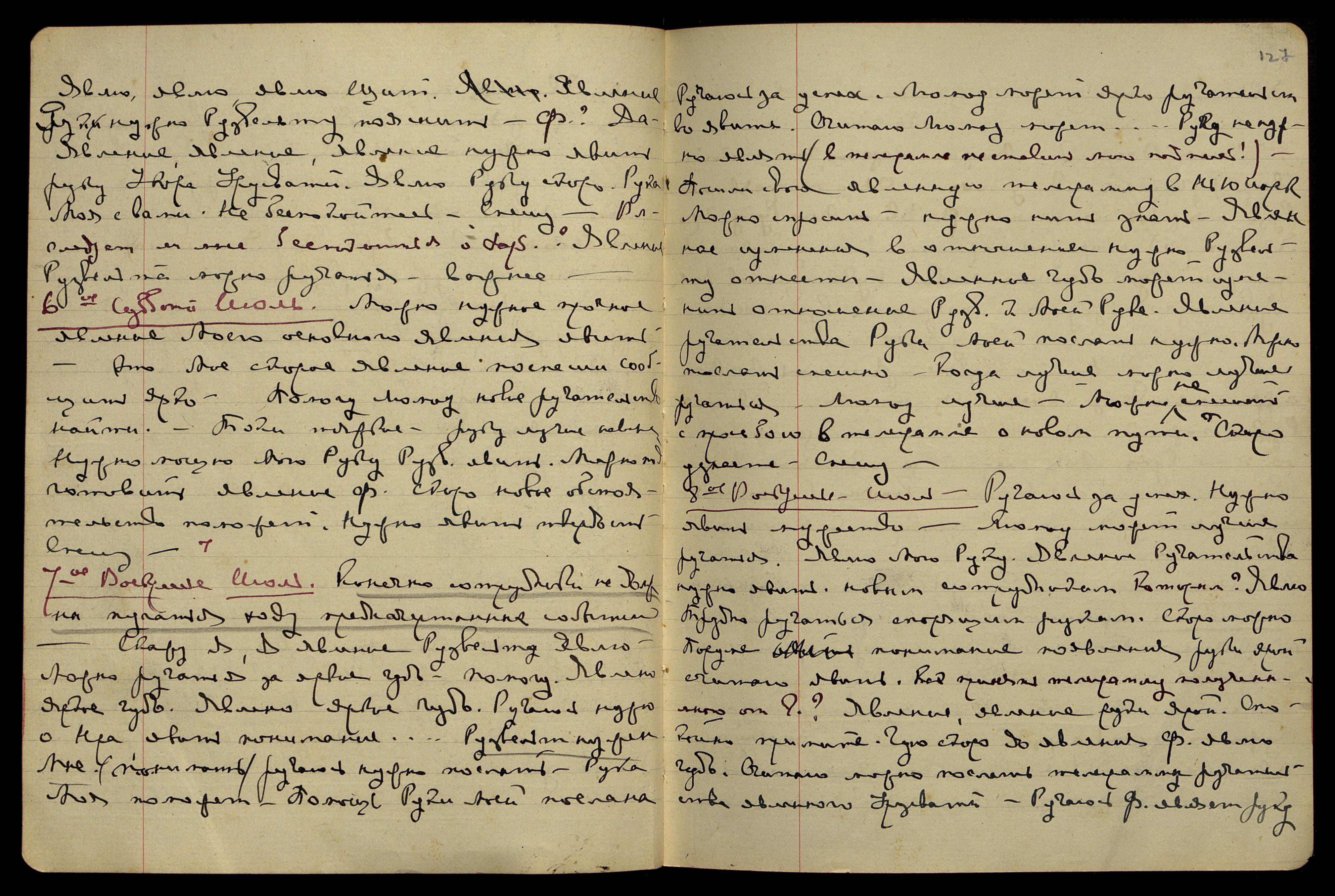 7-ое. Воскресенье. Июль. Конечно, сотрудники не должны пугаться ходу предначертанных событий. Скажу − Я, Я явление Рузвельту явлю. Можно ручаться за яркое чудо. Помогу. Явлено яркое чудо. Явлено яркое чудо. Ручаюсь, нужно о [одно слово неразборчиво] явить понимание... Рузвельт нужен Мне (понимать). Ручаюсь, нужно послать − Рука Моя поможет. Помощь Руки Моей послана. Ручаюсь за успех. Люмоу может ярко ручательство явить. Считаю, Люмоу может... Руку не нужно являть. (В телеграмме не ставить мою подпись!) Пошли свою явленную телеграмму в Нью-Йорк. Можно спросить − нужно нить знать. Явленное изменение в отношении нужно Рузвельту отнести. Явленное чудо может изменить отношение Рузв[ельта] к Моей Руке. Явление ручательства Руки Моей послать нужно. Можно послать спешно. Когда лучше, можно лучше ручаться − Люмоу лучше. Может не спешить с просьбою в телеграмме о новом пути. Скоро узнаете. Спешу.