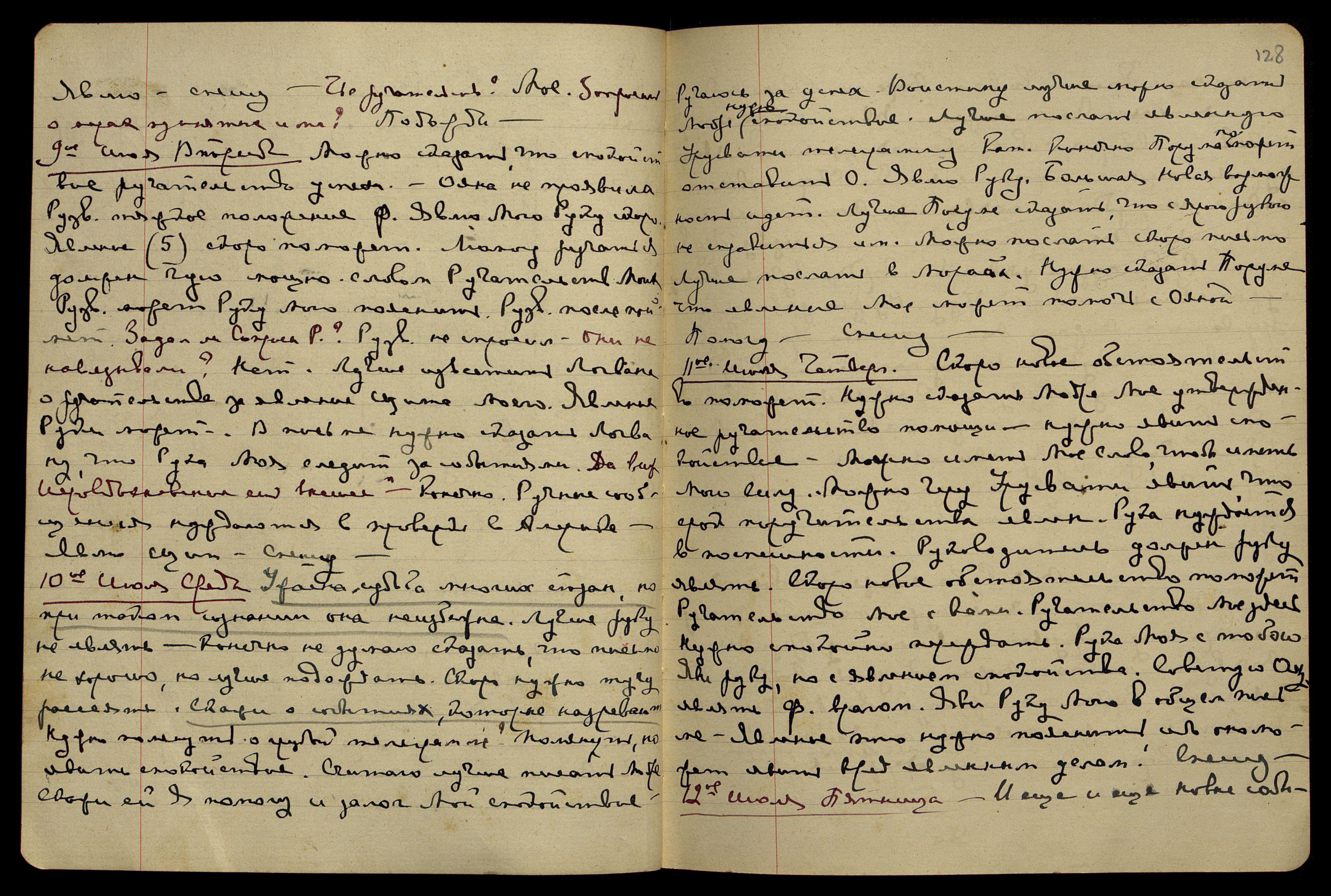 9-ое июля. Вторник. Можно сказать, что спокойствие − ручательство успеха. Ояна не проявила Рузв[ельту] тяжкое положение. Ф[уяме] Явлю Мою Руку скоро. Явление (5) скоро поможет. Люмоу ручаться должен, чую, мощно словом ручательств Моих Рузв[ельту] может Руку Мою пояснить. Рузв[ельт] после поймет.