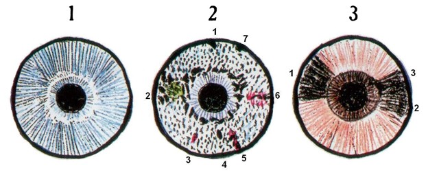 Левый глаз: светлый круг в области желудка указывает на повышенную кислотность, обилие крови. 1. Обилие крови в головном мозге, головокружение; 2. хронический катар легких; 3. опухоль печени, воспаление; 4. гнойный туберкулез костей нижних конечностей; 5. туберкулез гортани, хронический катар гортани; 6. туберкулез горла и дыхательных путей; 7. нагноение уха.