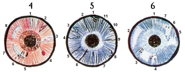 Правый глаз: 1-2. эпилепсия; 3. темные пигментные пятна по краям радужки: предрасположенность к заболеваниям легких; 4. зажившие кальцинированные легочные каверны; 5. нагноение почек; 6. нагноение миндалин. Четырехугольный желтый круг кишечника означает общее расстройство кишечника и чрезмерное выделение желчного сока.