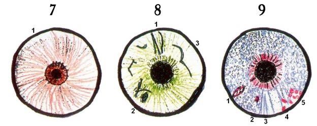 Правый глаз: 1. Кольца боли и спазма; на окружности кишечника видны туберкулезные язвы в тонкой кишке. Плоский по бокам зрачок указывает на заболевания легких, печени и селезенки.
