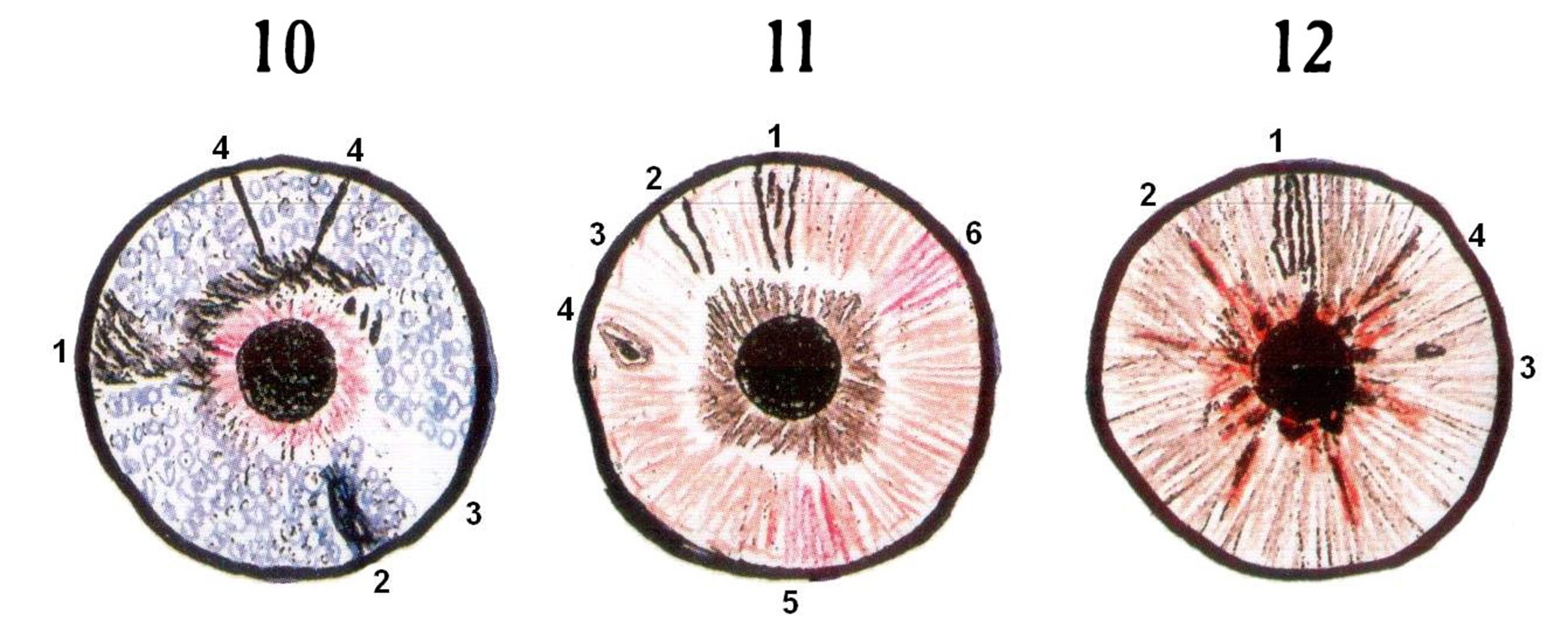 кожу с низким содержанием крови. Красное кольцо невроза вокруг зрачка указывает на анемию, нервную слабость, истерию, унаследованное возбуждение мозга. 1. Перелом черепа; 2. Перелом затылка; 3. Перелом ключицы;4. Перелом ребра; 5. Перелом правой руки; 6. Перелом тазобедренной кости; 7. Перелом головки бедра; 8. Перелом заднего ребра; 9. Травма гортани; 10. Операция на миндалинах; 11. Перелом грудины.