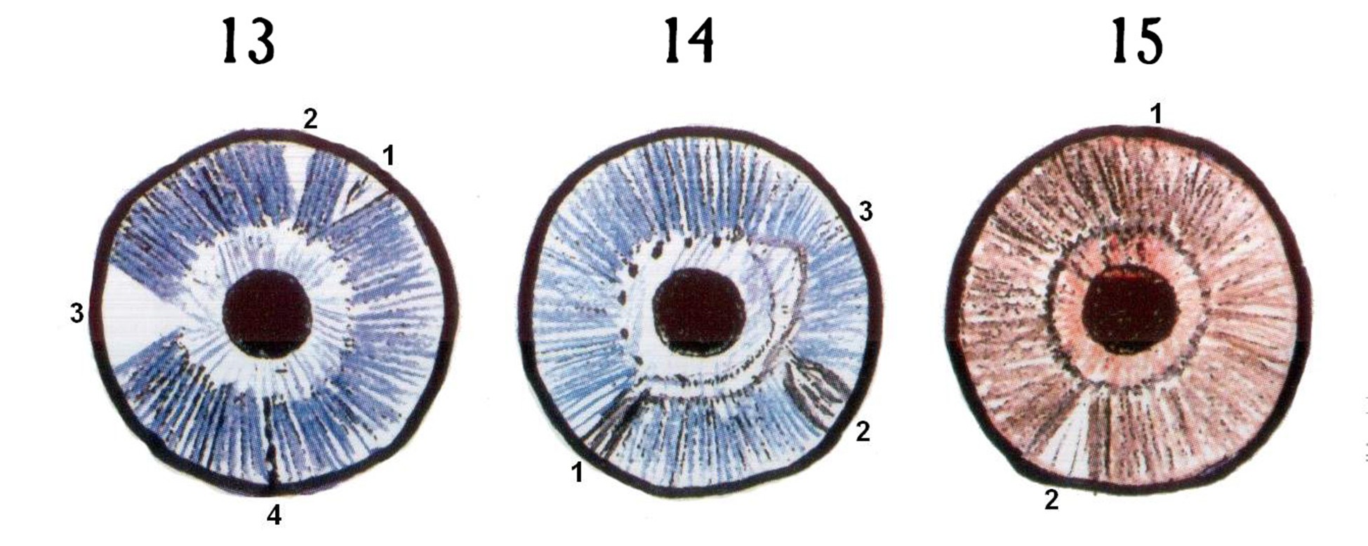 Левый глаз: 1. Черные лучи в сегменте мозга указывают на недостаточный приток крови к мозгу, головокружение и истерию. 2. Внешний край радужной оболочки, круг кожи темный. Обычно это происходит в нижней части тела и означает общую анемию, слабость, холод в конечностях, низкое кровяное давление. Более светлая окраска кожного покрова означает обилие крови, горячую кожу, высокое кровяное давление, особенно если сегмент мозга также светлый. Темный или светлый оттенок по краям радужной оболочки всегда означает, что орган, находящийся под ней или рядом с ней, болен. 3. Типичная зигзагообразная линия, указывающая на рак, в данном случае рак мочевого пузыря. Кроме того, мы находим пятна бочкообразной формы.