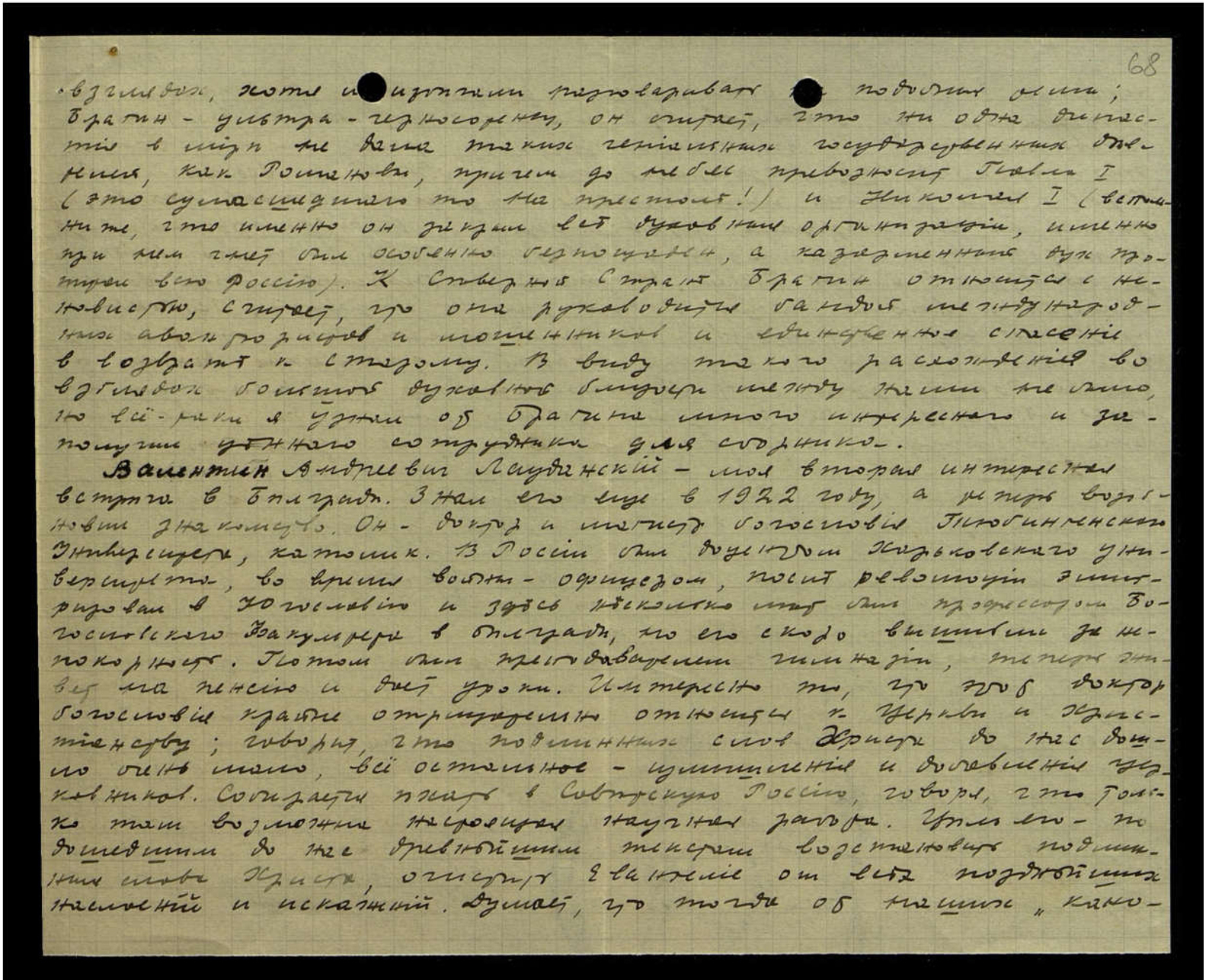 Валентин Андреевич Лауданский — моя вторая интересная встреча в Белграде. Знал его ещё в 1922 году, а теперь возобновил знакомство. Он — доктор и магистр богословия Тюбингенского Университета, католик. В России был доцентом Харьковского Университета, во время войны — офицером, после революции эмигрировал в Югославию и здесь несколько лет был профессором Богословского Факультета в Белграде, но его скоро вышибли за непокорность. Потом был преподавателем гимназии, теперь живёт на пенсию и даёт уроки. Интересно то, что этот доктор богословия крайне отрицательно относится к Церкви и к Христианству; говорит, что подлинных слов Христа до нас дошло очень мало, всё остальное — измышления и добавления церковников. Собирается ехать в Советскую Россию, говоря, что только там возможна настоящая научная работа. Цель его — по дошедшим до нас древнейшим текстам восстановить подлинные слова Христа, очистить Евангелие от всех позднейших наслоений и искажений. Думает, что тогда от наших "кано-