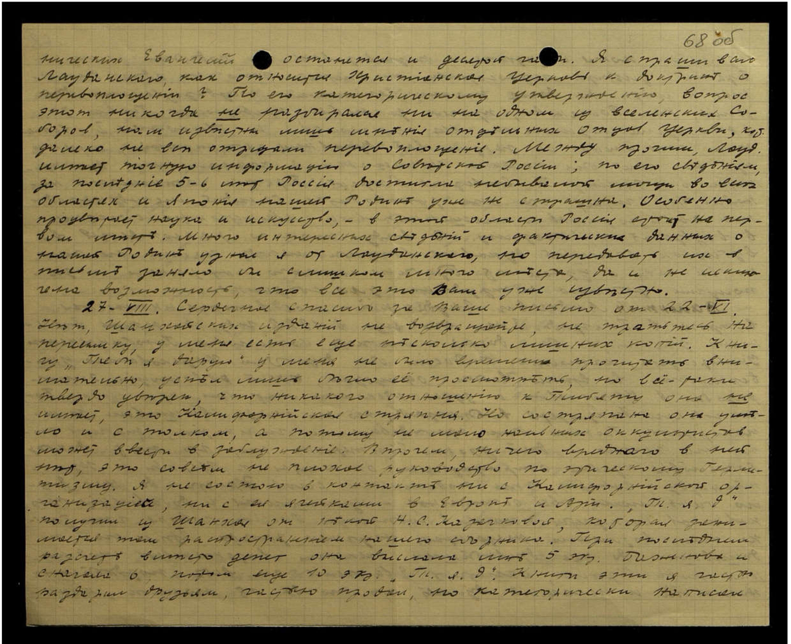 нических Евангелий не останется и десятой части. Я спрашивал Лауданского, как относится Христианская Церковь к доктрине о перевоплощении? По его категорическому утверждению, вопрос этот никогда не разбирался ни на одном из вселенских Соборов, нам известны лишь мнения отдельных Отцов Церкви, кот[орые] далеко не все отрицали перевоплощение. Между прочим, Лауд[анский] имеет точную информацию о Советской России; по его сведениям, за последние 5-6 лет Россия достигла небывалой мощи во всех областях, и Япония нашей Родине уже не страшна. Особенно процветает наука и искусство, — в этой области Россия стоит на первом месте. Много инженерных сведений и фактических данных о нашей Родине узнал я от Лаудинского, но передавать их в письме заняло бы слишком много места, да и не исключена возможность, что всё это Вам уже известно.