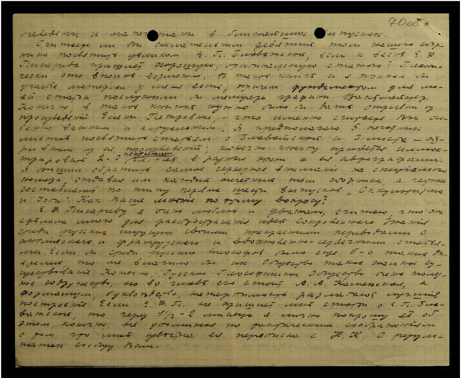 Считаете ли Вы желательным девятый том нашего сборника посвятить целиком Е.П. Блаватской, если к весне Е.Ф. Писарева пришлёт хорошую, оригинальную статью? Технически это вполне возможно. В такой книге и я принял бы участие, материал у меня есть, причём фундаментом для моей статьи послужили бы мемуары графини Вахтмейстер. Конечно, в такой книжке нужно было бы дать отрывки из произведений Елены Петровны, — что именно считаете Вы особенно важным и актуальным. Я предполагаю 5 печатных листов посвятить статьям о Блаватской и 3 листа — отрывкам из её произведений; конечно, книгу придётся иллюстрировать 2-я портретами Ел[ены] Пет[ровны] в разные эпохи и её автографами. Я решил обратить самое серьёзное внимание на специальные номера, отдавая им каждый нечётный том сборника, а чётные составлять по типу первых шести выпусков "Оккультизма и Йоги". Как Ваше мнение по этому вопросу?
