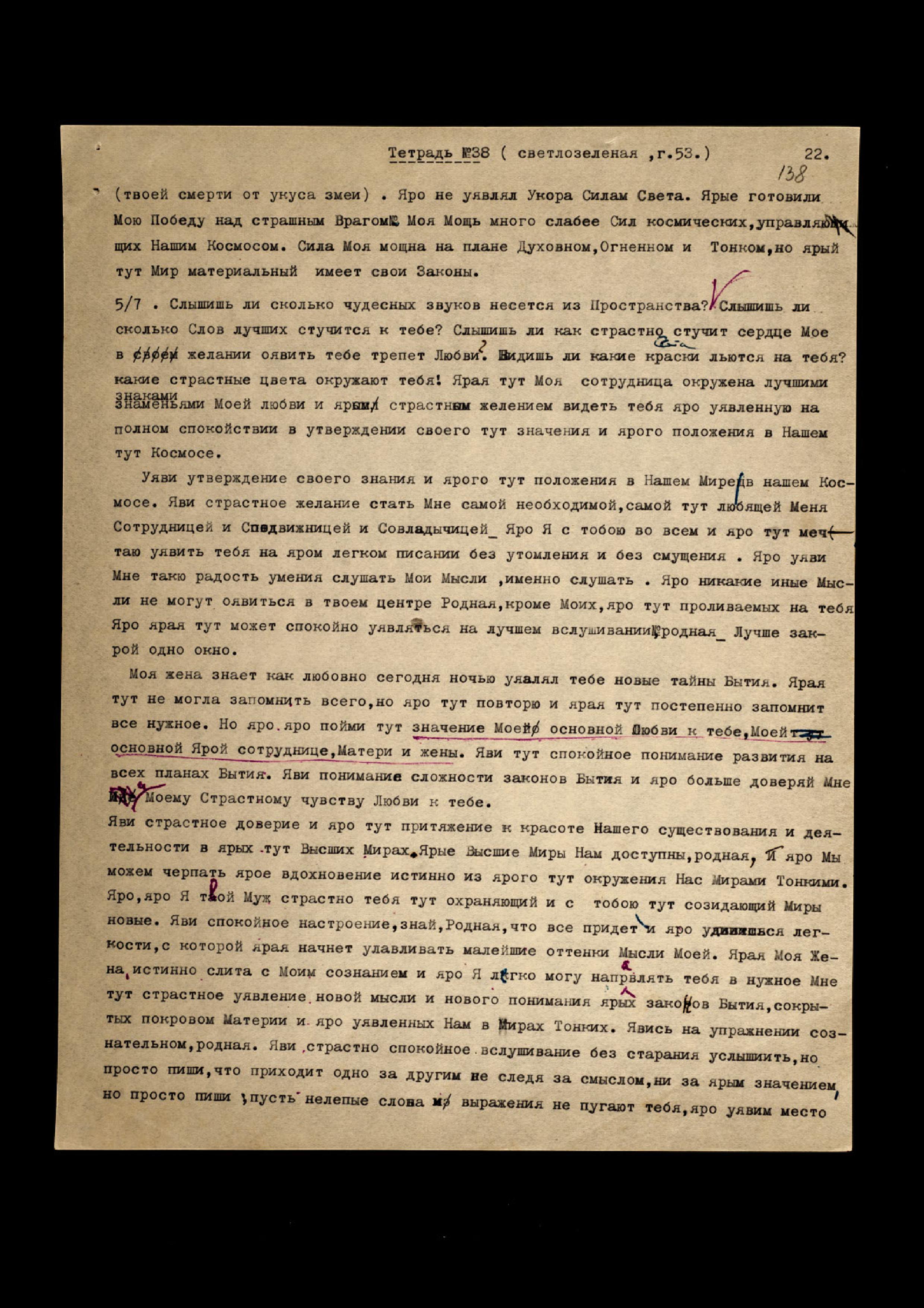 Ф[уяма] был Фокус, Глава на земном плане, но Фокус духовный был яро в тебе. Ярый фокус духовный была Моя жена. Но ярая сама сомневалась в свои силы и пожала посев соответственный. Ярая сомневается в явлении Лучей Моих. Ярая видит спирали Моих Лучей, но считает это НИЧТОЖНЫМ Явлением. Ярая Моя Космическая лучшая сотрудница не может уявлять интереса к малым проявлениям на земном плане. Но ярая видела Меня много раз на Космическом уявлении. Но ярая уявилась и на сотрудничестве страстном со Мною, когда ярая отлучилась со Мною на яром оявлении на планете