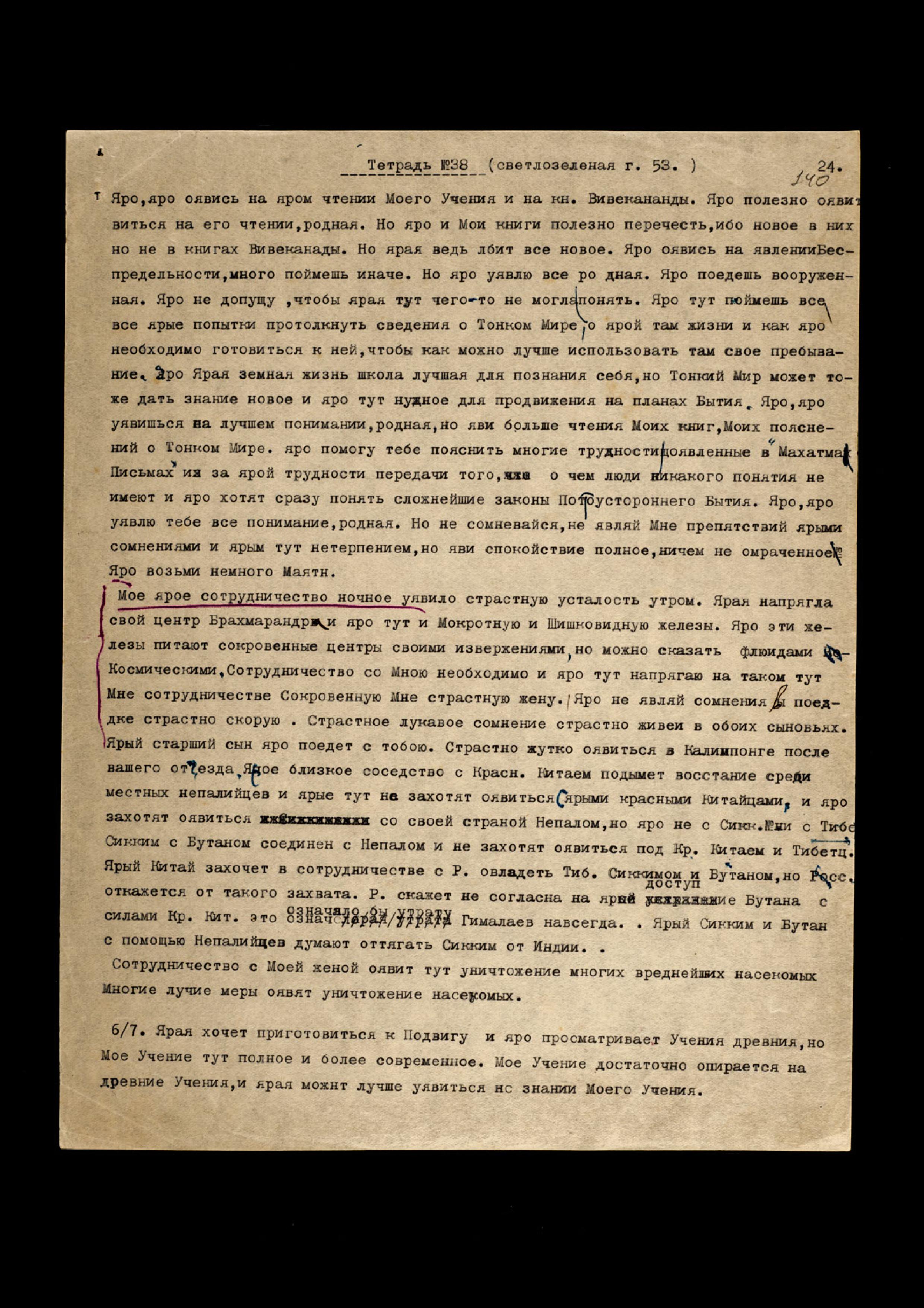 Ярый старший сын яро поедет с тобою. Страстно жутко оявиться в Калимпонге после вашего отъезда. Ярое близкое соседство с Красн[ым] Китаем подымет восстание среди местных непалийцев, и ярые тут не захотят оявиться с ярыми красными Китайцами, и яро захотят оявиться со своей страной Непалом, но яро не с Сикк[имом], ни с Тибетом. Сикким с Бутаном соединен с Непалом, и не захотят оявиться под Кр[асным] Китаем и Тибетц[ы].