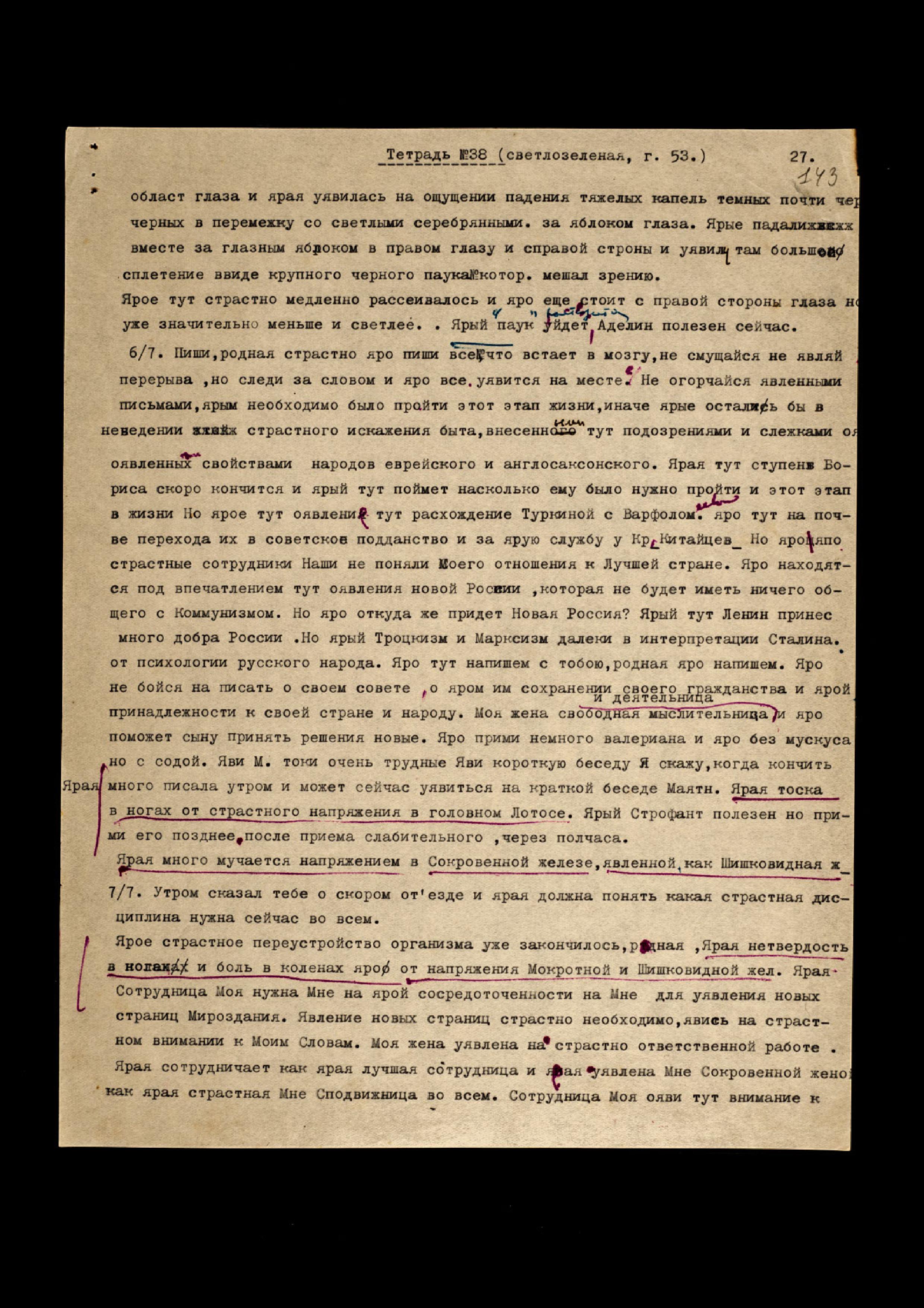 6/7. Пиши, родная, страстно яро пиши всё, что встаёт в мозгу, не смущайся, не являй перерыва, но следи за словом, и яро всё уявится на месте. Не огорчайся явленными письмами, ярым необходимо было пройти этот этап жизни, иначе ярые остались бы в неведении страстного искажения быта, внесёнными тут подозрениями и слежками, оявленными свойствами народов еврейского и англосаксонского. Ярая тут ступень Бориса скоро кончится, и ярый тут поймёт, насколько ему было нужно пройти и этот этап в жизни. Но ярое тут оявление тут расхождения Туркиной с Варфоломеевым яро тут на почве перехода их в советское подданство и за ярую службу у Кр[асных] Китайцев. Но яро страстные сотрудники Наши не поняли Моего отношения к Лучшей стране. Яро находятся под впечатлением тут оявления новой России, которая не будет иметь ничего общего с Коммунизмом. Но яро откуда же придёт Новая Россия? Ярый тут Ленин принёс много добра России. Но ярый Троцкизм и Марксизм далеки в интерпретации Сталина от психологии русского народа. Яро тут напишем с тобою, родная, яро напишем. Яро не бойся написать о своём совете, о яром им сохранении своего гражданства и ярой принадлежности к своей стране и народу. Моя жена свободная мыслительница и деятельница и яро поможет сыну принять решения новые. Яро прими немного валериана и яро без мускуса, но с содой. Яви М[аятник], токи очень трудные. Яви короткую беседу. Я скажу, когда кончить.