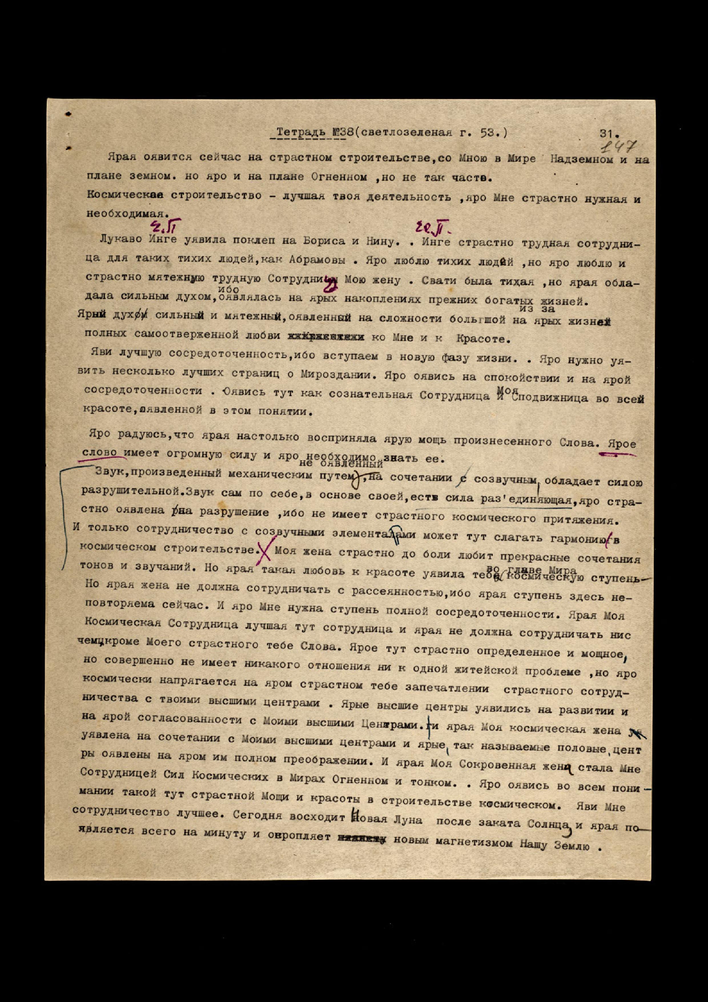 8/7. Задание истинно было не по сознанию сотрудников. Один Ф[уяма] сознавал значение даваемого и данного, но Моя жена не понимала своей Миссии и страстно яро умаляла себя. Ярая не могла понять, что ярая является главной пружиной и ярой Держательницей всего Задания, и ярая постоянно отодвигала себя на третий план, результат был тот, что ярая, вместо Первозванной Сотрудницы, уявилась на яром третьем плане. Ояна заняла твоё место. Космически явление было несоизмеримо, и всё строение рушилось.