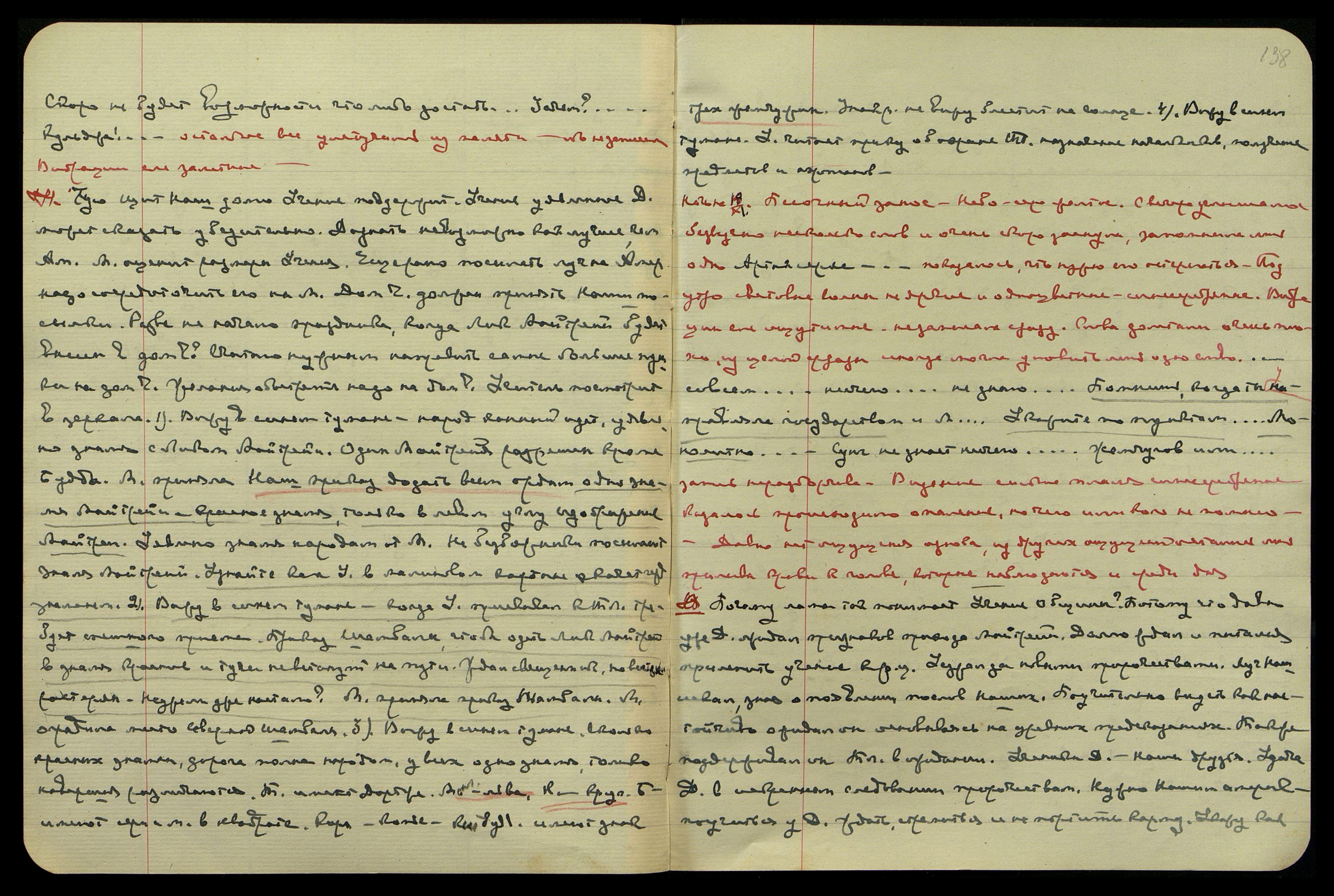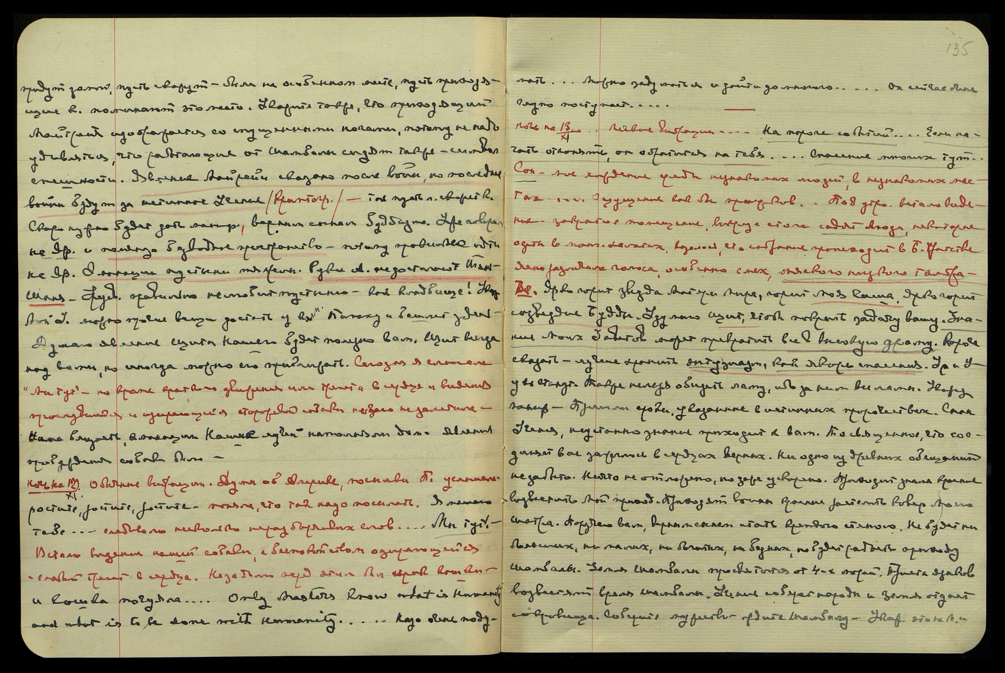 Ночь на 15 ноября. Обычные вибрации, но краткие. I видение: звёздное небо, затем лик М[ахатмы] М. с сеткою на глазах. II видение: тонкая рука, покрытая тёмными пятнами, как бы разложения. Почему-то рука эта связалась с нашим китайцем. "И дураки поймут, куда плывут..." Лёгкое дрожание всей кровати. "И скажу, что значит... Молодые, мои юные сердца... На грех мыши развелись... Я... созвездие Матери Мира... Я скажу, эти холопы неожиданные... Боялся его обидеть... Надо найти, как лучше повесить... Рамзана, Рамзана!.. Я люблю тебя − Adwaitaram... Ну вот что, господа, весь ваш цемент вывалился", − поняла, что это относится к Америке.