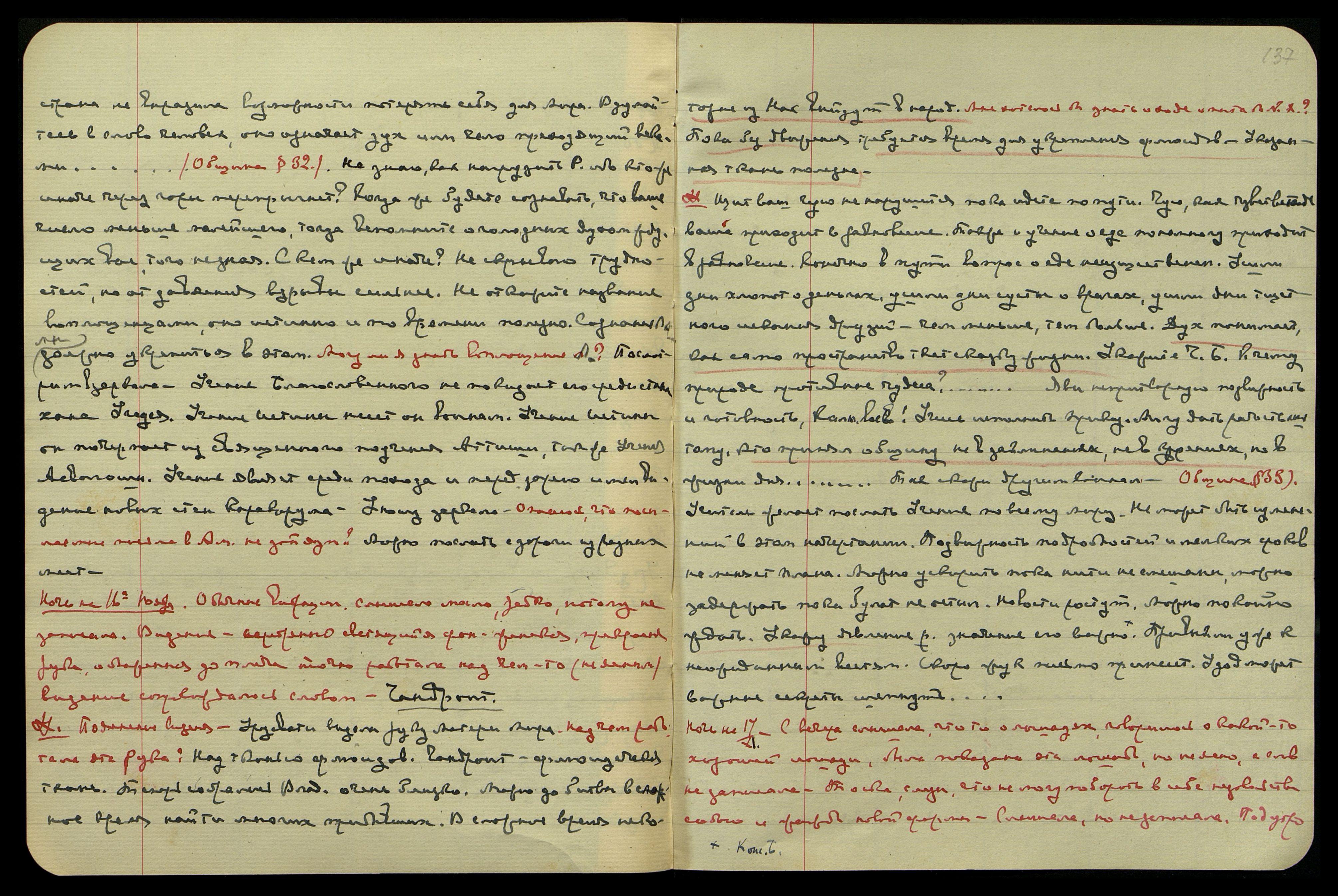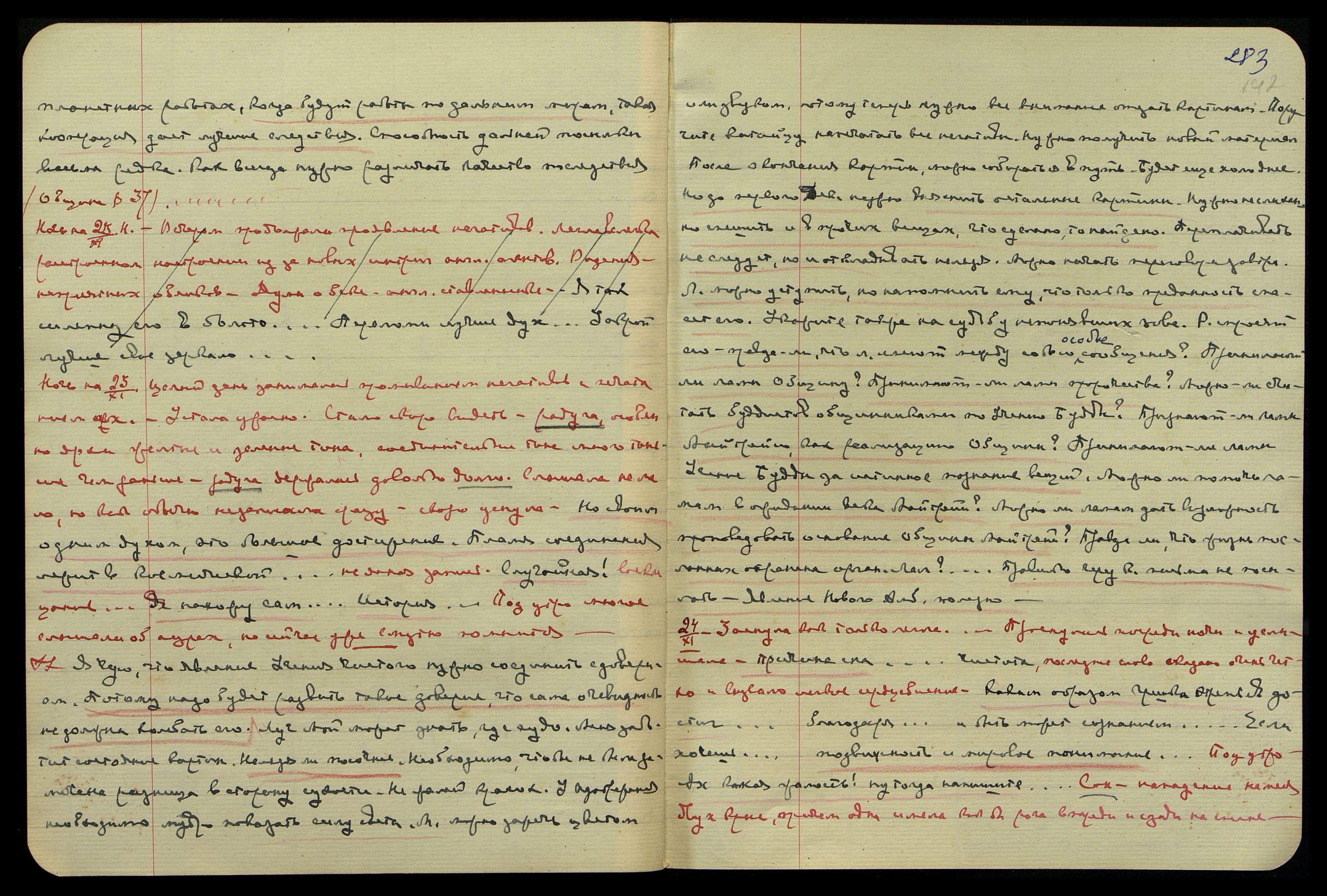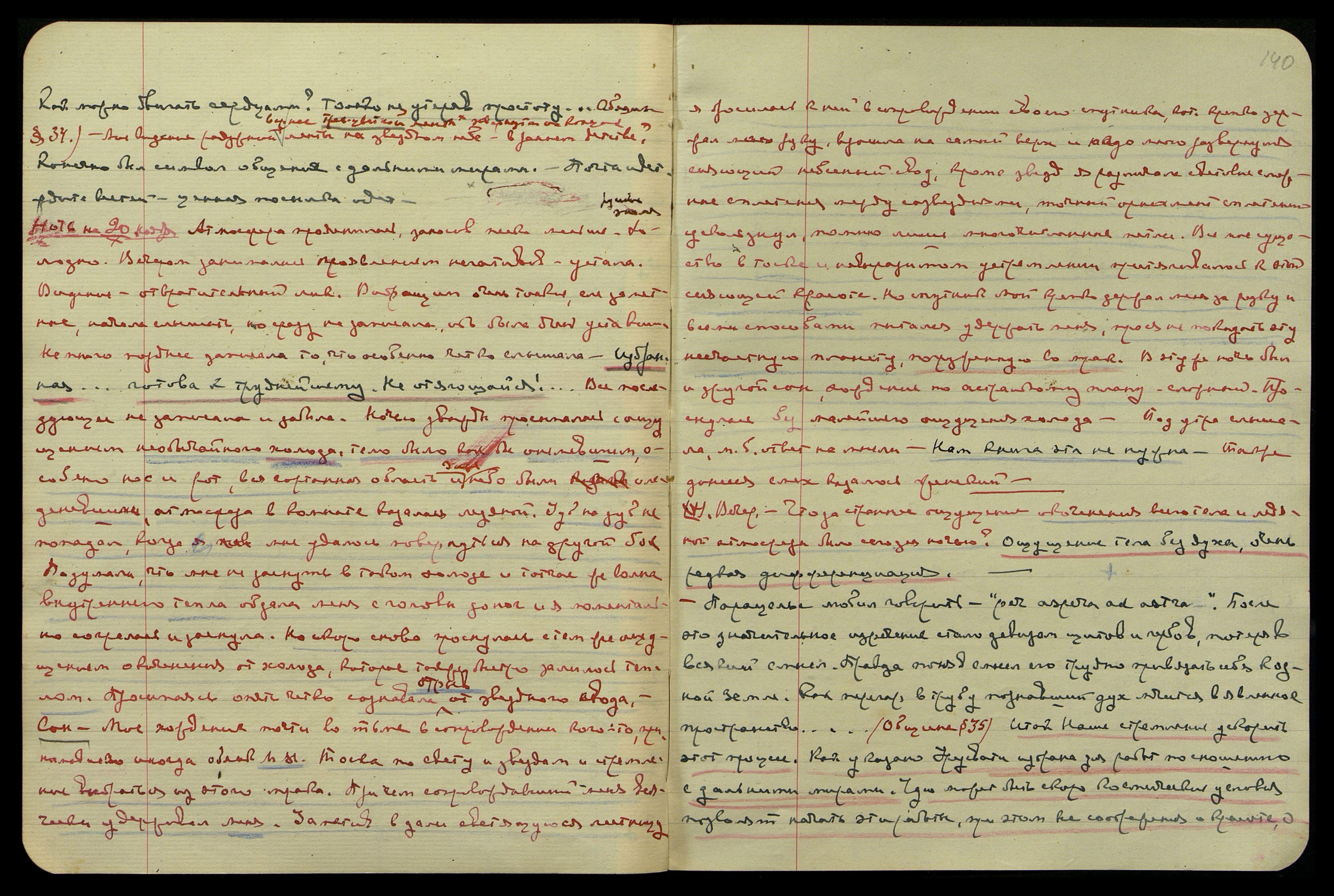 Ночь на 23-ье ноября. Целый день занималась промыванием негативов и печатанием арх[ива]. Устала ужасно. Стала скоро видеть: радуга, особенно ярки жёлтые и зелёные тона, соединительные тона много тоньше, чем раньше − радуга держалась довольно долго. Слышала немало, но, как обычно, не записала сразу, скоро уснула. "Но своим одним духом, это большое достижение. Пламя соединения лежит в космической..." − неясная запись. "Случайная!" − восклицание... "Я нахожу сам... История..."