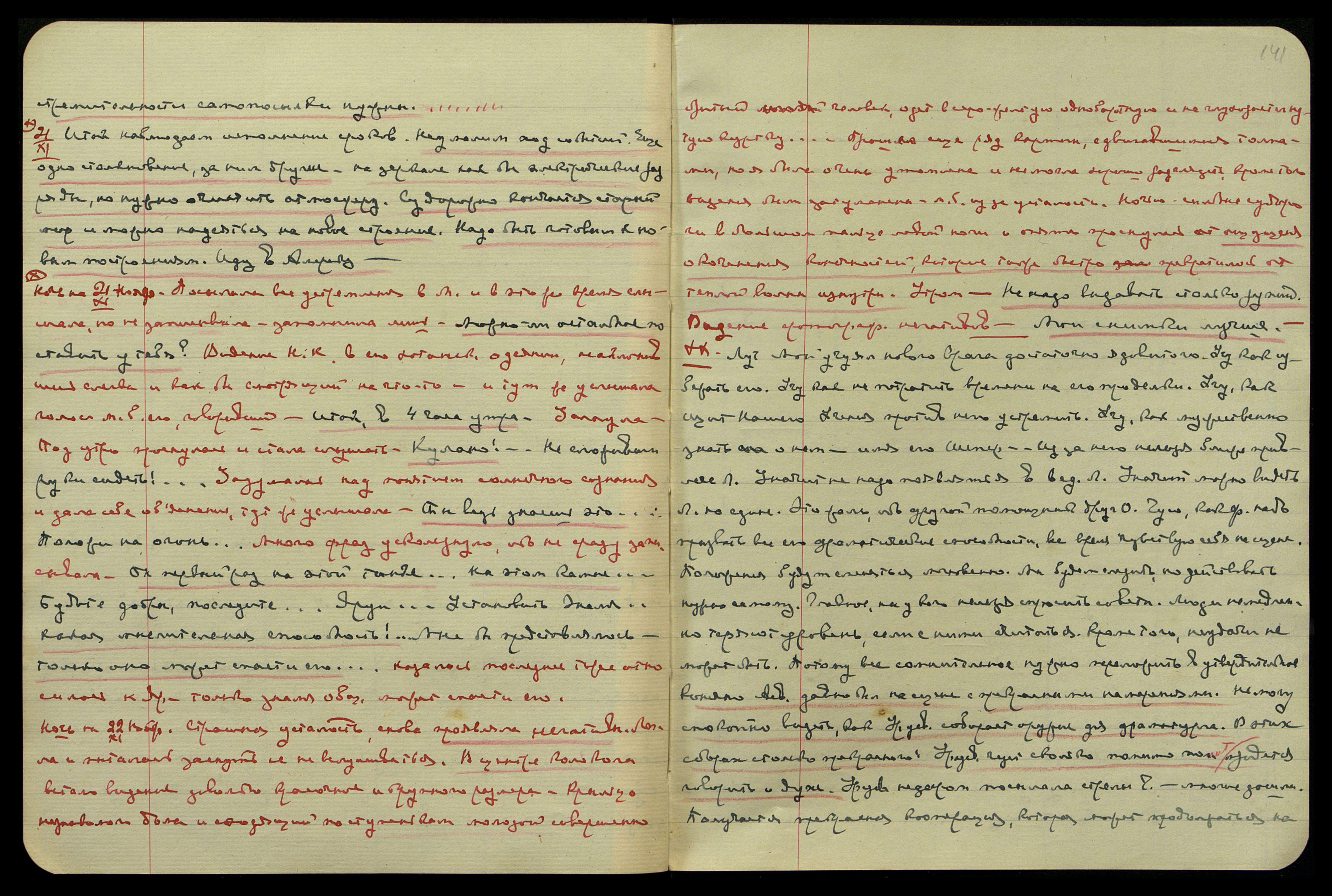 Ночь на 23-ье ноября. Вечером продолжала проявление негативов. Легла в слегка расстроенном настроении из-за новых интриг англ[ийских] агентов. Видения неприятных обликов. Дума о беке − англ[ийском] ставленнике.