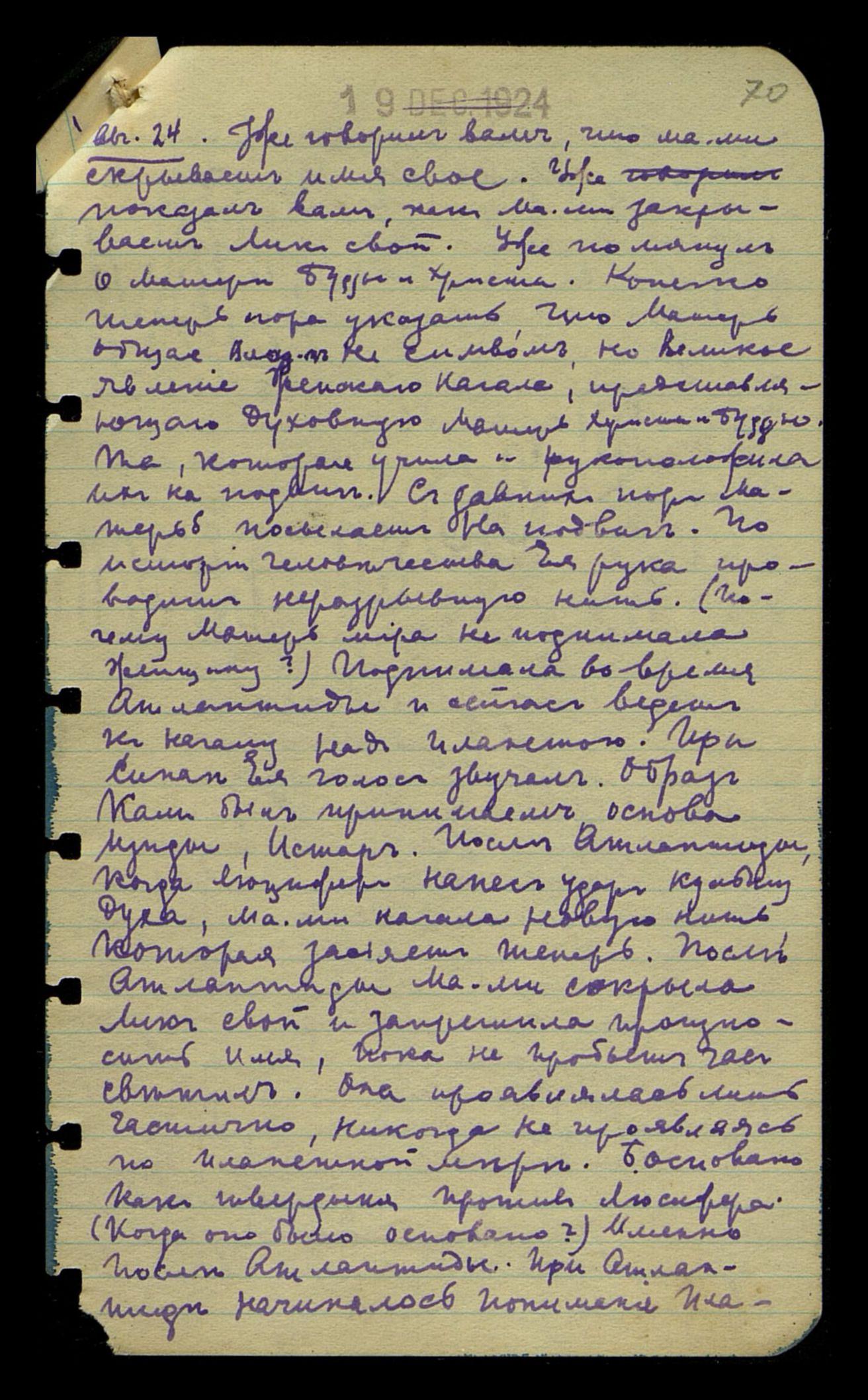 Авг[уст] 24. Уже говорил вам, что ма[терь] ми[ра] скрывает имя свое. Уже показал вам, как Ма[терь] ми[ра] закрывает Лик свой. Уже помянул о Матери Будды и Христа. Конечно, теперь пора указать, что Матерь, общая Влад[ыкам], не символ, но Великое Явление Женского Начала, представляющего духовную Матерь Христа и Будды. Та, которая учила и рукоположила их на подвиг. С давних пор Матерь б[ратства] посылает на подвиг. По истории человечества Ее рука проводит неразрывную нить. (Почему Матерь мира не поднимала женщину?) Поднимала во время Атлантиды и сейчас ведет к началу над планетою. При Синае Её голос звучал. Образ Кали был принимаем; основа Изиды, Истар. После Атлантиды, когда Люцифер нанес удар культу духа, Ма[терь] ми[ра] начала новую нить, которая засияет теперь. После Атлантиды Ма[терь] ми[ра] сокрыла Лик свой и запретила произносить Имя, пока не пробьет час светил. Она проявлялась лишь частично, никогда не проявляясь по планетной мере. Б[ратство] основано как твердыня против Люцифера. (Когда оно было основано?) Именно после Атлантиды. При Атлантиде начиналось понимание Пла-