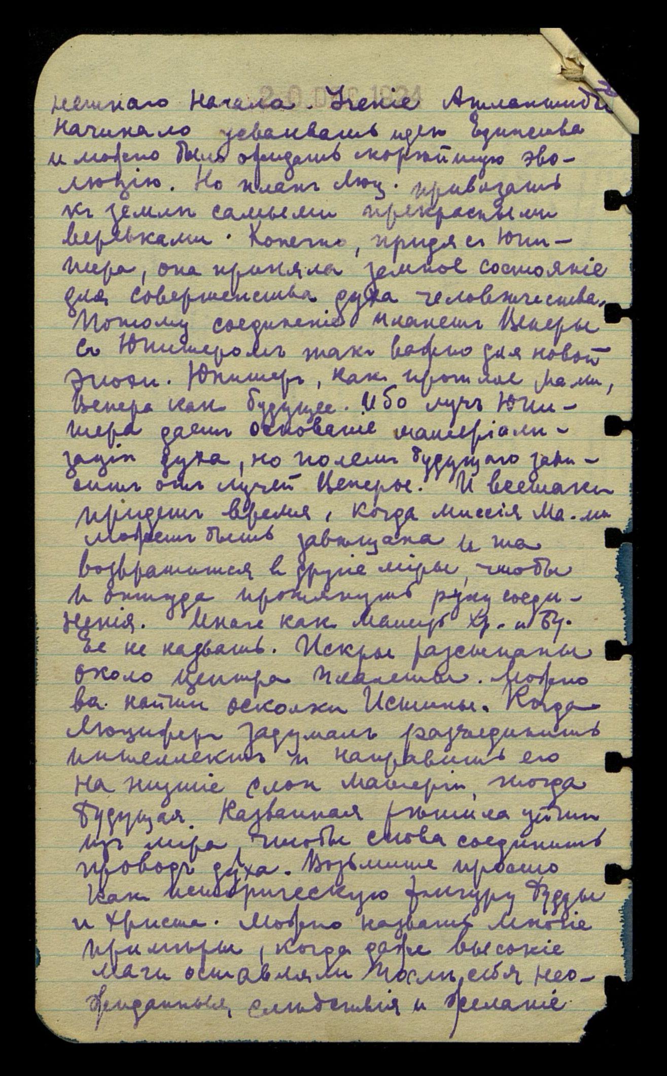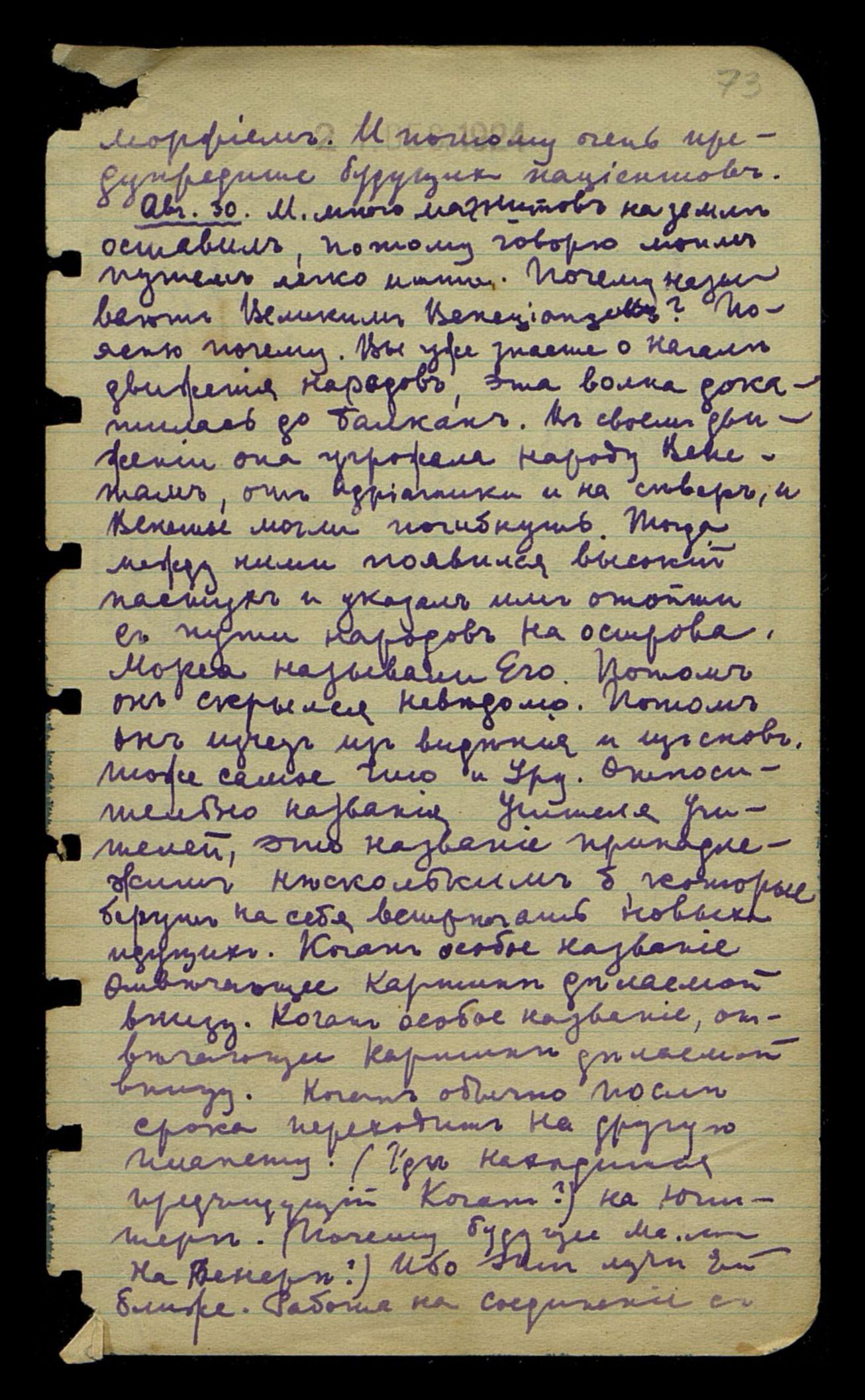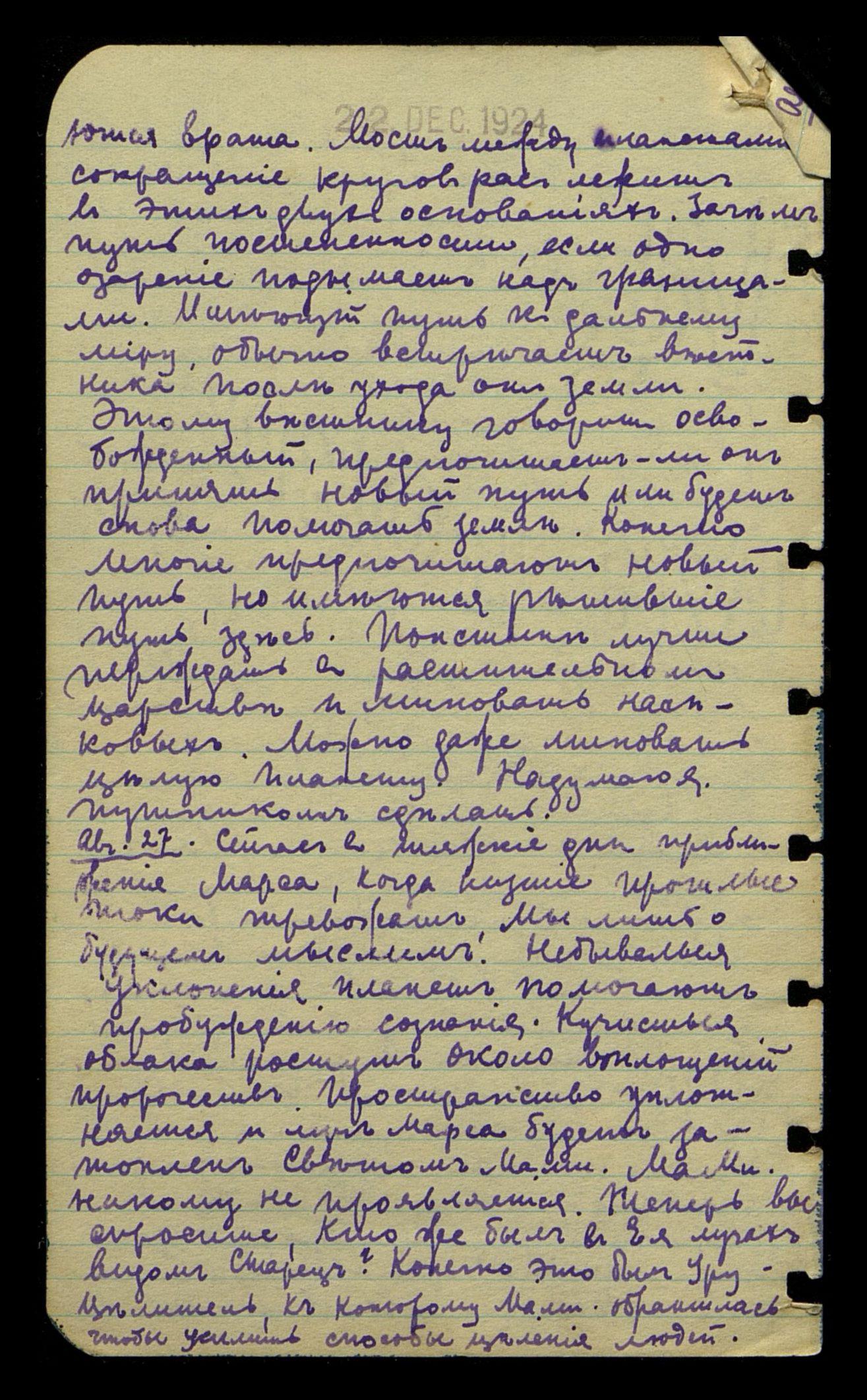 Авг[уст] 29. Указанное перерождение H[elena] P[ietrowna] B[ławatska] было произведено экстренными мерами, но не дало желательных следствий. Предполагалось изменить состав крови, чтобы дать возможность закончить задачу. По двум причинам эффект воздействия оказался кратковре-