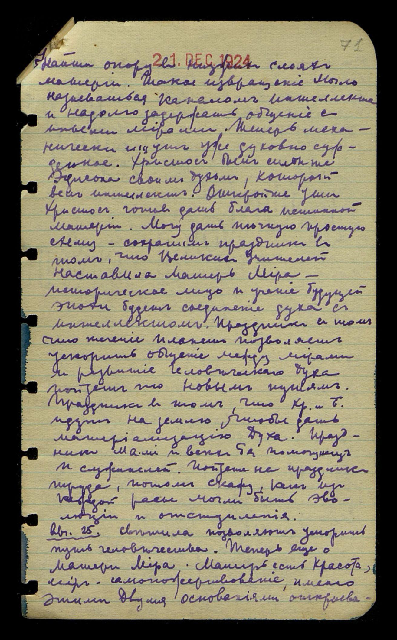 найти опору в низших слоях материи. Такое извращение могло называться каналом интеллекта и надолго задержать общение с иными мирами. Теперь механически ищут уже духовно сужденное. Христос был сильнее Эдисона своим духом, который вел интеллект. Откройте уши, Христос готов дать блага истинной материи. Могу дать точную простую схему: сохраним праздник в том, что Великих Учителей наставила Матерь Мира – историческое лицо, и учение будущей эпохи будет соединение духа с интеллектом. Праздник в том, что течение планет позволяет ускорить общение между мирами и развитие человеческого духа пойдет по новым путям. Праздник в том, что Хр[истос] и Б[удда] идут на землю, чтобы дать материализацию Духа. Праздник Ма[тери] ми[ра] и всех Её помощниц и служителей. Пойдете на праздник труда, потом скажу, как из каждой расы могли быть эволюции и отступления.