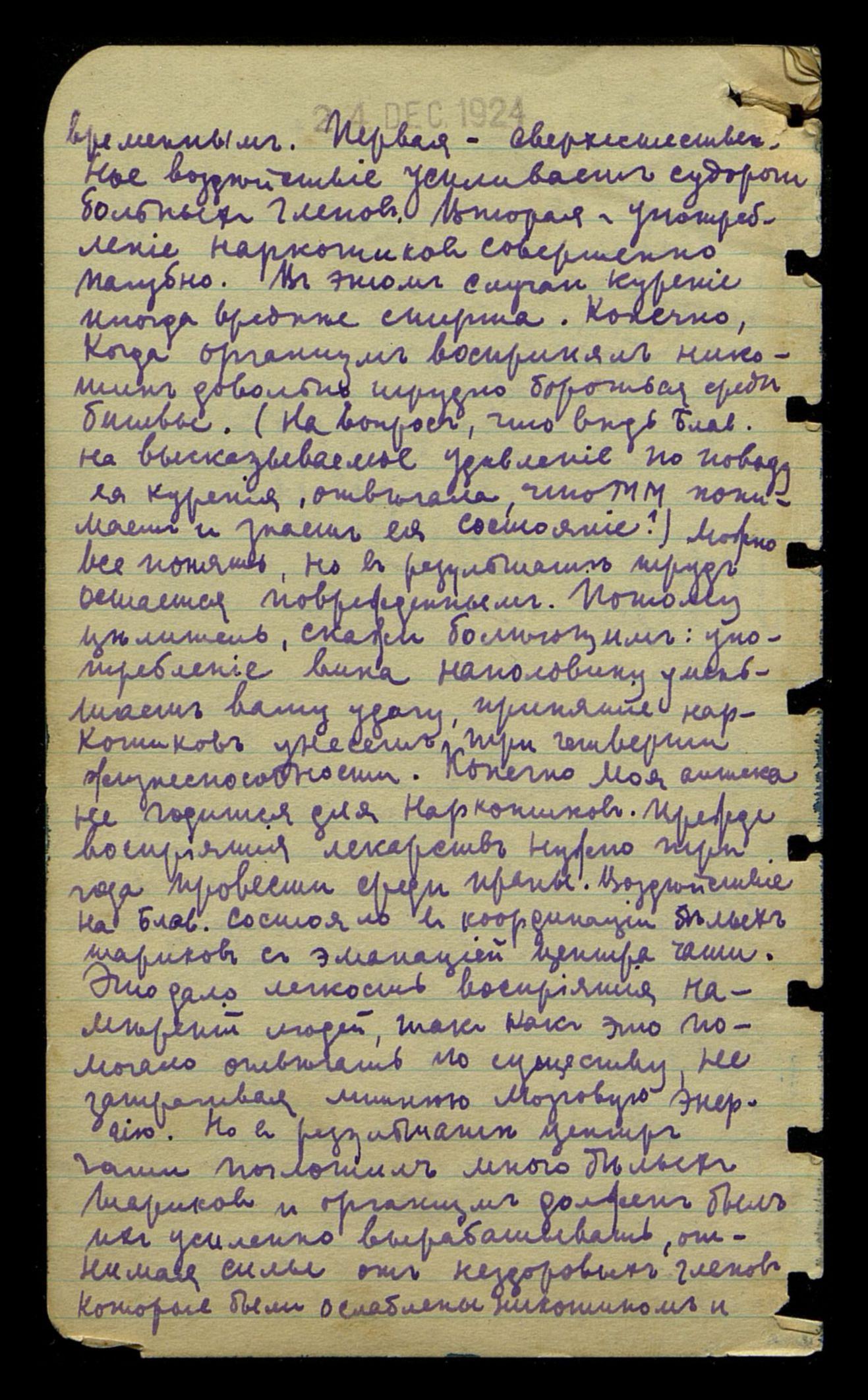 менным. Первая – сверхъестественное воздействие усиливает судороги больных членов. Вторая – употребление наркотиков совершенно пагубно. В этом случае курение иногда вреднее спирта. Конечно, когда организм воспринял никотин, довольно трудно бороться среди битвы. (На вопрос, что ведь Блав[атская] на высказываемое удивление [окружающих] по поводу ее курения отвечала, что М[ахатма] М[ориа] понимает и знает её состояние). Можно все понять, но в результате труд остается поврежденным. Потому, целитель, скажи болеющим: употребление вина наполовину уменьшает вашу удачу, принятие наркотиков унесет три четверти жизнеспособности. Конечно, Моя аптека не годится для наркотиков. Прежде восприятия лекарств нужно три года провести среди праны. Воздействие на Блав[атскую] состояло в координации белых шариков с эманацией центра чаши. Это дало легкость восприятия намерений людей, так как это помогало отвечать по существу, не затрагивая лишнюю мозговую энергию. Но в результате центр чаши поглотил много белых шариков, и организм должен был их усиленно вырабатывать, отнимая силы от нездоровых членов, которые были ослаблены никотином и