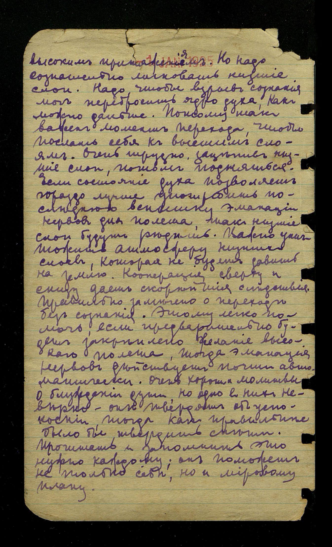 Почему на Юпитер идут лишь немногие, тогда как атмосфера Земли положительно загромождена? Хочется сказать: милые путники, взгляните кверху, и если вместо иллюзий Земли вы захотите лететь дальше, то и крылья вырастут. Между тем вы запрудили теми же жалкими лачугами весь астральный план. Та же клевета, то же призрачное курение, но вы забыли, что от ваших призраков чад идёт. Лучи Солнца меркнут через ваши пиры отупения. Пустые оболочки создают пустые оболочки. (Не могли бы разве лучи уч[ителей] разить эти нагромождения?)