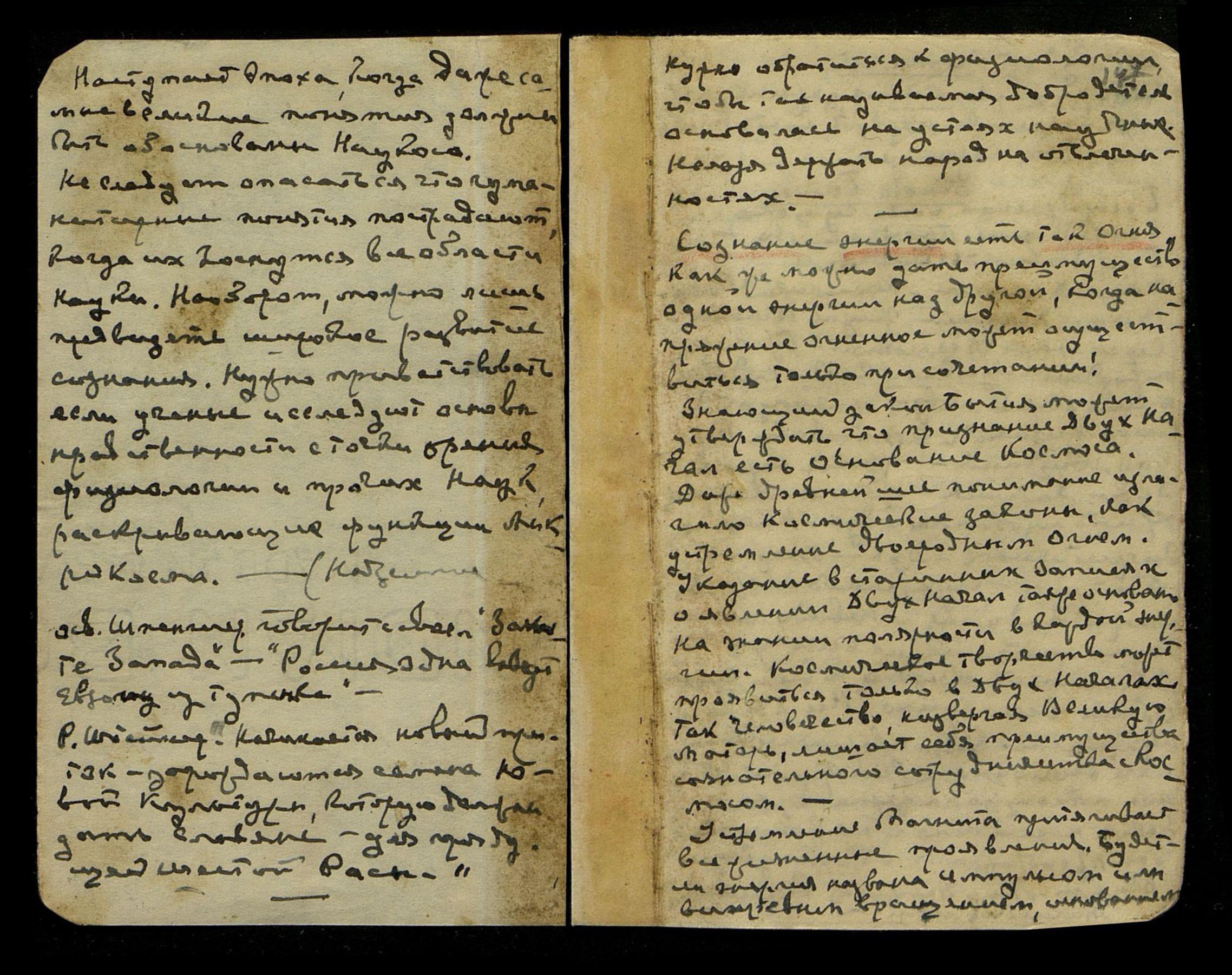 Замечаете, насколько быстро проносятся некоторые слова. Не нужно думать, что это зависит лишь от посылающего, ищите причину в химических вихрях, кот[орые] вы уже наблюдали. Только с великим терпением можно преодолевать такие пространственные условия. Но можно быть уверенным, что и такие быстрые мысли остаются в тонкой памяти. (366. Бр[атство])