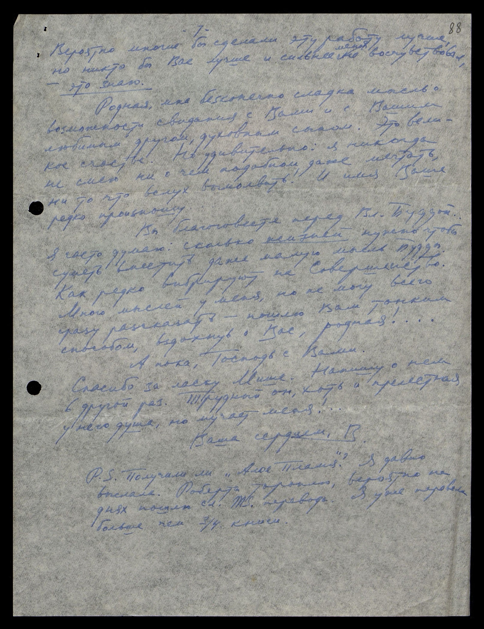 P.S. Получали ли «Алое Пламя»? Я давно выслала. Роберта тороплю, вероятно, на дня пошлю сл[едующие] MS перевода. Я уже перевела больше, чем ¾ книги.