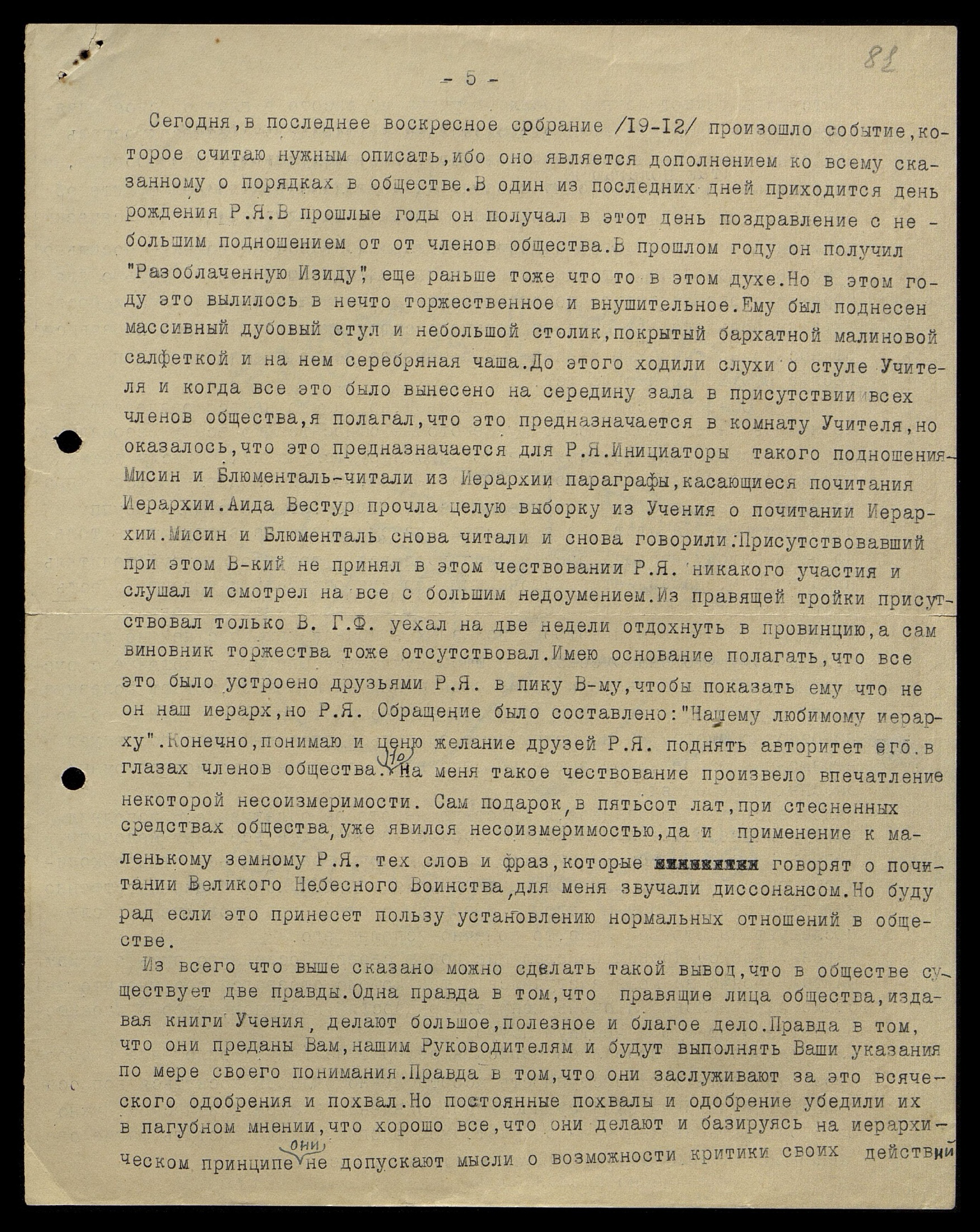 Сегодня, в последнее воскресное собрание (19-12) произошло событие, которое считаю нужным описать, ибо оно является дополнением ко всему сказанному о порядках в обществе. В один из последних дней приходится день рождения Рихарда Яковлевича. В прошлые годы он получал в этот день поздравление с небольшим подношением от членов общества. В прошлом году он получил "Разоблачённую Изиду", еще раньше тоже что-то в этом духе. Но в этом году это вылилось в нечто торжественное и внушительное. Ему был поднесен массивный дубовый стул и небольшой столик, покрытый бархатной малиновой салфеткой и на нем серебряная чаша. До этого ходили слухи о стуле Учителя и когда все это было вынесено на середину зала в присутствии всех членов общества, я полагал, что это предназначается в комнату Учителя, но оказалось, что это предназначается для Рихарда Яковлевича. Инициаторы такого подношения - Мисин и Блюменталь - читали из Иерархии параграфы, касающиеся почитания Иерархии. Аида Вестур прочла целую выборку из Учения о почитании Иерархии. Мисин и Блюменталь снова читали и снова говорили. Присутствовавший при этом Волковский не принял в этом чествовании Рихарда Яковлевича никакого участия и слушал, и смотрел на все с большим недоумением. Из правящей тройки присутствовал только Волковский. Гаральд Феликсович уехал на две недели отдохнуть в провинцию, а сам виновник торжества тоже отсутствовал. Имею основание полагать, что все это было устроено друзьями Рихарда Яковлевича в пику Волковскому, чтобы показать ему, что не он наш иерарх, но Рихард Яковлевич. Обращение было составлено: "Нашему любимому иерарху". Конечно, понимаю и ценю желание друзей Рихарда Яковлевича поднять авторитет его в глазах членов общества. Но на меня такое чествование произвело впечатление некоторой несоизмеримости. Сам подарок в пятьсот лат при стеснённых средствах общества, уже явился несоизмеримостью, да и применение к маленькому земному Рихарду Яковлевичу тех слов и фраз, которые говорят о почитании Великого Небесного Воинства, для меня звучали диссонансом. Но буду рад, если это принесёт пользу установлению нормальных отношений в обществе.