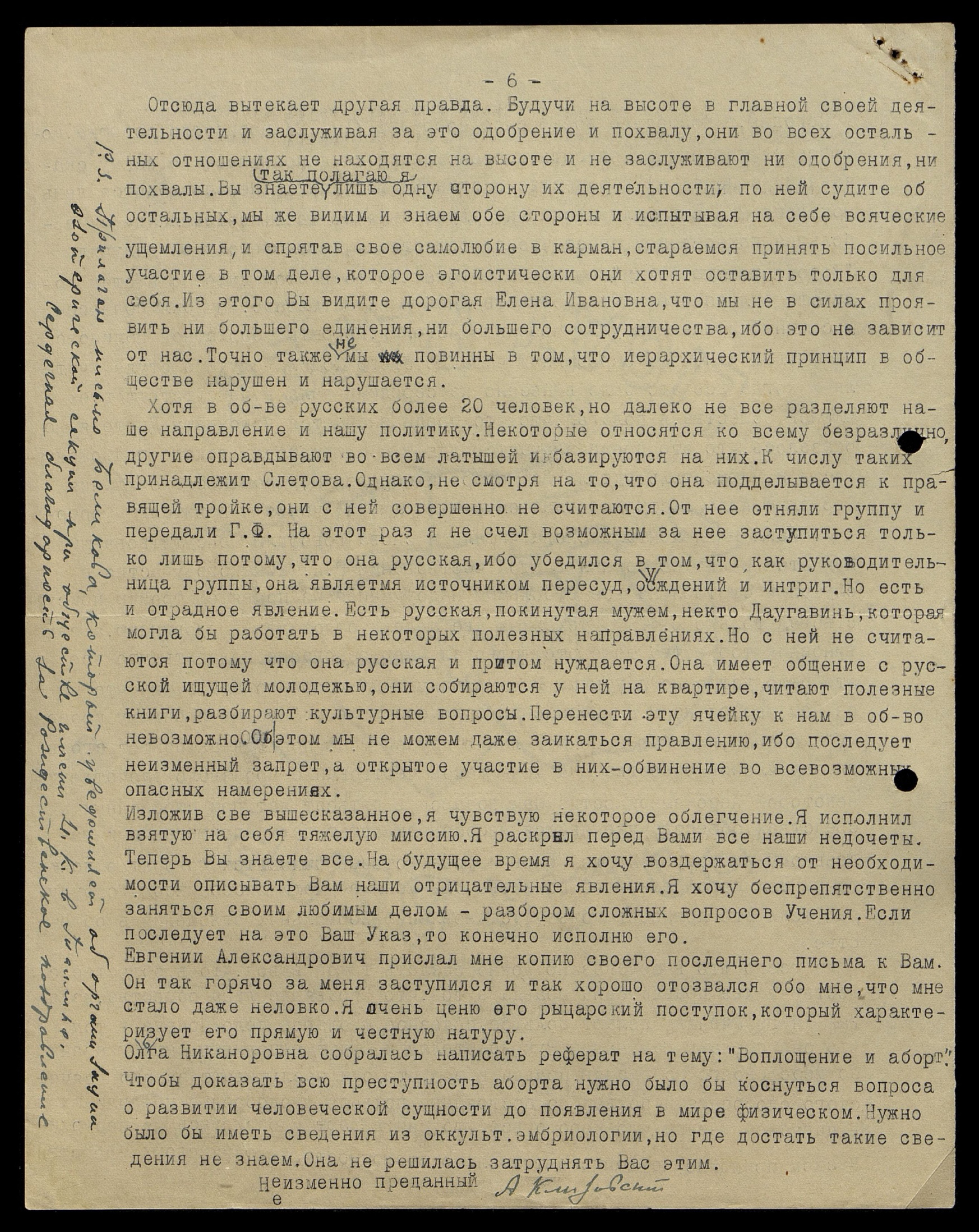 Отсюда вытекает другая правда. Будучи на высоте в главной своей деятельности и заслуживая за это одобрение и похвалу, они во всех остальных отношениях не находятся на высоте и не заслуживают ни одобрения, ни похвалы. Вы знаете, как полагаю я, лишь одну сторону их деятельности, по ней судите об остальных, мы же видим и знаем обе стороны, и испытывая на себе всяческие ущемления, и спрятав свое самолюбие в карман, стараемся принять посильное участие в том деле, которое эгоистически они хотят оставить только для себя. Из этого Вы видите, дорогая Елена Ивановна, что мы не в силах проявить ни большего единения, ни большего сотрудничества, ибо это не зависит от нас. Точно также не мы повинны в том, что иерархический принцип в обществе нарушен и нарушается.