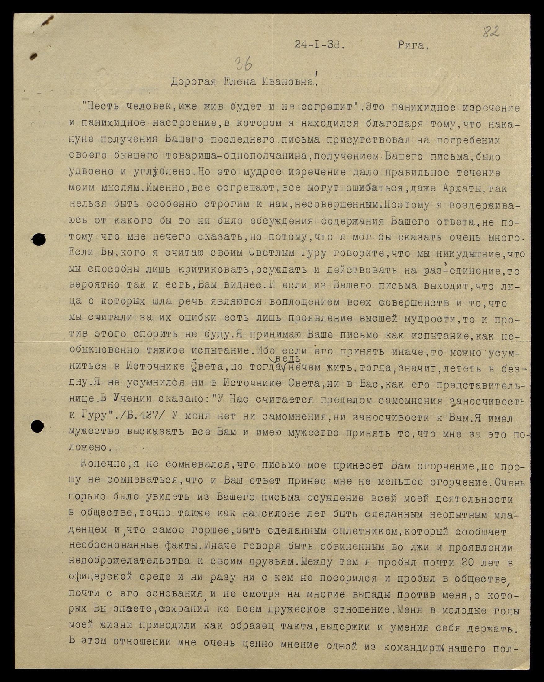 "Несть человек, иже жив будет и не согрешит". Это панихидное изречение и панихидное настроение, в котором я находился благодаря тому, что накануне получения Вашего последнего письма присутствовал на погребении своего бывшего товарища-однополчанина, получением Вашего письма, было удвоено и углублено. Но это мудрое изречение дало правильное течение моим мыслям. Именно, все согрешают, все могут ошибаться, даже Архаты, так нельзя быть особенно строгим к нам, несовершенным. Поэтому я воздерживаюсь от какого бы то ни было обсуждения содержания Вашего ответа, не потому что мне нечего сказать, но потому, что я мог бы сказать очень много. Если Вы, кого я считаю своим Светлым Гуру говорите, что мы никудышние, что мы способны лишь критиковать, осуждать и действовать на разъединение, то вероятно так и есть, Вам виднее. И если из Вашего письма выходит, что лица о которых шла речь являются воплощением всех совершенств и то, что мы считали за их ошибки, есть лишь проявление высшей мудрости, то и против этого спорить не буду. Я принимаю Ваше письмо как испытание, как необыкновенно тяжкое испытание. Ибо если его понять иначе, то можно усомниться в Источнике Света, но тогда ведь нечем жить, тогда, значит, лететь в бездну. Я не усомнился ни в Источнике Света, ни в Вас, как его представительнице. В Учении сказано: "У Нас считается пределом самомнения заносчивость к Гуру" ("Беспредельность", § 427). У меня нет ни самомнения, ни заносчивости к Вам. Я имел мужество высказать всё Вам и имею мужество принять то, что мне за это положено.