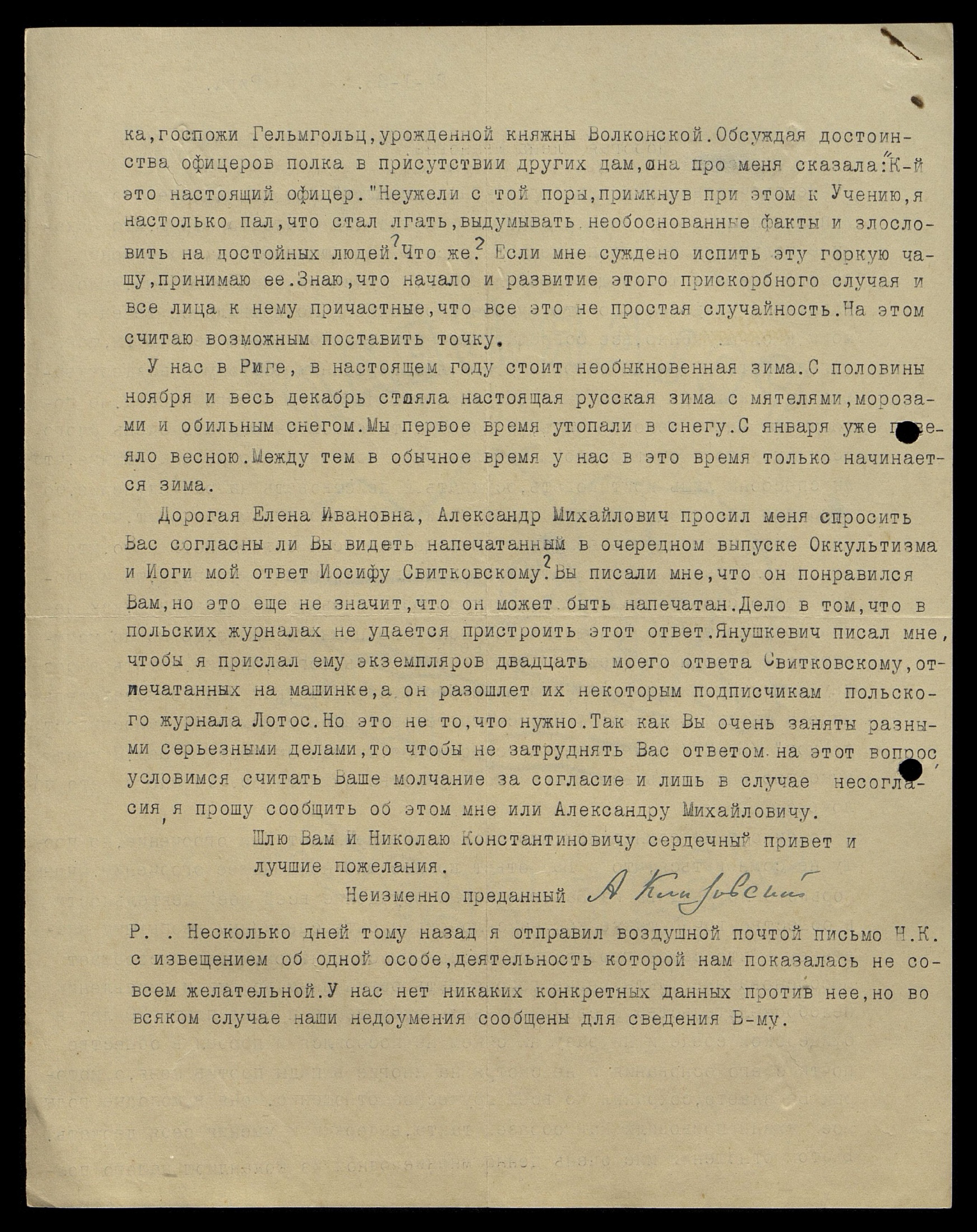 Дорогая Елена Ивановна, Александр Михайлович [Асеев] просил меня спросить Вас, согласны ли Вы видеть напечатанным в очередном выпуске "Оккультизма и Йоги" мой ответ Иосифу Свитковскому? Вы писали мне, что он понравился Вам, но это еще не значит, что он может быть напечатан. Дело в том, что в польских журналах не удается пристроить этот ответ. Янушкевич писал мне, чтобы я прислал ему экземпляров двадцать моего ответа Витковскому, отпечатанных на машинке, а он разошлет их некоторым подписчикам польского журнала Лотос. Но это не то, что нужно. Так как Вы очень заняты разными серьезными делами, то чтобы не затруднять Вас ответом, на этот вопрос условимся считать Ваше молчание за согласие и лишь в случае несогласия я прошу сообщить об этом мне или Александру Михайловичу.