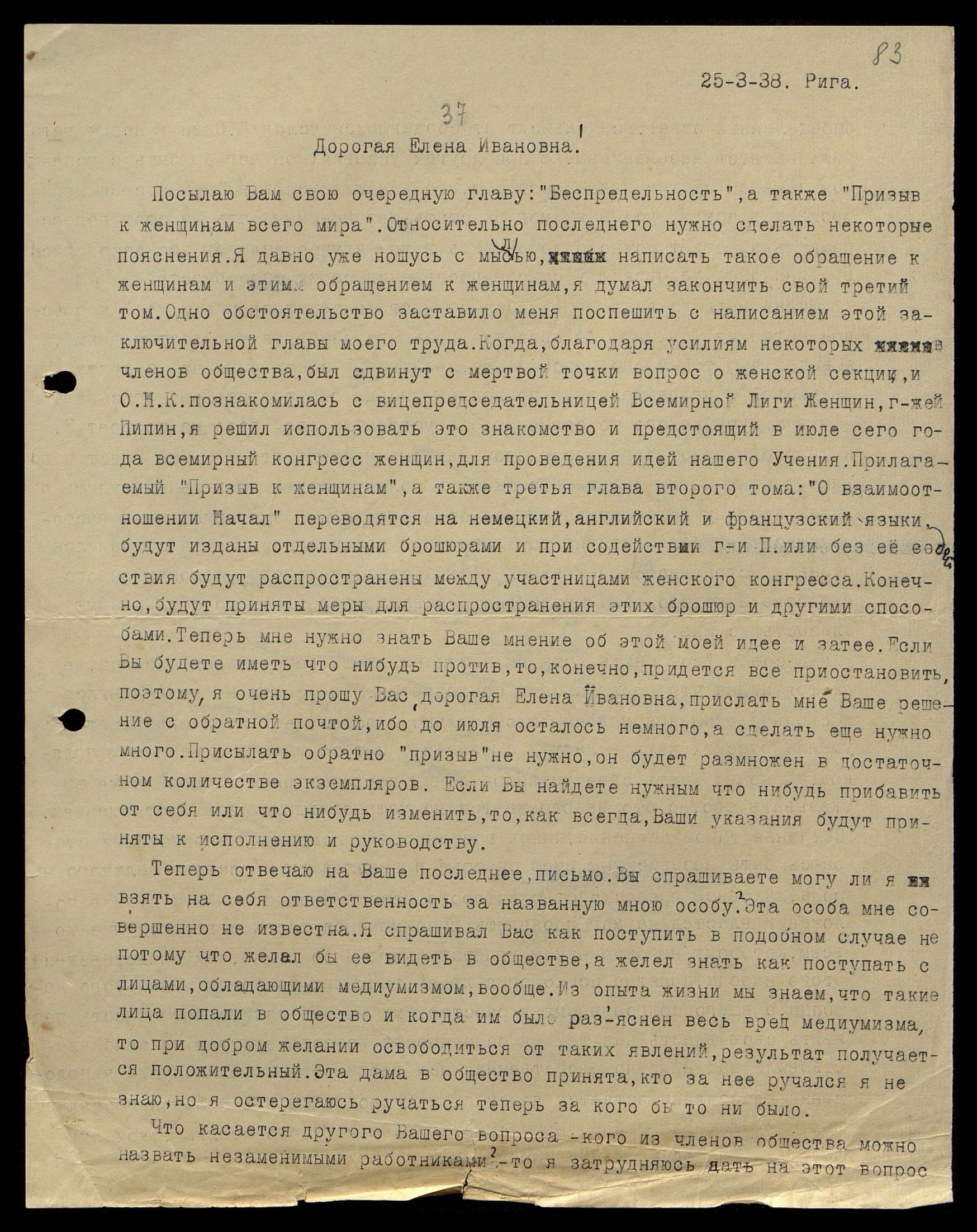 Посылаю Вам свою очередную главу "Беспредельность", а также "Призыв к женщинам всего мира". Относительно последнего нужно сделать некоторые пояснения. Я давно уже ношусь с мыслью, написать такое обращение к женщинам и этим обращением к женщинам, я думал закончить свой третий том. Одно обстоятельство заставило меня поспешить с написанием этой заключительной главы моего труда. Когда благодаря усилиям некоторых членов общества, был сдвинут с мертвой точки вопрос о женской секции, и Ольга Никаноровна Крауклис познакомилась с вице-председательницей Всемирной Лиги Женщин, г-жой Пипин, я решил использовать это знакомство и предстоящий в июле сего года всемирный конгресс женщин для проведения идей нашего Учения. Прилагаемый "Призыв к женщинам", а также третья глава второго тома "О взаимоотношении Начал" переводятся на немецкий, английский и французский языки, будут изданы отдельными брошюрами и при содействии г-жи Пипин или без её содействия будут распространены между участницами женского конгресса. Конечно, будут приняты меры для распространения этих брошюр и другими способами. Теперь мне нужно знать Ваше мнение об этой моей идее и затее. Если Вы будете иметь что-нибудь против, то, конечно, придется все приостановить, поэтому я очень прошу Вас, дорогая Елена Ивановна, прислать мне Ваше решение с обратной почтой, ибо до июля осталось немного, а сделать еще нужно много. Присылать обратно "Призыв" не нужно, он будет размножен в достаточном количестве экземпляров. Если Вы найдете нужным что-нибудь прибавить от себя или что-нибудь изменить, то, как всегда, Ваши указания будут приняты к исполнению и руководству.