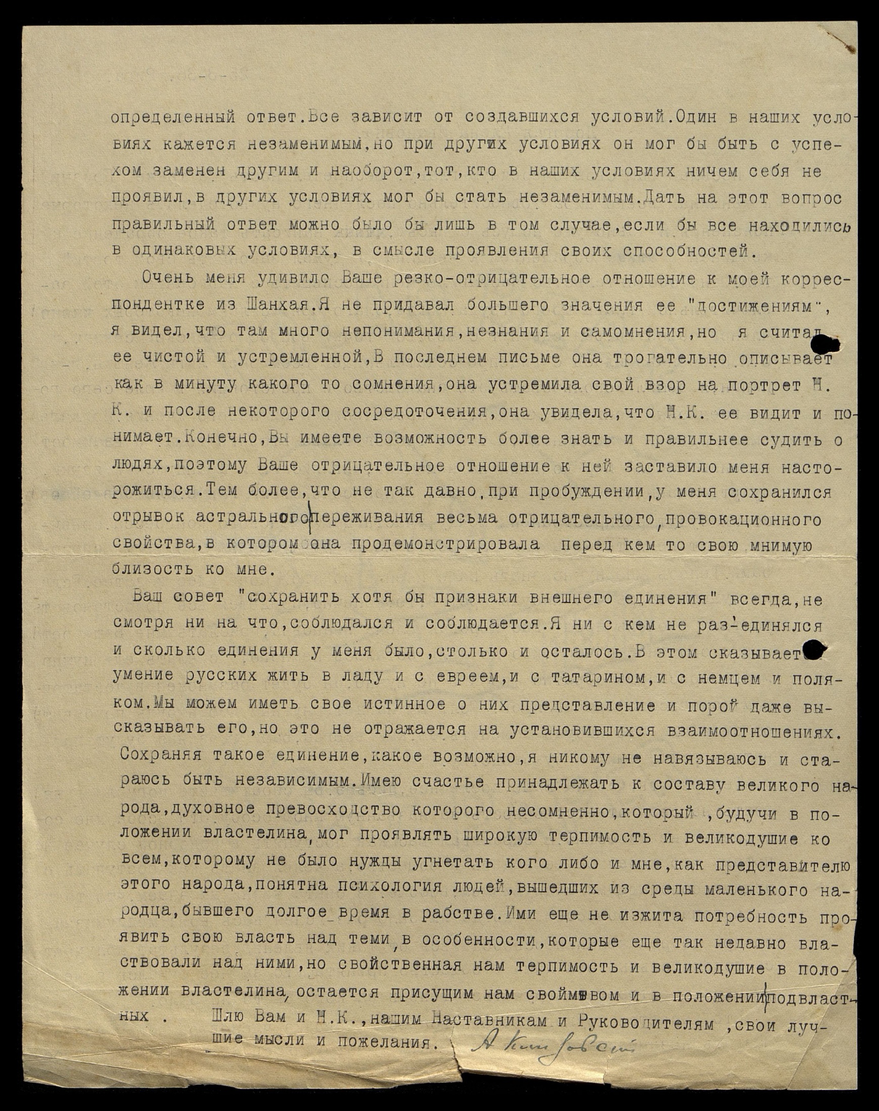 Очень меня удивило Ваше резко-отрицательное отношение к моей корреспондентке из Шанхая. Я не придавал большего значения её "достижениям", я видел, что там много непонимания, незнания и самомнения, но я считал её чистой и устремленной. В последнем письме она трогательно описывает, как в минуту какого-то сомнения она устремила свой взор на портрет Н.К. и после некоторого сосредоточения она увидела, что Н.К. её видит и понимает. Конечно, Вы имеете возможность более знать и правильнее судить о людях, поэтому Ваше отрицательное отношение к ней заставило меня насторожиться. Тем более, что не так давно при пробуждении у меня сохранился отрывок астрального переживания весьма отрицательного, провокационного свойства, в котором она продемонстрировала перед кем то свою мнимую близость ко мне.