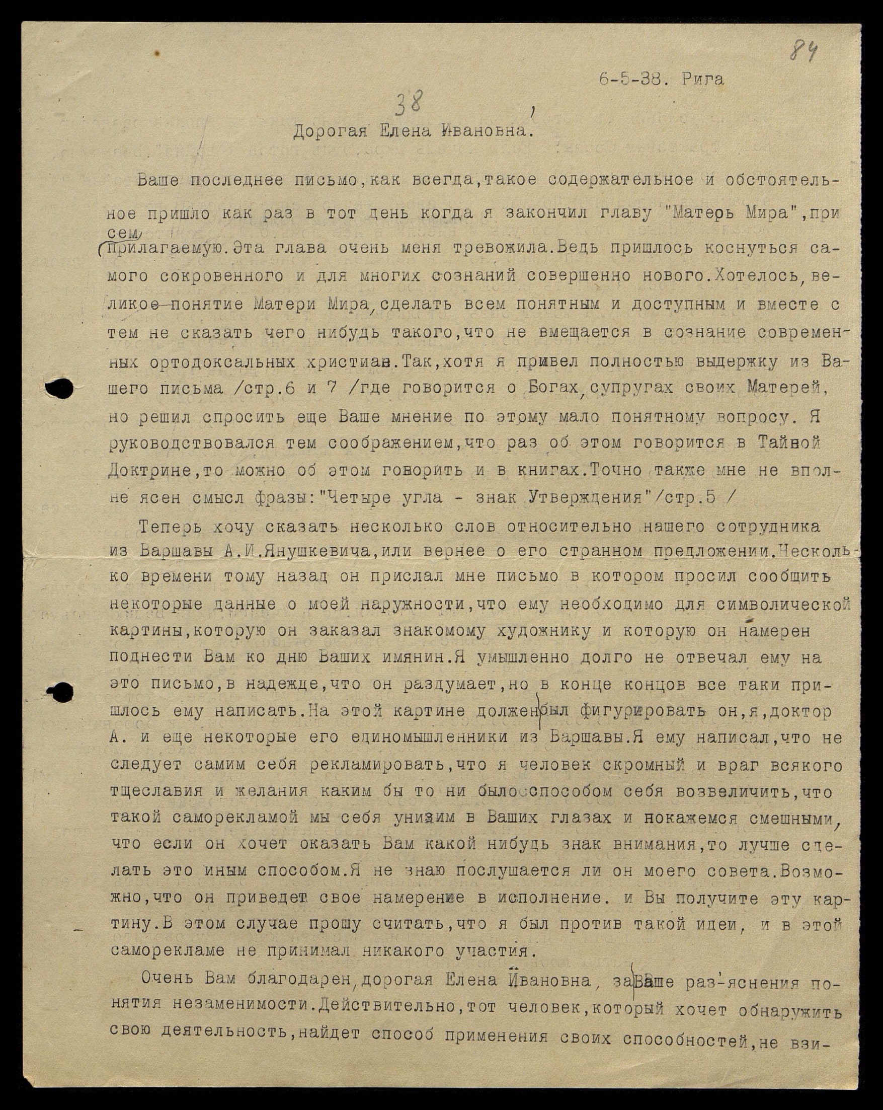 Ваше последнее письмо, как всегда, такое содержательное и обстоятельное пришло как раз в тот день, когда я закончил главу "Матерь Мира", при сем прилагаемою. Эта глава очень меня тревожила. Ведь пришлось коснуться самого сокровенного и для многих сознаний совершенно нового. Хотелось великое понятие Матери Мира сделать всем понятным и доступным, и вместе с тем не сказать чего-нибудь такого, что не вмещается в сознание современных ортодоксальных христиан. Так, хотя я привел полностью выдержку из Вашего письма (стр. 6 и 7), где говорится о Богах, супругах своих Матерей, но решил спросить ещё Ваше мнение по этому мало понятному вопросу. Я руководствовался тем соображением, что раз об этом говорится в "Тайной Доктрине", то можно об этом говорить и в книгах. Точно также мне не вполне ясен смысл фразы: "Четыре угла - знак Утверждения" (стр. 5).