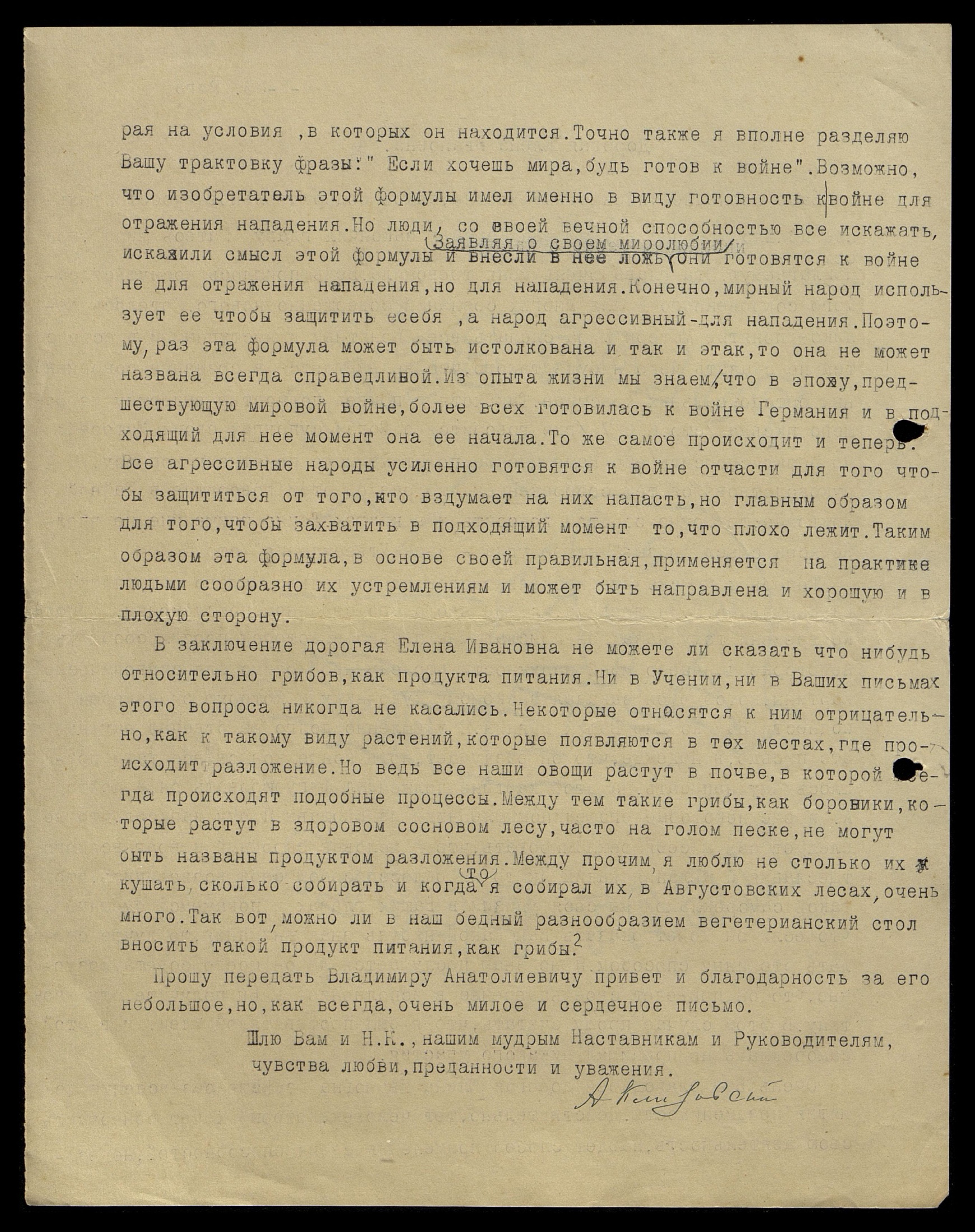 Р.S. Несколько дней тому назад я отправил воздушной почтой письмо Н.К. с извещением об одной особе, деятельность которой нам показалась не совсем желательной. У нас нет никаких конкретных данных против нее, но во всяком случае наши недоумения сообщены для сведения Волковскому.