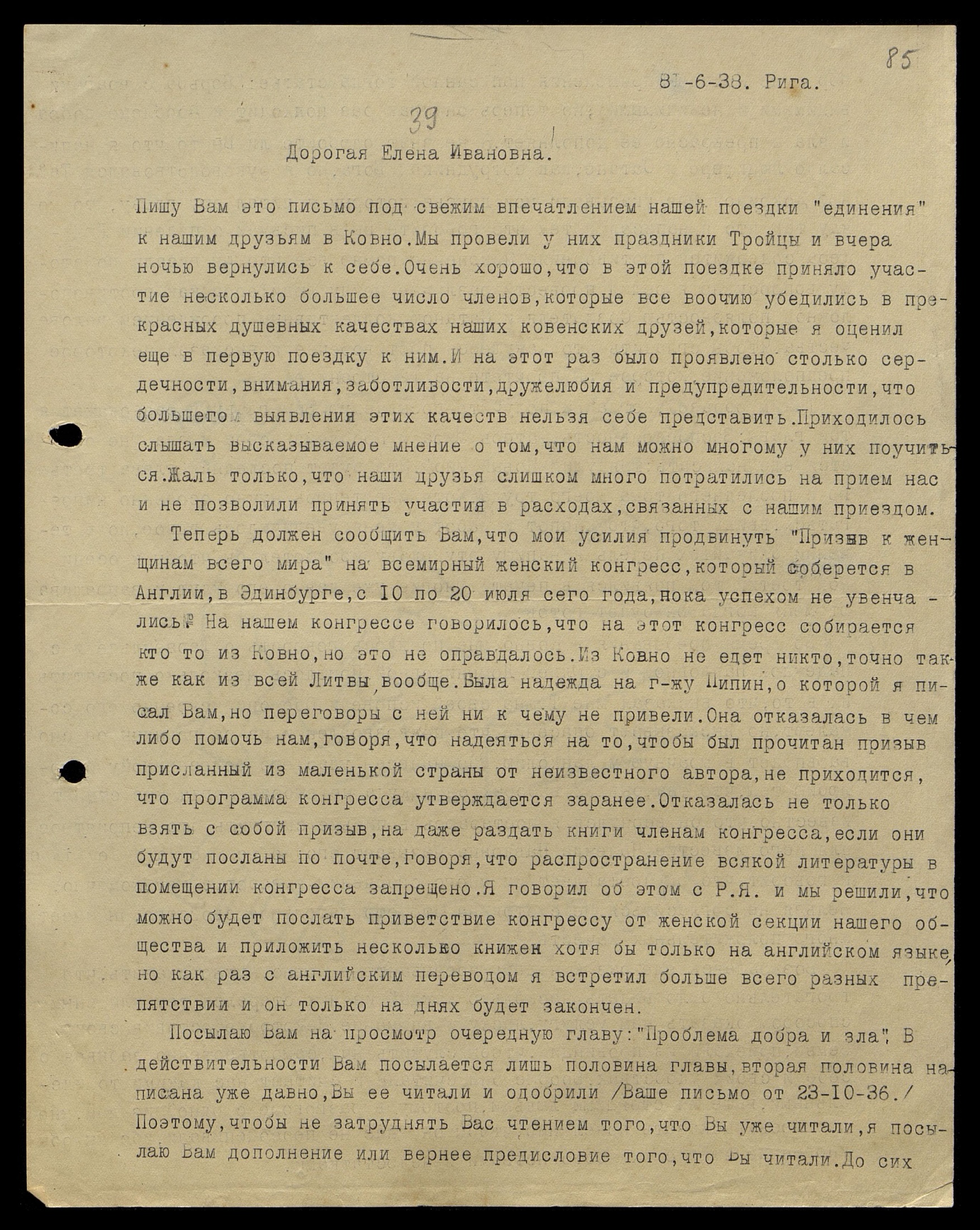 Теперь должен сообщить Вам, что мои усилия продвинуть "Призыв к женщинам всего мира" на всемирный женский конгресс, который соберется в Англии, в Эдинбурге, с 10 по 20 июля сего года, пока успехом не увенчались. На нашем конгрессе говорилось, что на этот конгресс собирается кто-то из Ковно, но это не оправдалось. Из Ковно не едет никто, точно также как из всей Литвы, вообще. Была надежда на г-жу Пипин, о которой я писал Вам, но переговоры с ней ни к чему не привели. Она отказалась в чем-либо помочь нам, говоря, что надеяться на то, чтобы был прочитан призыв, присланный из маленькой страны от неизвестного автора, не приходится, что программа конгресса утверждается заранее. Отказалась не только взять с собой призыв, но даже раздать книги членам конгресса, если они будут посланы по почте, говоря, что распространение всякой литературы в помещении конгресса запрещено. Я говорил об этом с Рихардом Яковлевичем [Рудзитисом] и мы решили, что можно будет послать приветствие конгрессу от женской секции нашего общества и приложить несколько книжек хотя бы только на английском языке, но как раз с английским переводом я встретил больше всего разных препятствий и он только на днях будет закончен.