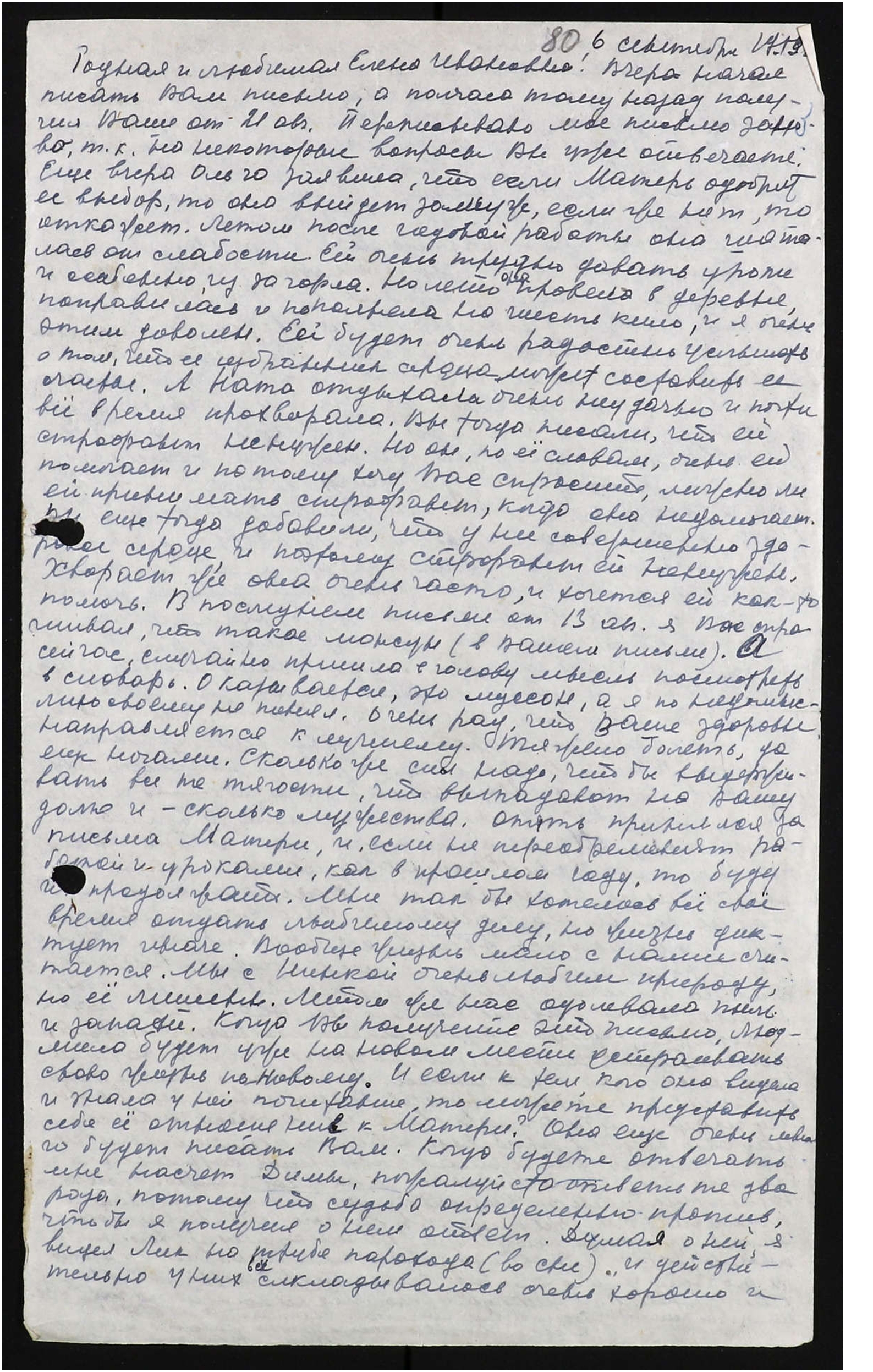 Родная и любимая Елена Ивановна! Вчера начал писать Вам письмо, а полчаса тому назад получил Ваше от 21 авг[уста]. Переписываю моё письмо заново, т.к. на некоторые вопросы Вы уже отвечаете. Еще вчера Ольга заявила, что если Матерь одобрит её выбор, то она выйдет замуж, если же нет, то откажет. Летом после годовой работы она шаталась от слабости. Ей очень трудно давать уроки и особенно из-за горла. Но лето она провела в деревне, поправилась и пополнела на шесть кило, и я очень этим доволен. Ей будет очень радостно услышать о том, что её избранник сердца может составить её счастье. А Ната отдыхала очень неудачно и почти всё время прохворала. Вы тогда писали, что ей строфант не нужен. Но он, по её словам, очень ей помогает и потому хочу Вас спросить, можно ли ей принимать строфант, когда она недомогает. Вы еще тогда добавили, что у неё совершенно здоровое сердце, и потому строфант ей не нужен. Хворает же она очень часто, и хочется ей как-то помочь. В последнем письме от 13 августа я Вас спрашивал, что такое монсун (в Вашем письме). А сейчас случайно пришла в голову мысль посмотреть в словарь. Оказывается, это муссон, а я по недомыслию своему не понял. Очень рад, что Ваше здоровье направляется к лучшему. Тяжело болеть, да ещё ночами. Сколько же сил надо, чтобы выдерживать все тягости, что выпадают на Вашу долю, и сколько мужества. Опять принялся за письма Матери, и если не переобременят работой и уроками, как в прошлом году, то буду их продолжать. Мне так бы хотелось всё своё время отдать любимому делу, но жизнь диктует иначе. Вообще жизнь мало с нами считается. Мы с Нинкой очень любим природу, но её лишены. Летом же нас одолевала пыль и запахи. Когда Вы получите это письмо, Людмила будет уже на новом месте устраивать свою жизнь по-новому. И если к тем, кого она видела и знала, у неё почитание, то можете представить себе её отношение к Матери? Она ещё очень много будет писать Вам. Когда будете отвечать мне насчет Димы, пожалуйста, ответьте два раза, потому что судьба определенно против, чтобы я получил о нём ответ. Думая о ней, я видел Лик на трубе парохода (во сне), и действительно у них всех складывалось очень хорошо и