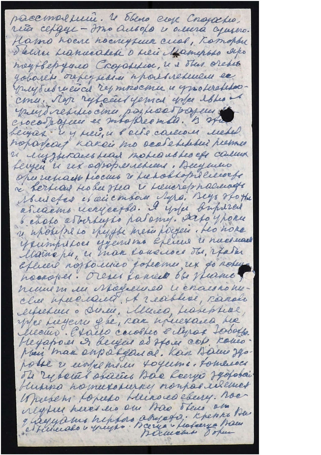 Родная и любимая Елена Ивановна. Время идёт, и мне почему-то кажется, что Ваш отъезд снова откладывается на некоторое время. Ведь вот уже чувствуется, что хотя и близко конец года, но встреча желанная еще далеко. Конечно, после слов В[еликого] Вл[адыки] успокоился, но видеть Вас всё же хочу с неменьшей силой. Ольга ходит под впечатлением того, что ей было Сказано о её суженом и под впечатлением Совета. Да и я тоже был немало удивлен, не мнением, нет, а тем, что ей был дан Совет. Видно она когда-то заслужила такое внимание и заботу. Не знаю, понимает ли она, что это значит. Ведь, даже Еке не было Сказано, ехать ей или не ехать, и она должна была выбирать сама. Выбрать то она выбрала, а вот правильно ли, в этом у меня уверенности нет. Помимо болезни мужа, кажется мне, что ей там не очень весело. Всё хочет знать, как мы, словно чует, что дело не в месте, а в самом человеке. И где же искать, как не в своем собственном сердце. Раз сердце средоточие организма, значит это всё, начало и конец всего. Не сердце ли бьется и пульсирует в атоме, и умирает ли оно когда-нибудь? И когда мозг останавливается перед глухой стеной, то не сердцем ли её можно преодолеть, сердцем, не знающим преград и